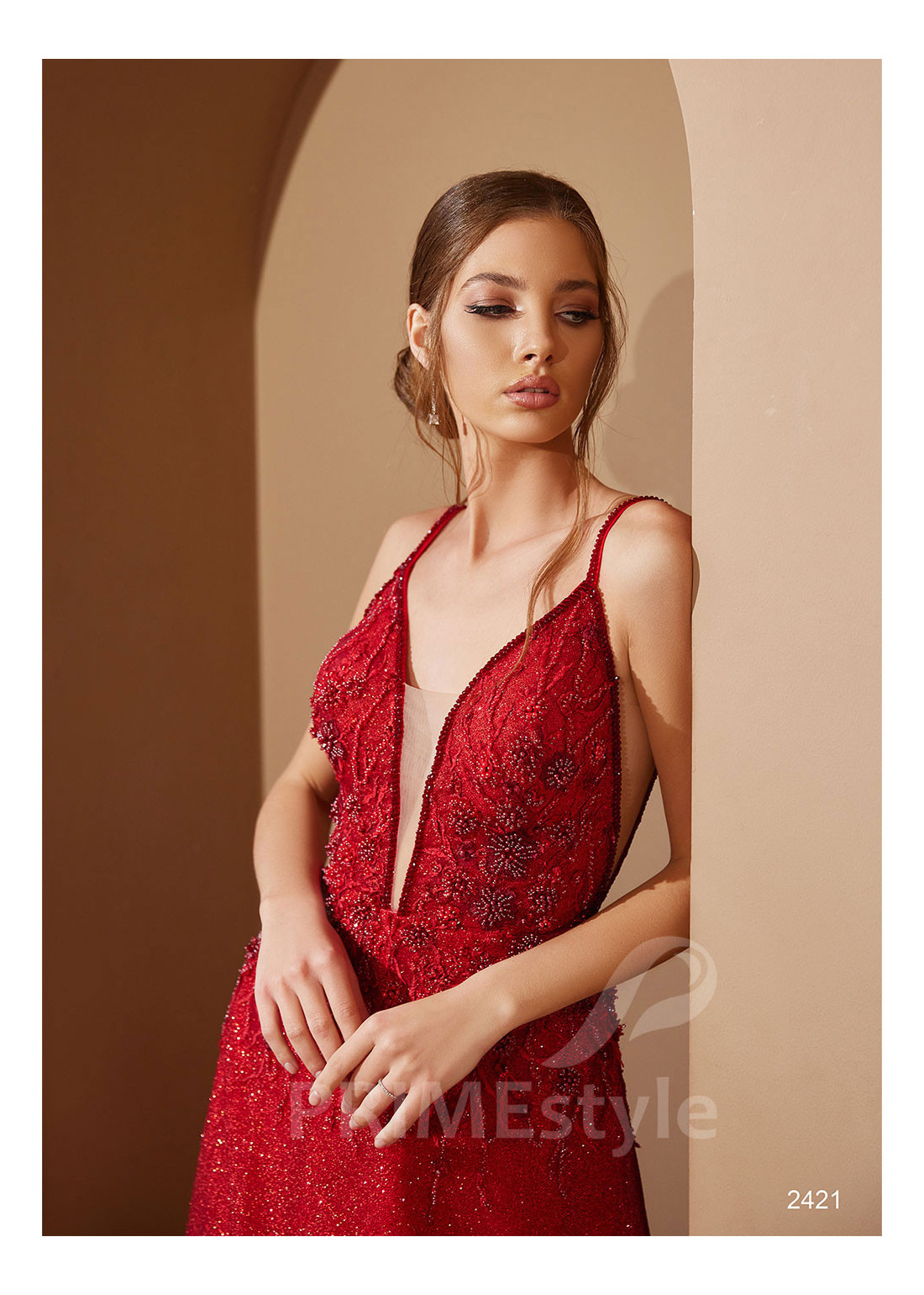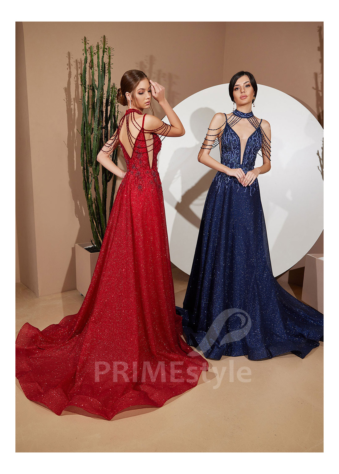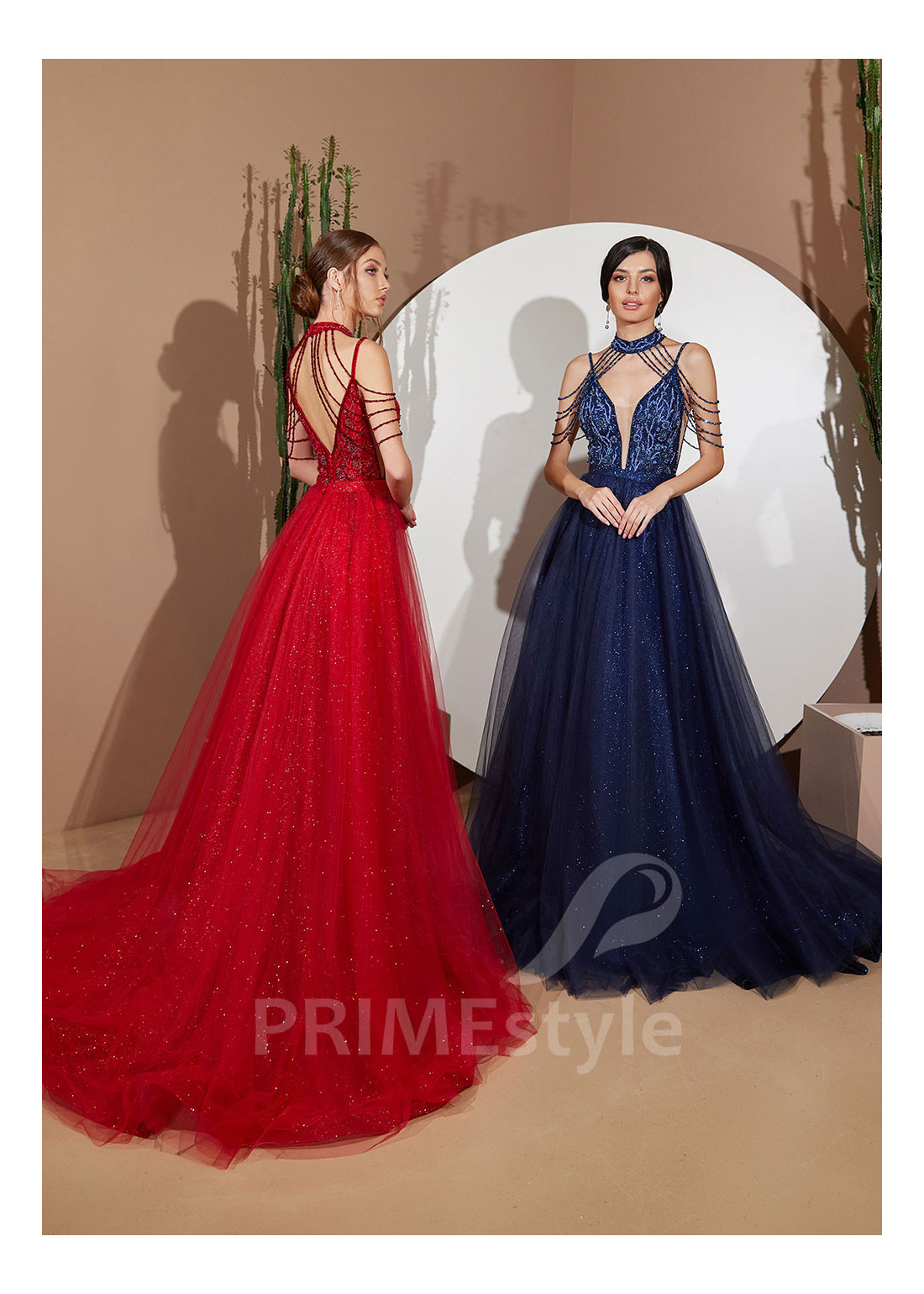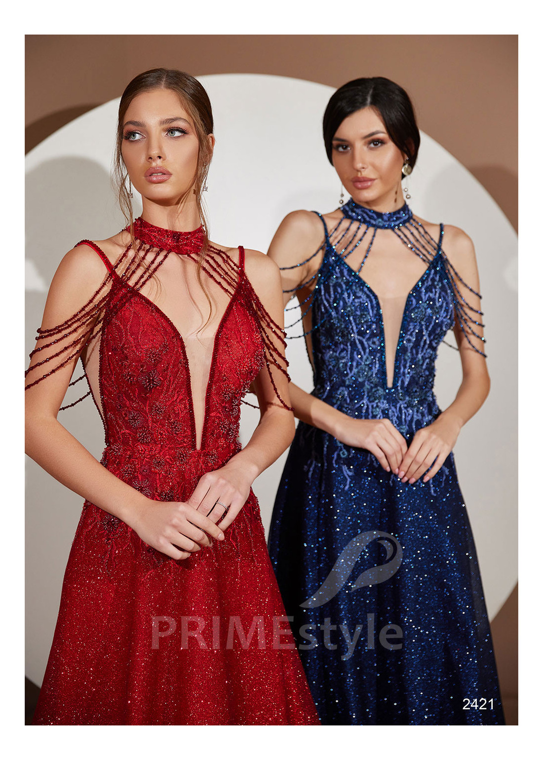 Slávnostné trblietavé spoločenské šaty s hlbokým V-výstrihom na hrudi, bohato zdobeným korzetom a ľahkou padavou tylovou sukňou. Vhodné ako šaty na ples a šaty na stužkovú.