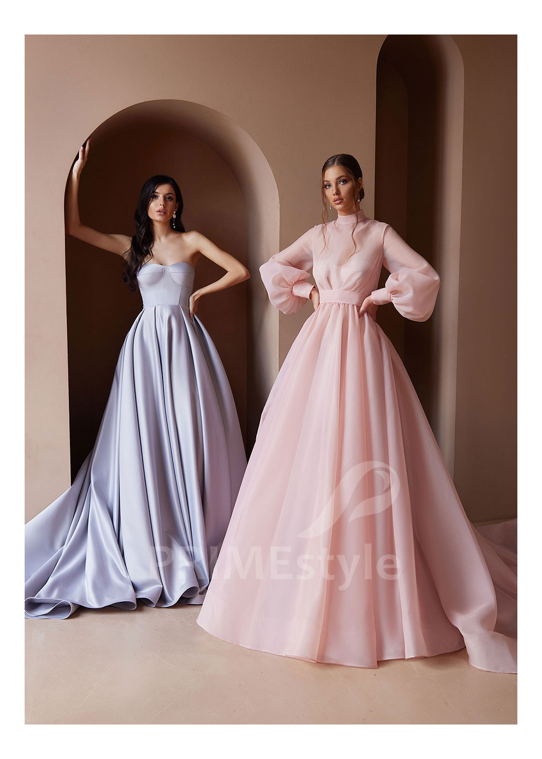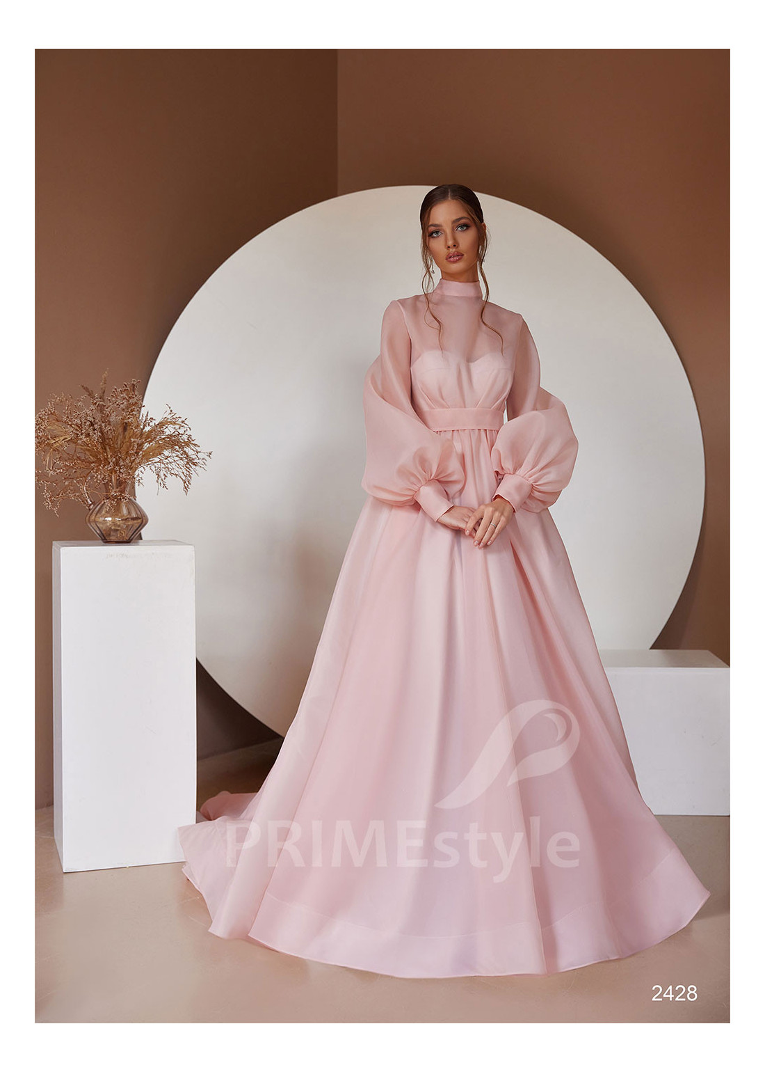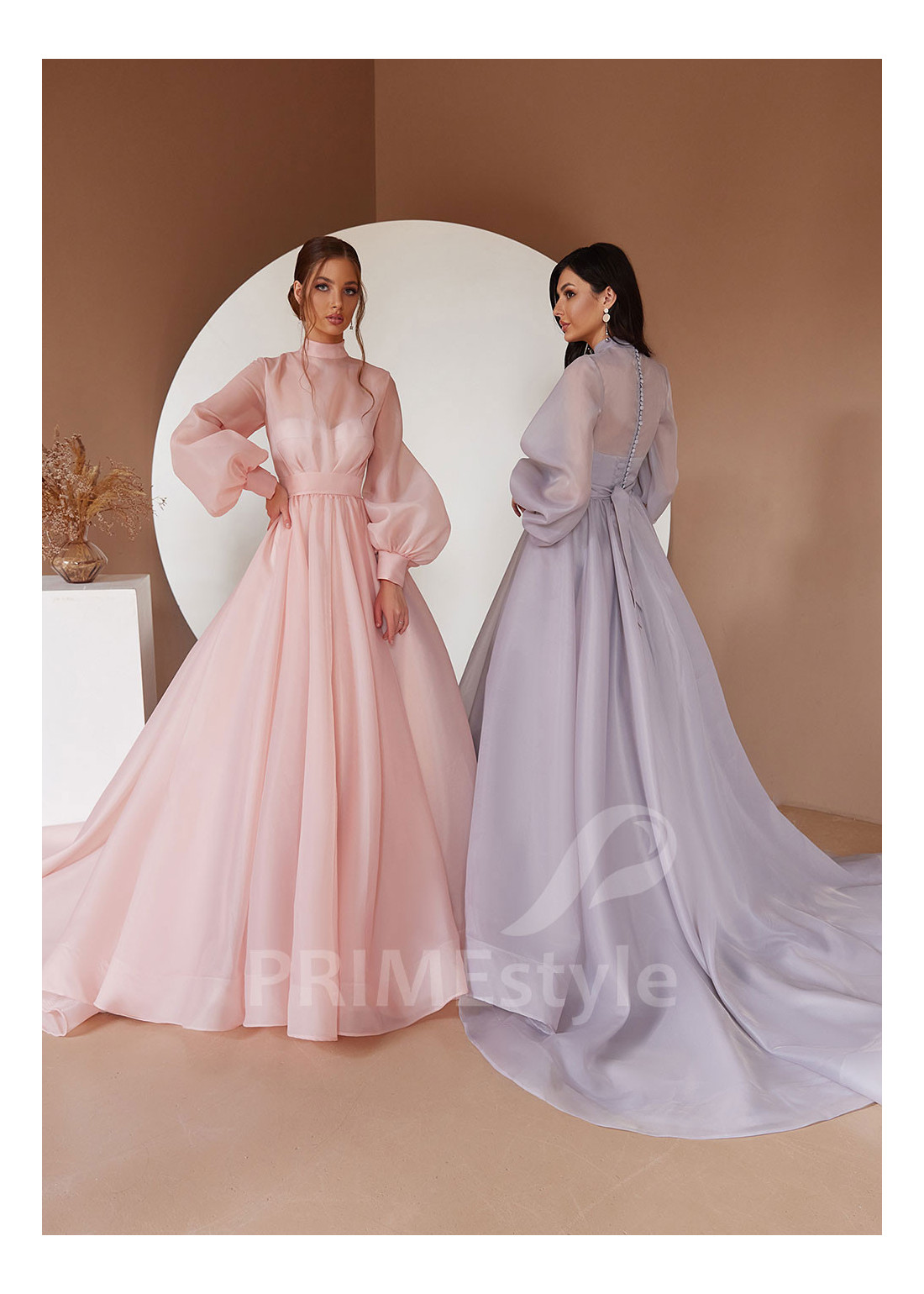 Moderné spoločenské šaty so zakrytým dekoltom po krk, zahaleným chrbtom a s objemnými balónovými rukávmi. Vhodné ako šaty na ples, šaty na stužkovú alebo šaty na svadbu.