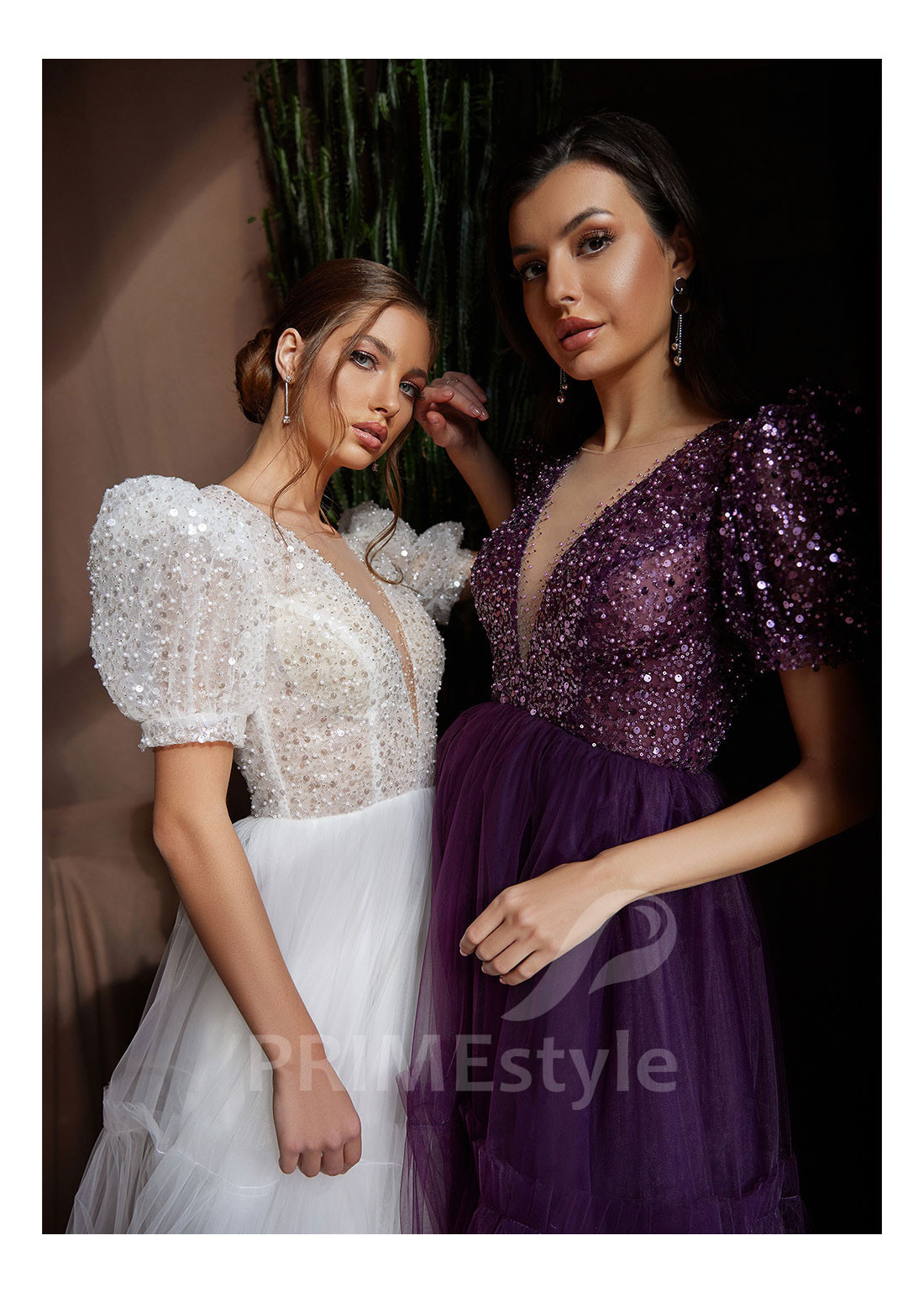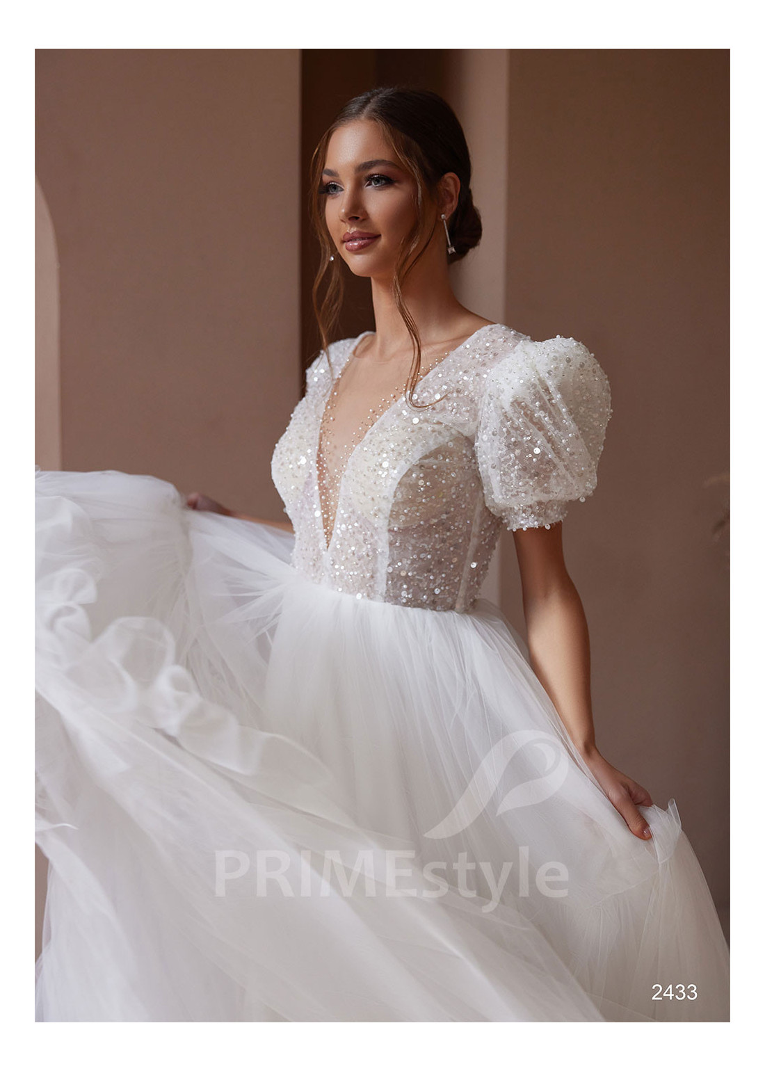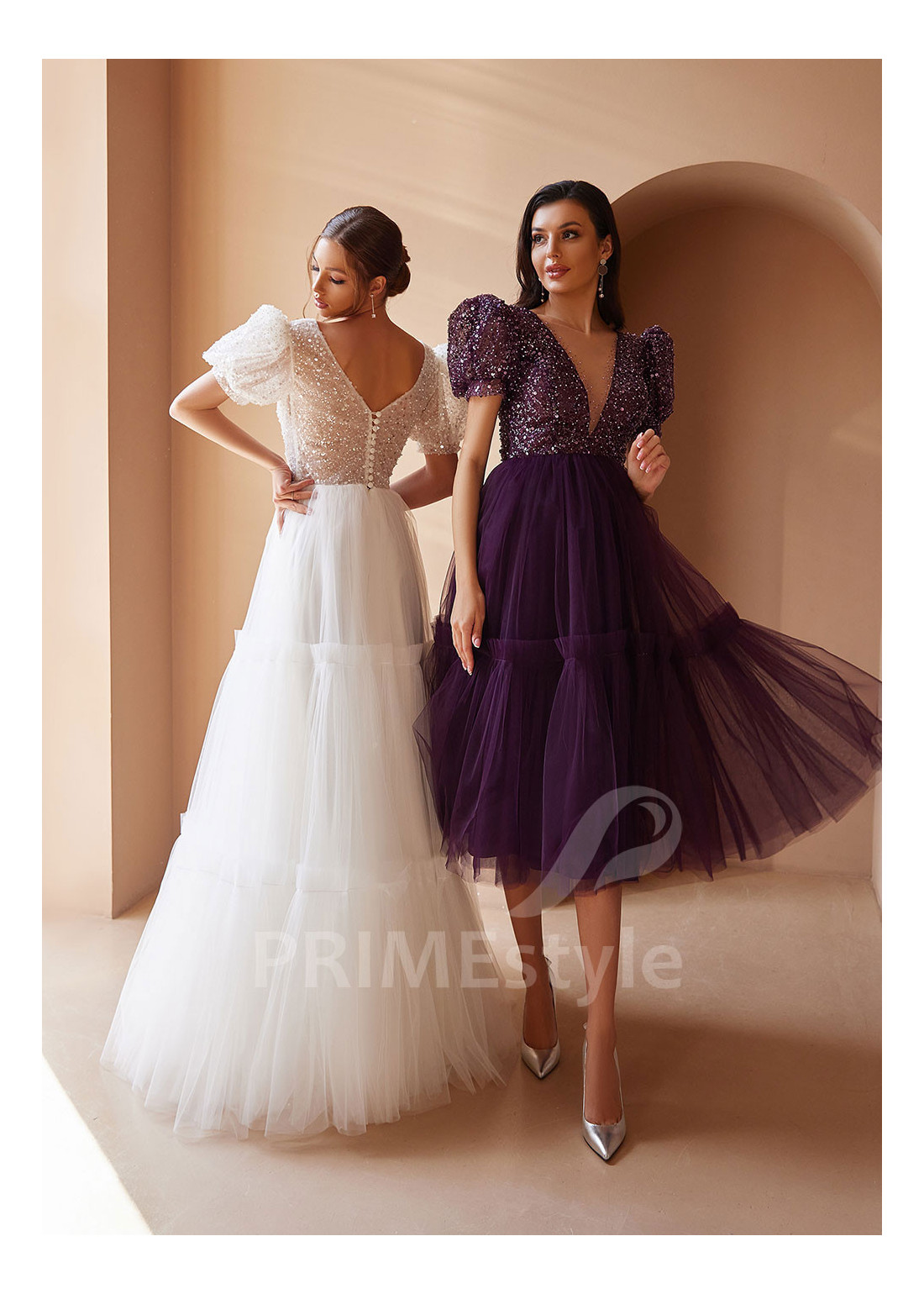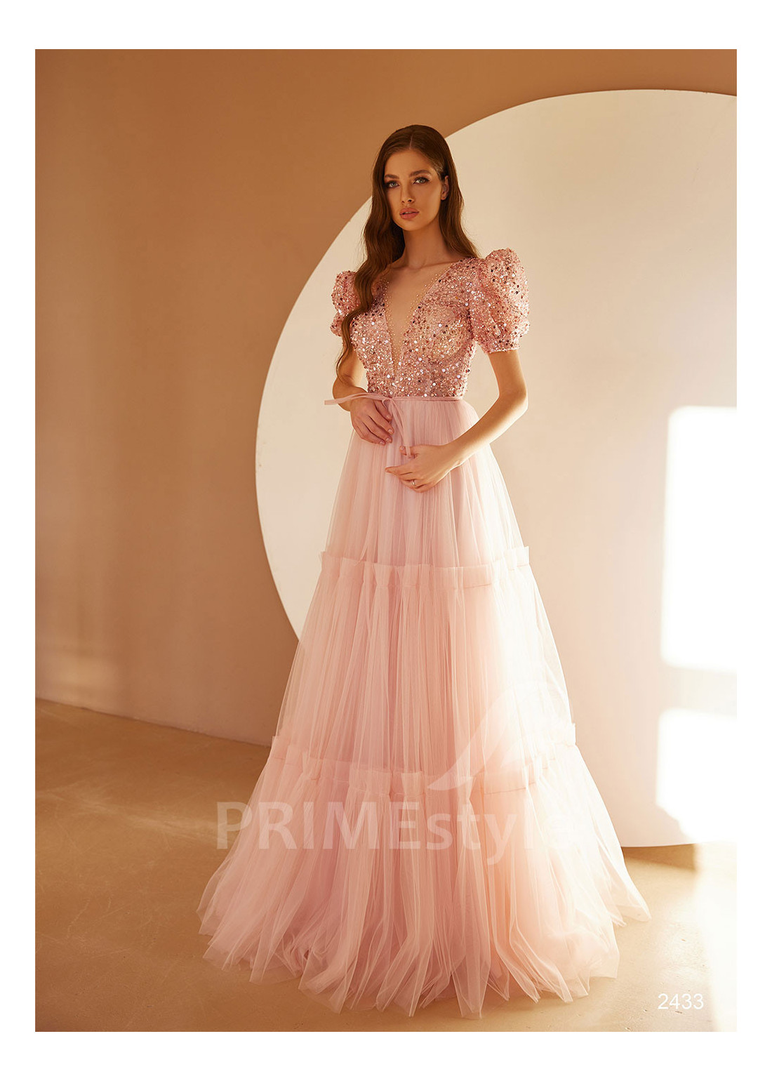 Tylové spoločenské midi šaty s hlbokým výstrihom na hrudi, trblietavým korzetom a ľahkou tylovou sukňou s volánmi. Možnosť ušitia buď s midi alebo maxi sukňou.