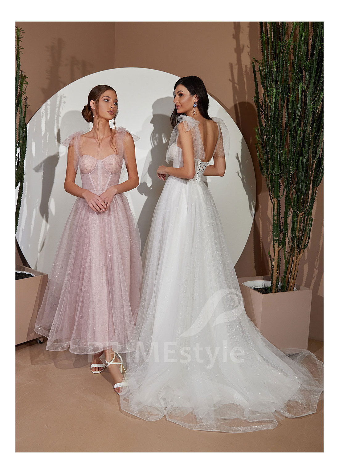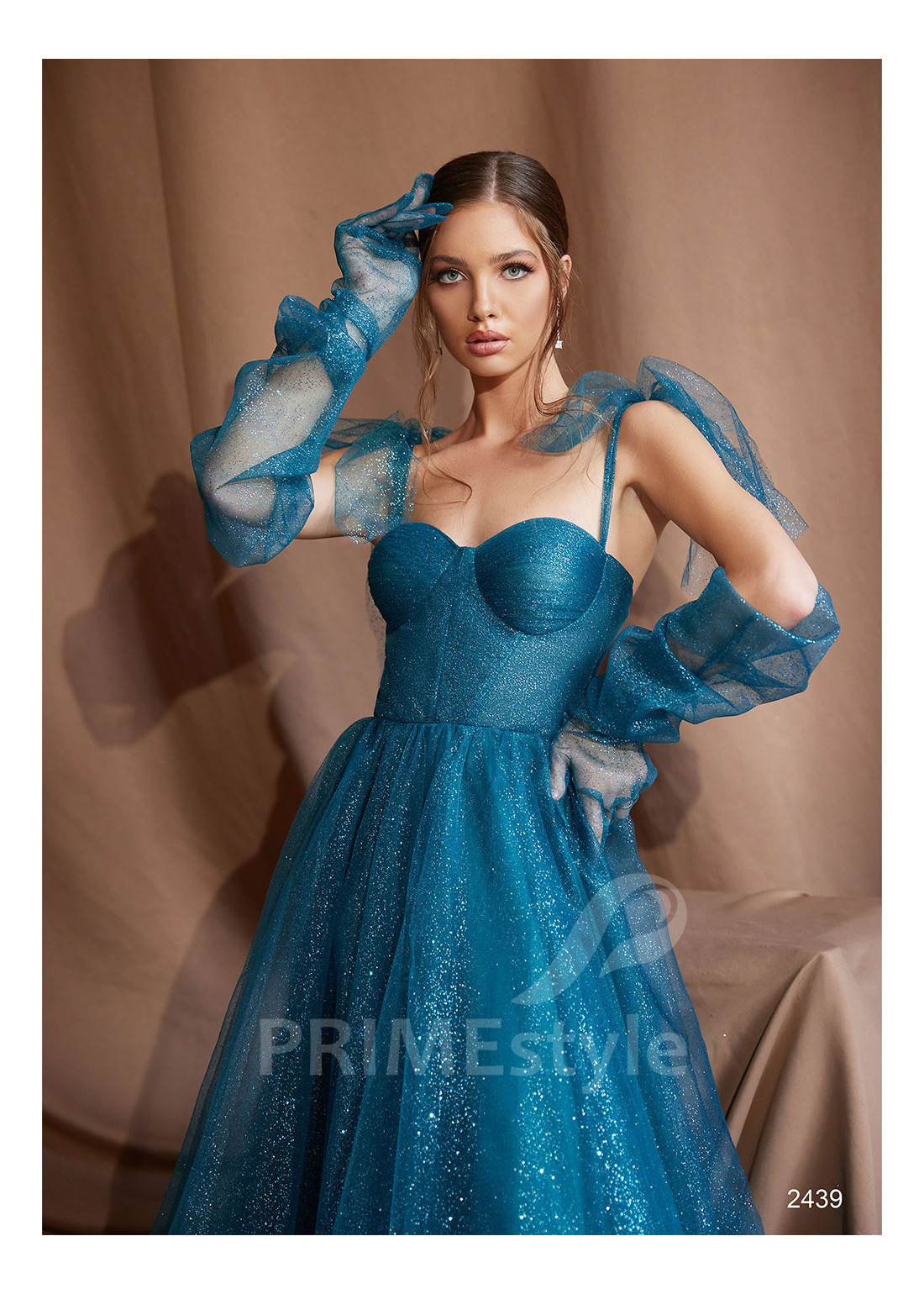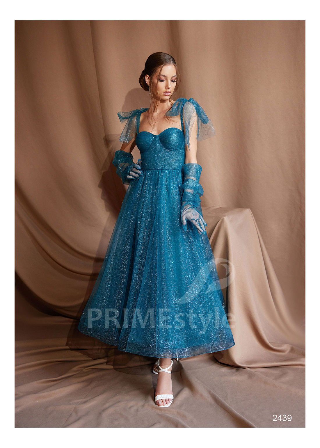 Slávnostné midi spoločenské šaty na ramienka s otvoreným dekoltom, odhaleným chrbtom a ľahkou trblietavou tylovou sukňou. Možnosť ušitia buď s midi alebo s maxi sukňou. Vhodné aj ako popolnočné šaty.