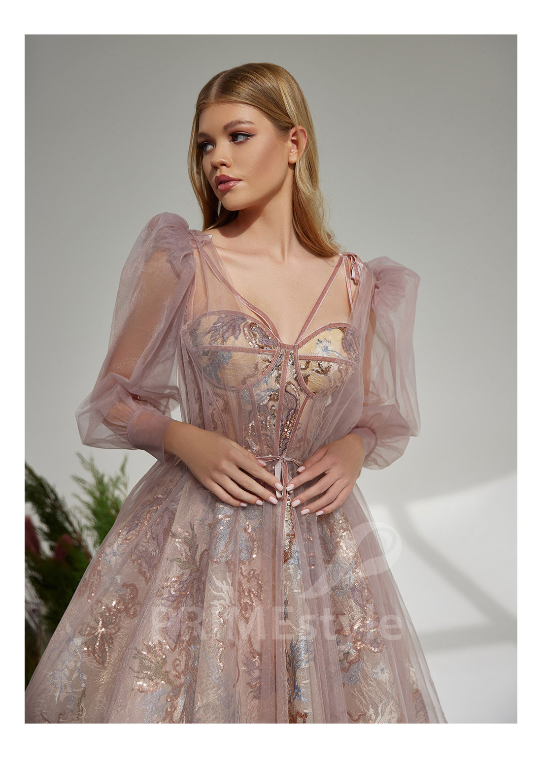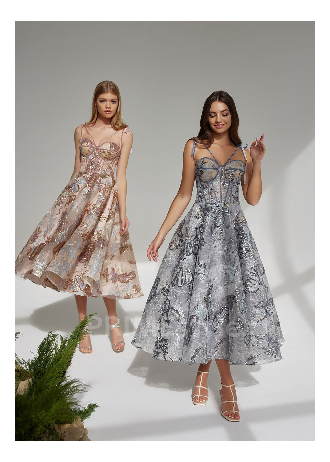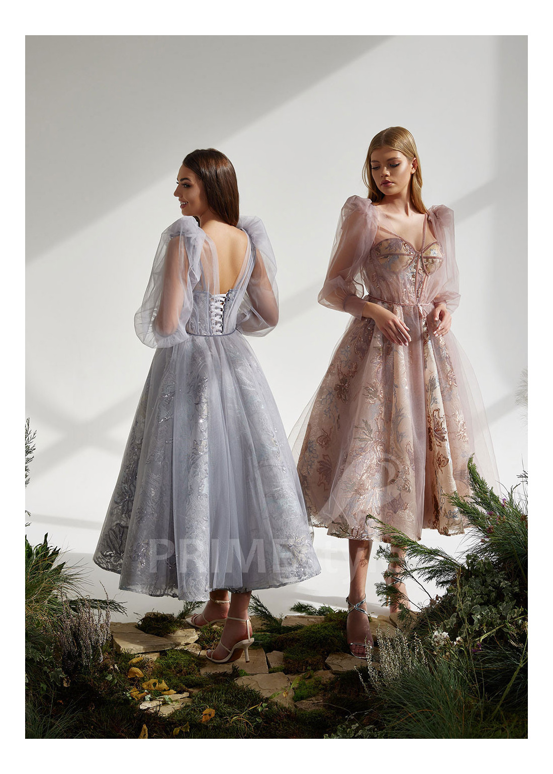Trendové dvojdielne spoločenské midi šaty na ramienka s objemným balónovým rukávom s manžetou. Korzet a sukňa sú zdobené bohatou lesklou čipkou. Možnosť ušitia s midi alebo maxi sukňou. Vhodné ako šaty na ples, šaty na stužkovú, popolnočné šaty alebo šaty pre svadobné mamy.