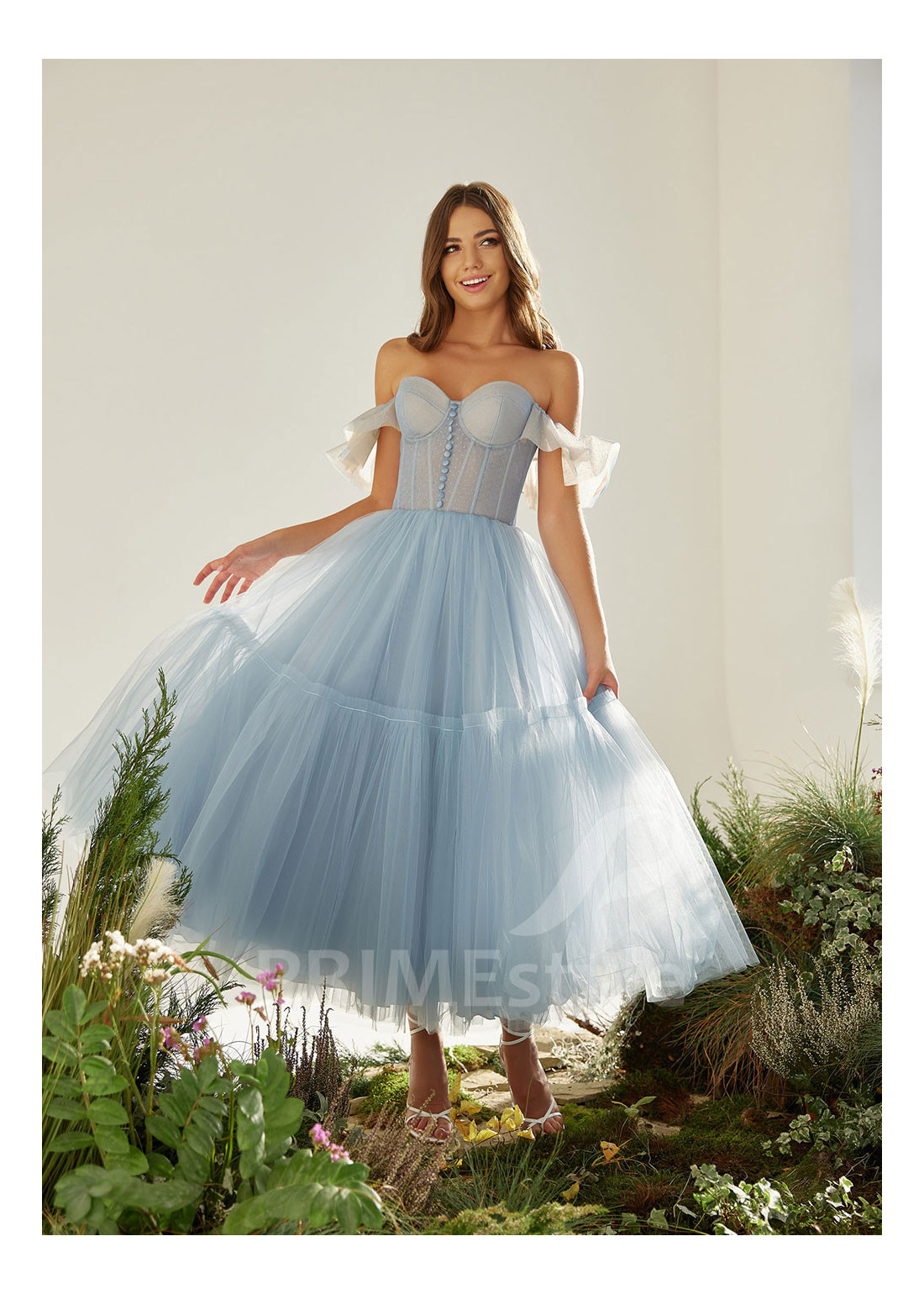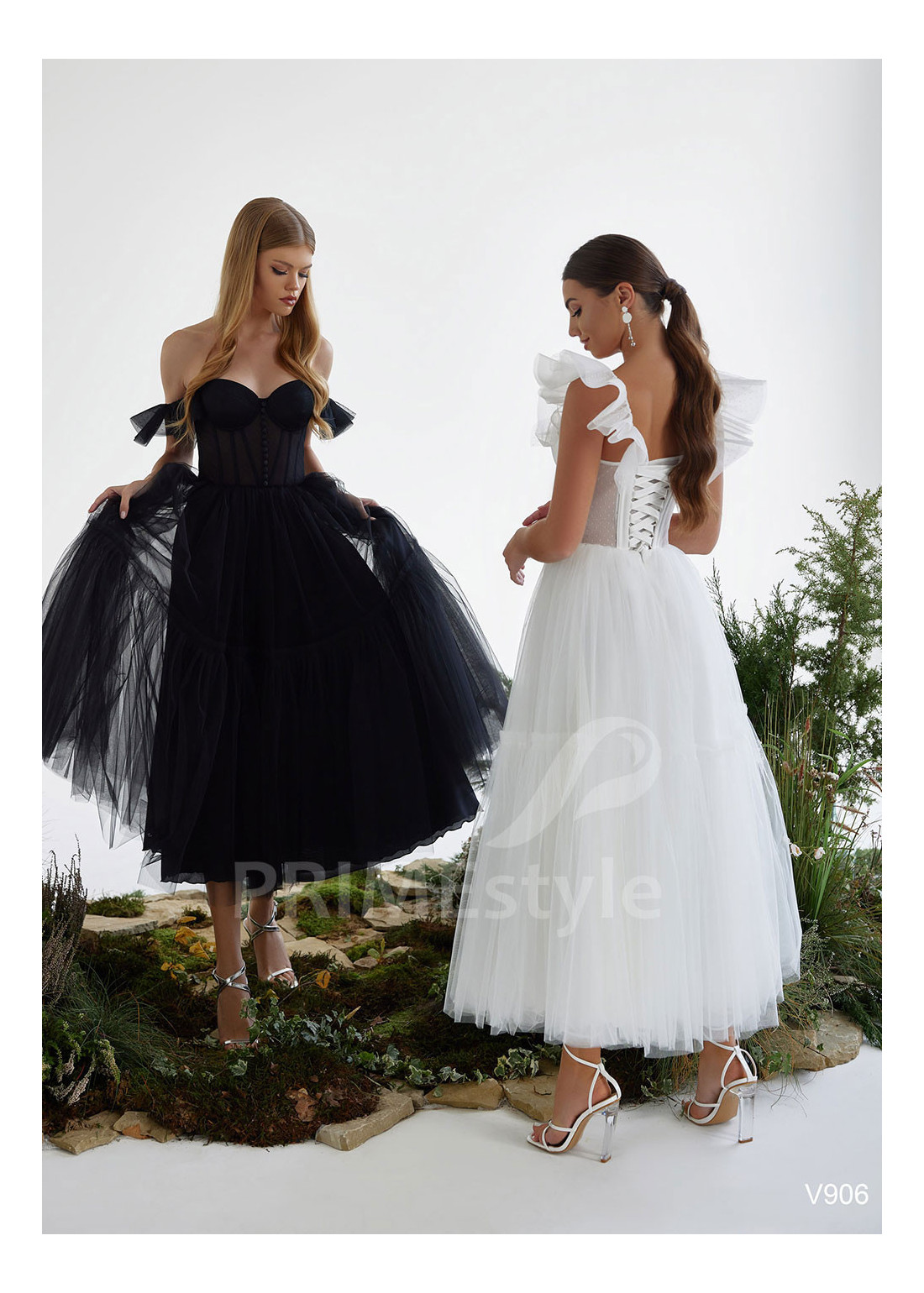 Spoločenské midi šaty s trendovým srdiečkovým výstrihom na hrudi, padnutými ramienkami a ľahkou tylovou sukňou s volánom na spodnom okraji. Možnosť ušitia s midi alebo maxi sukňou. Vhodné ako šaty na stužkovú, šaty na svadbu, popolnočné šaty alebo šaty pre svadobné mamy.