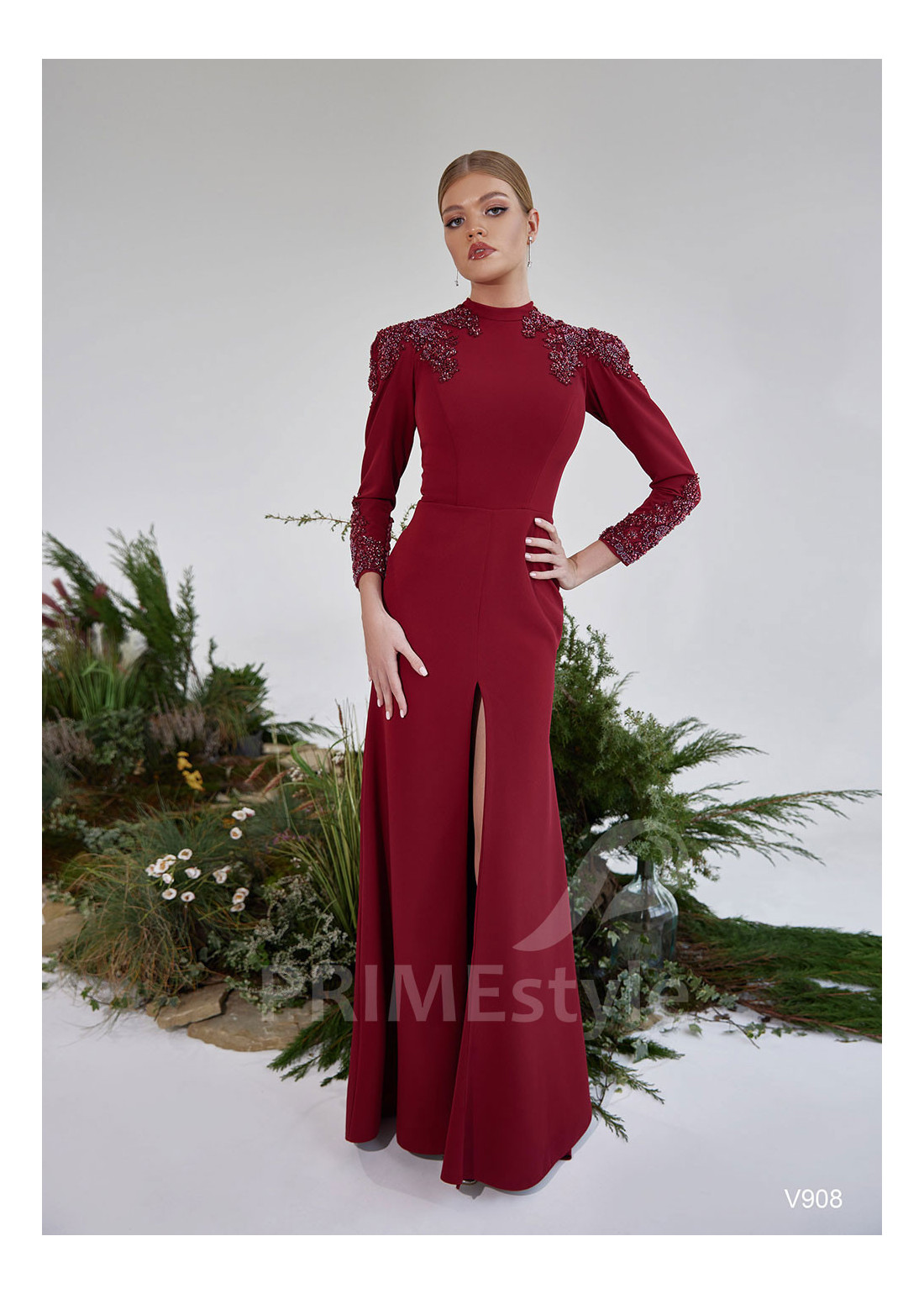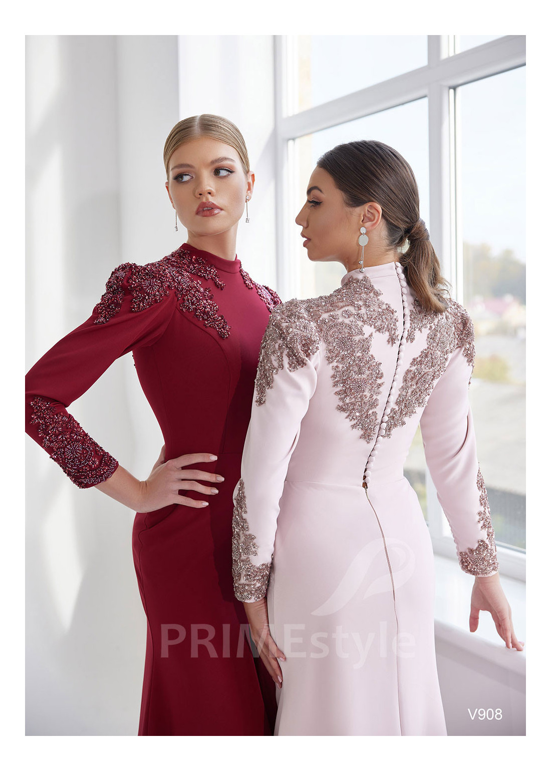Elegantné úzke spoločenské šaty s dlhým rukávom, zakrytým dekoltom až po krk a zahaleným chrbtom. Korzet a rukávy sú zdobené rozkošnou vyšívanou čipkou. Vhodné ako šaty na ples, šaty na stužkovú, šaty na svadbu, popolnočné šaty alebo šaty pre svadobné mamy.