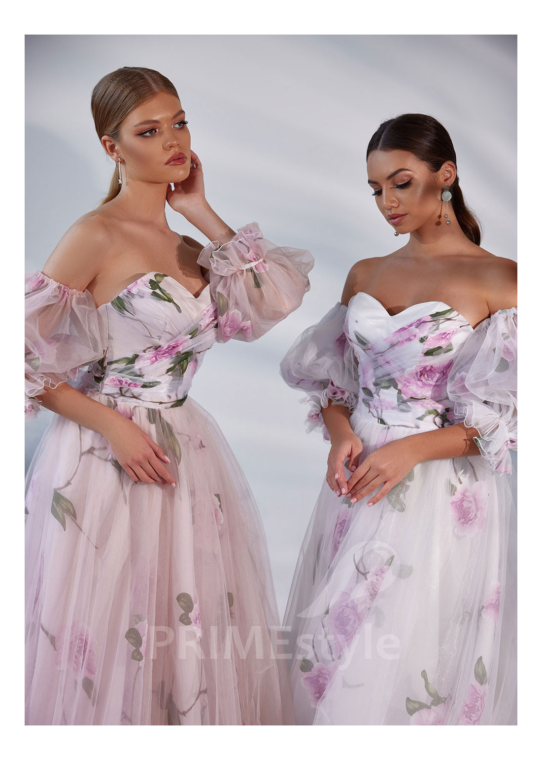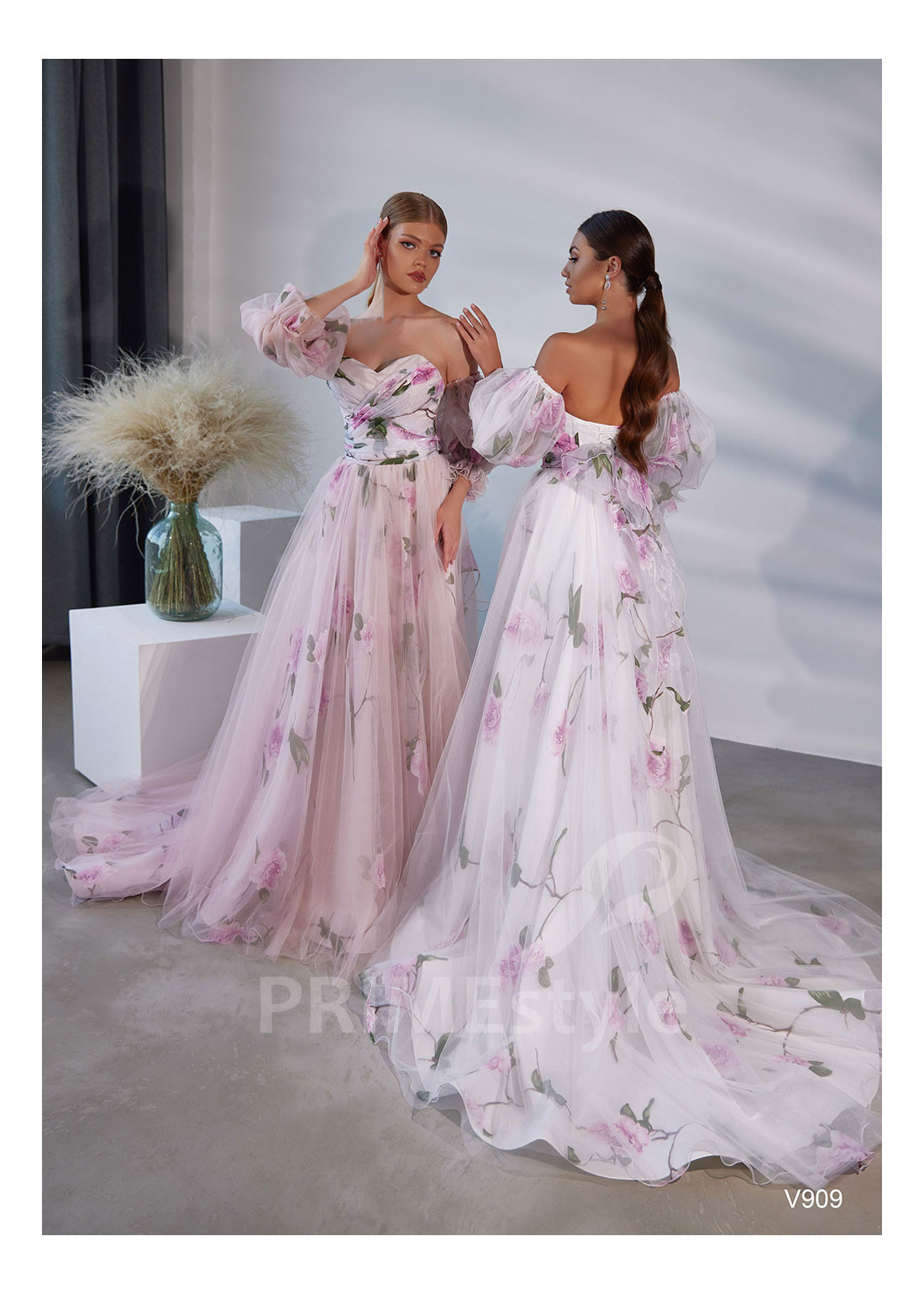 Slávnostné spoločenské šaty s otvoreným dekoltom, srdiečkovým výstrihom na hrudi, samostatnými balónovými rukávmi a objemnou padavou sukňou. Vhodné aj ako šaty na ples, šaty na stužkovú a šaty pre svadobné mamy.