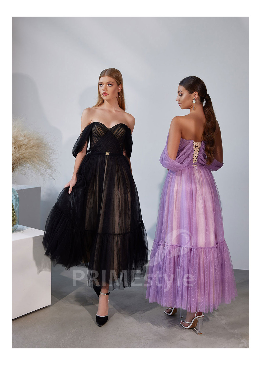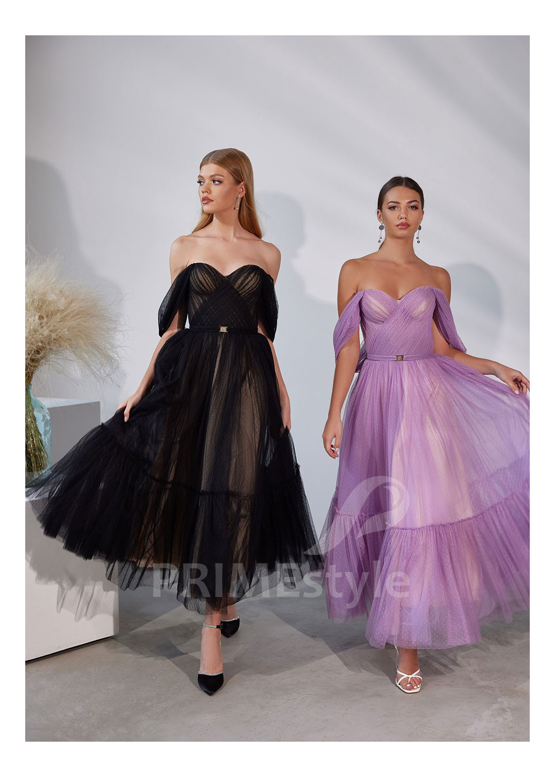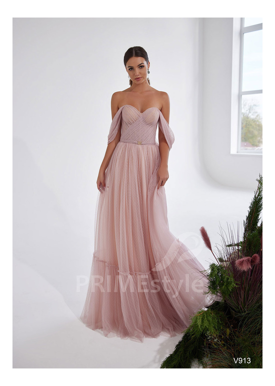 Slávnostné spoločenské šaty s otvoreným dekoltom, odhaleným chrbtom a padnutými ramienkami. Padavá tylová sukňa je ukončená rozkošným tylovým volánom. Možnosť ušitia s midi alebo maxi sukňou. Vhodné aj ako šaty na ples, šaty na stužkovú, šaty na svadbu a šaty pre svadobné mamy.