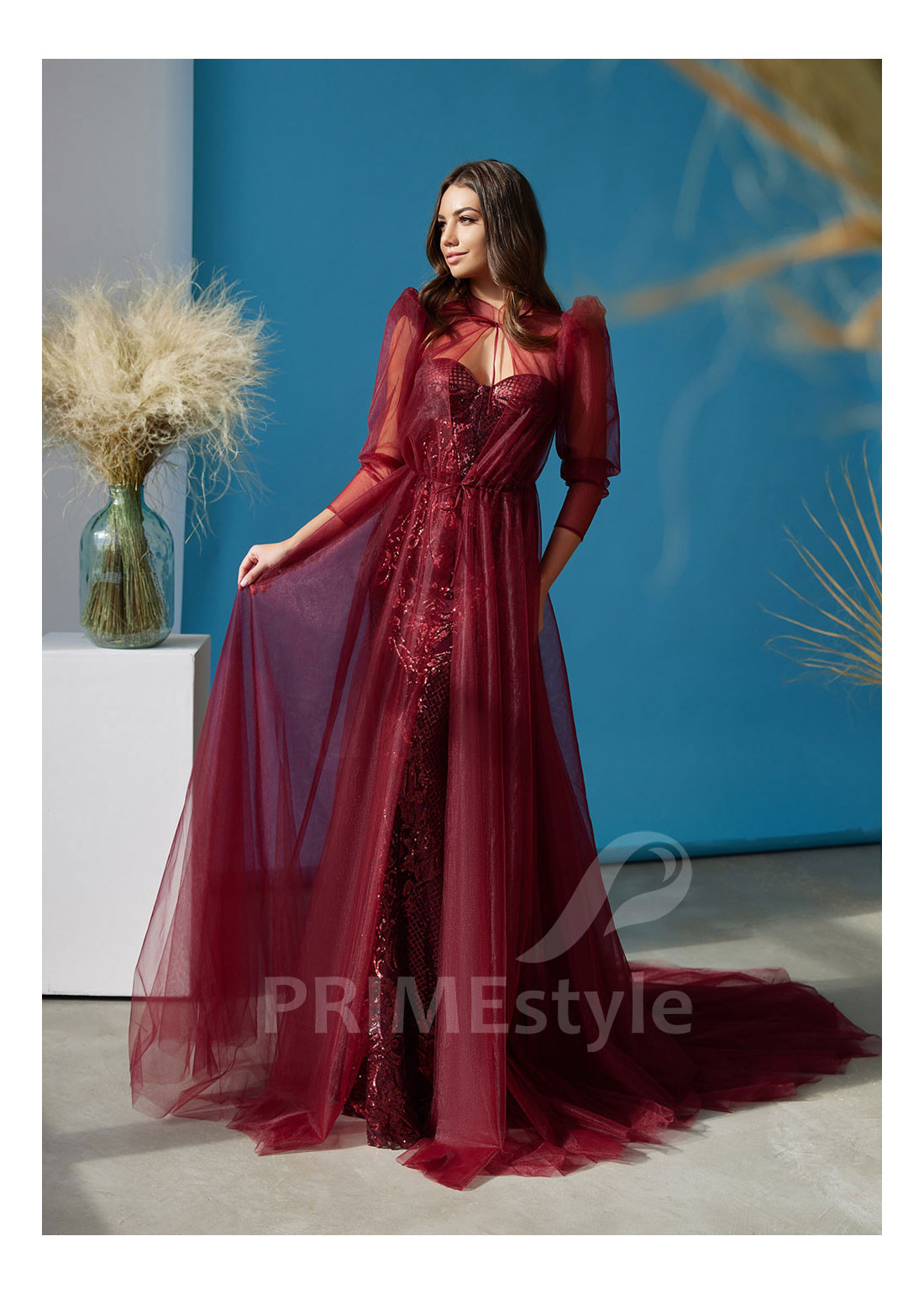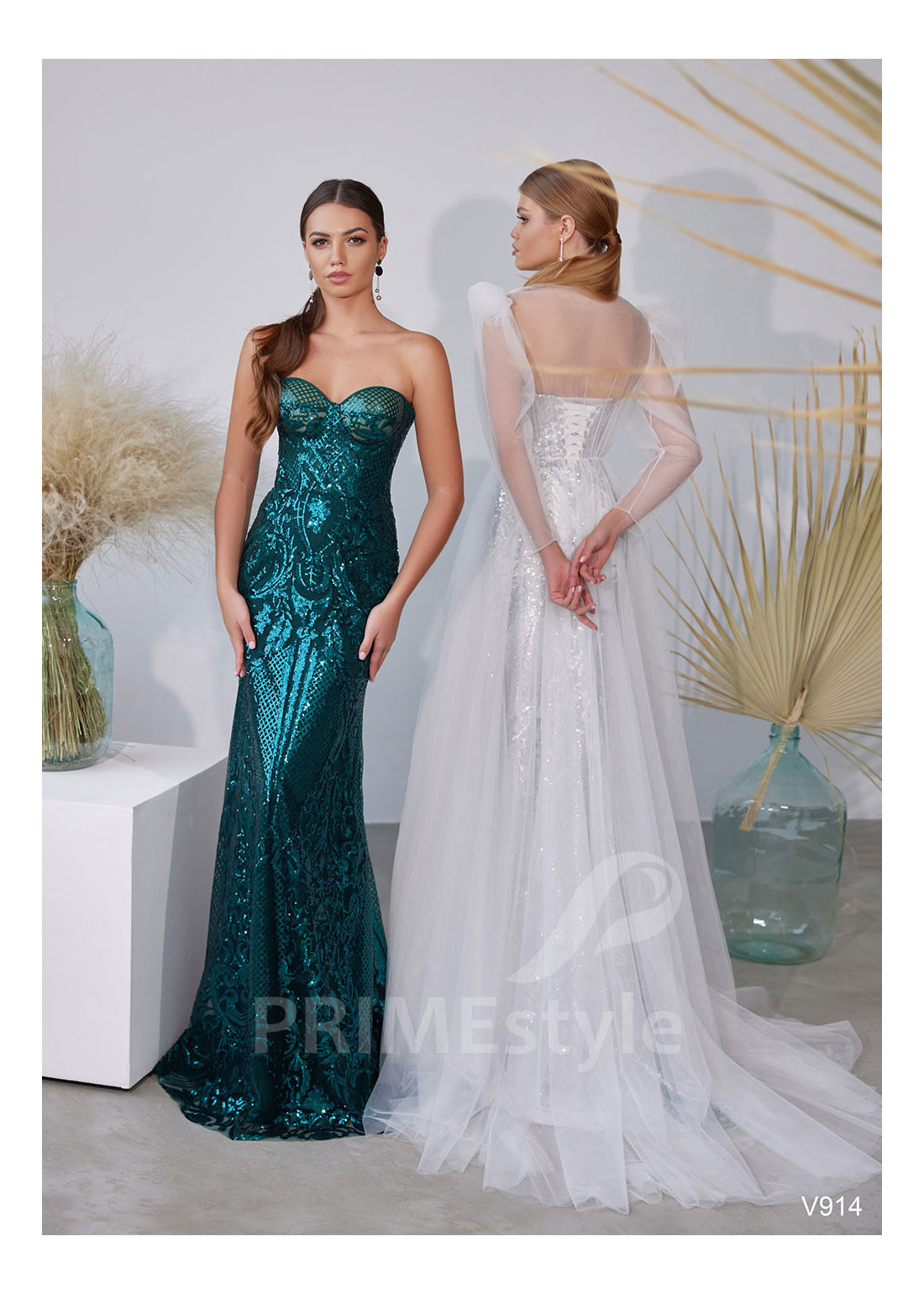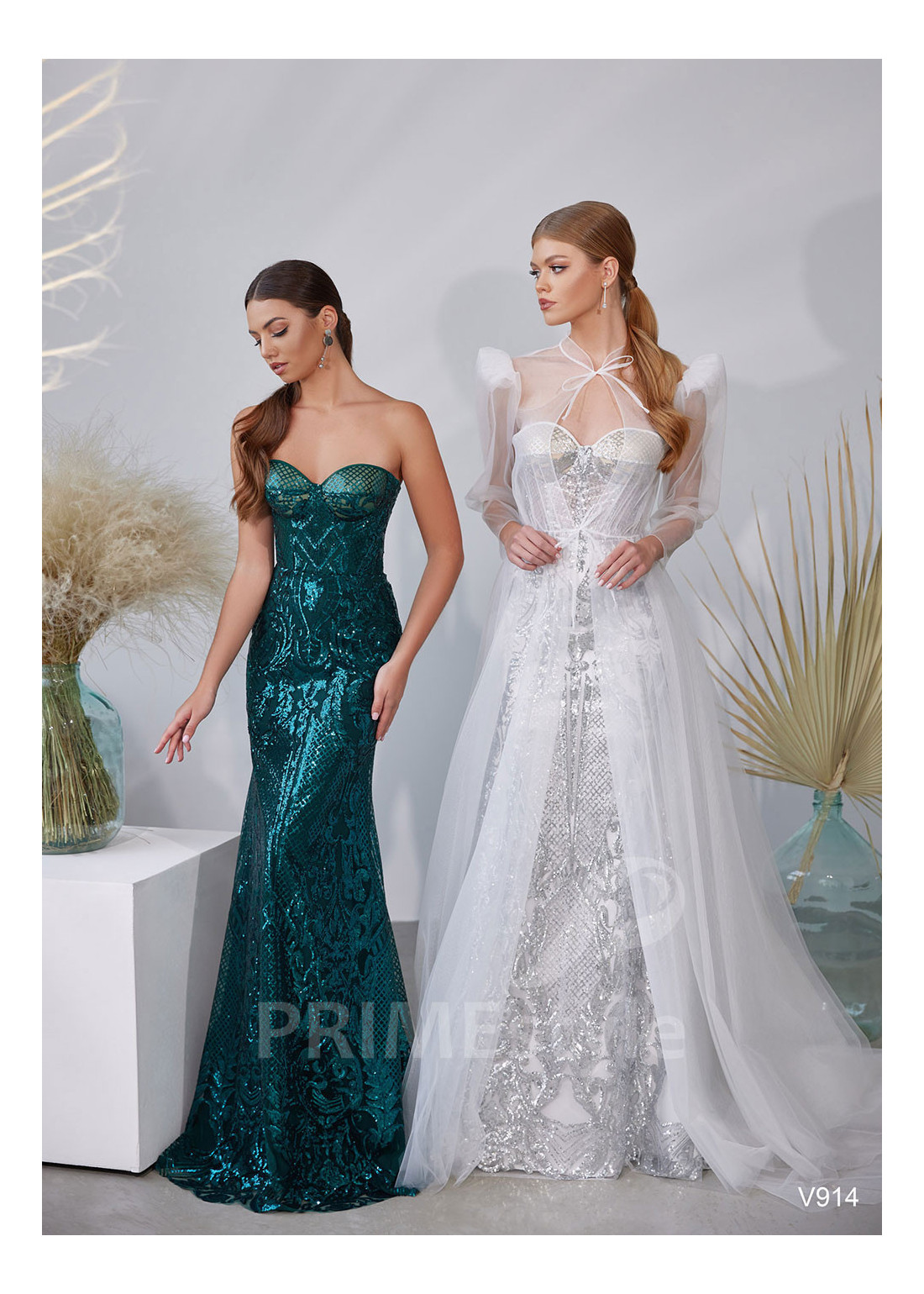 Dlhé luxusné dvojdielne spoločenské šaty úzkeho strihu s otvoreným dekoltom a s trendovým srdiečkovým výstrihom na hrudi. Celé šaty sú zdobené bohatou trblietavou čipkou. Súčasťou šiat je aj vzdušný tylový prehoz s objemnými balónovými rukávmi. Vhodné aj ako šaty na ples, šaty na stužkovú a popolnočné šaty.