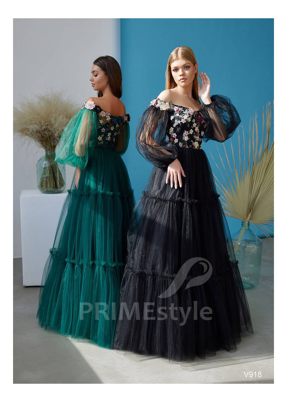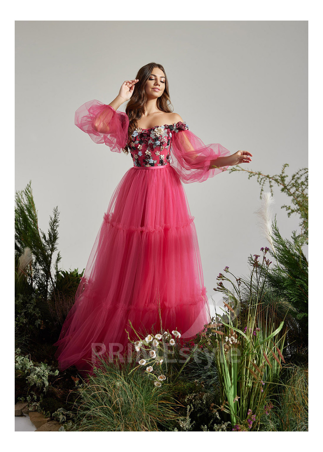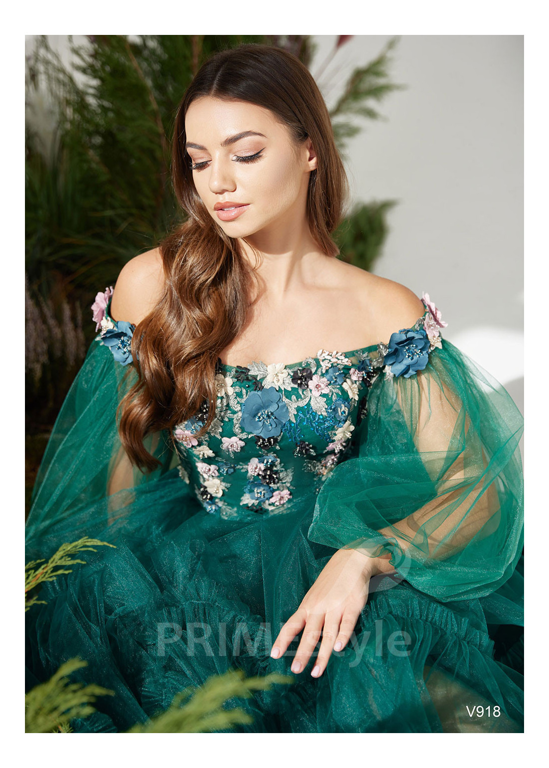 Romantické spoločenské šaty s odhalenými ramenami, objemnými balónovými rukávmi a s korzetom husto zdobeným čipkou a 3D kvetmi. Ľahká tylová sukňa je dekorovaná rozkošnými volánmi. Vhodné aj ako šaty na ples, šaty na stužkovú a šaty pre svadobné mamy.