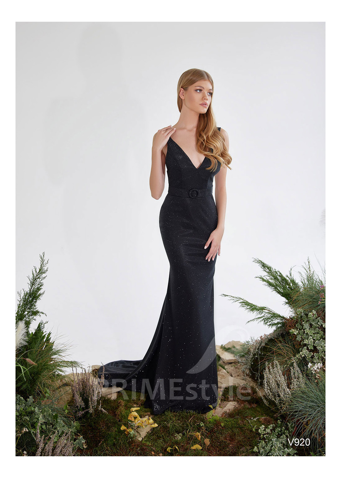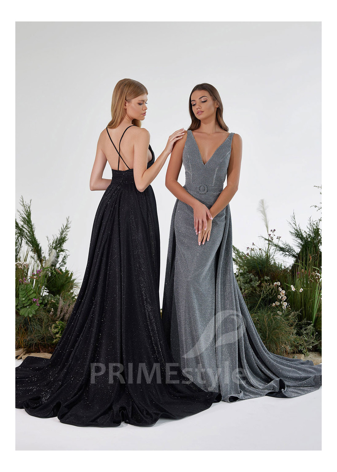 Moderné úzke spoločenské šaty, vyhotovené z efektnej trblietavej látky. S výstrihom do V-čka, odhaleným chrbtom a so šarmantnou odpojiteľnou vlečkou. Vhodné aj ako šaty na stužkovú a šaty pre svadobné mamy.