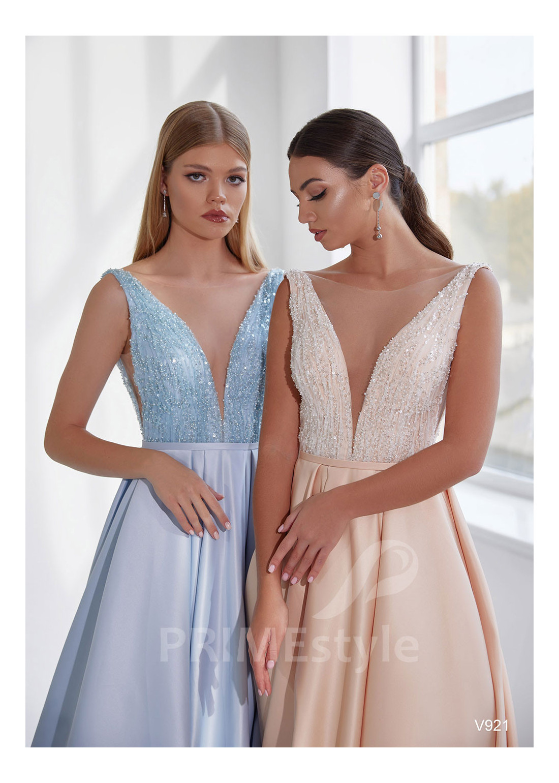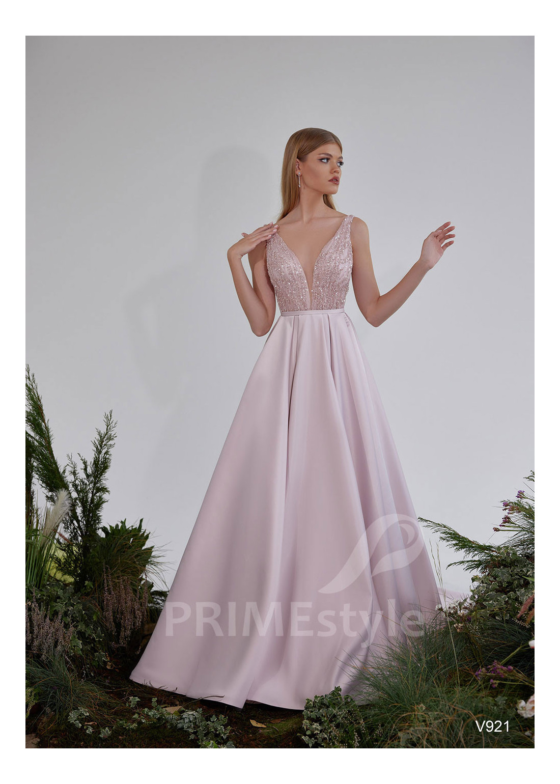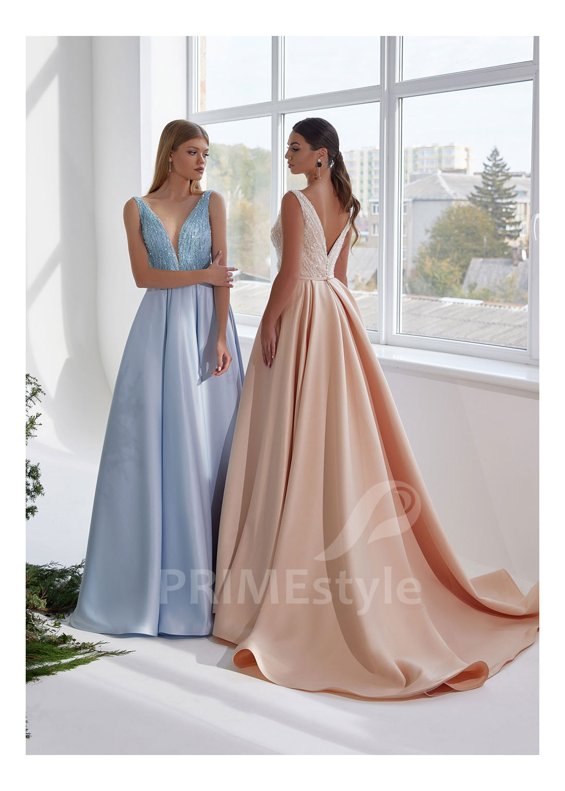 Elegantné spoločenské šaty s bohato zdobeným korzetom, otvoreným dekoltom, výstrihom do V-čka a s padavou saténovou sukňou. Vhodné ako šaty na ples, šaty na svadbu a popolnočné šaty.