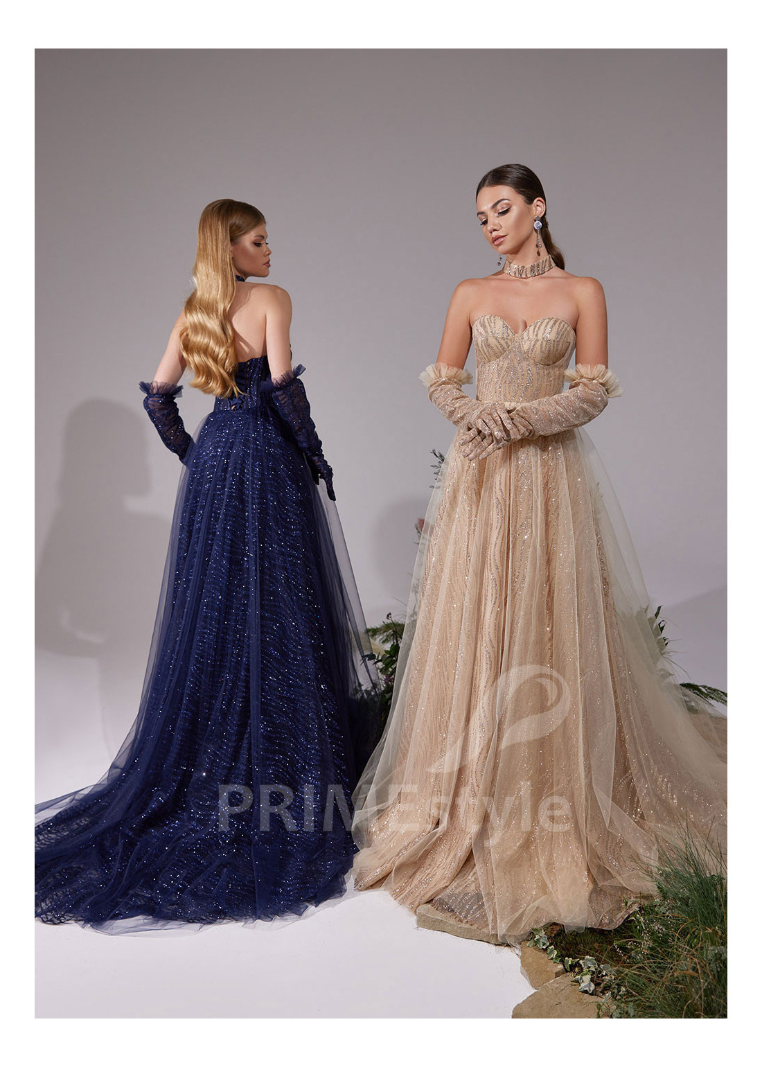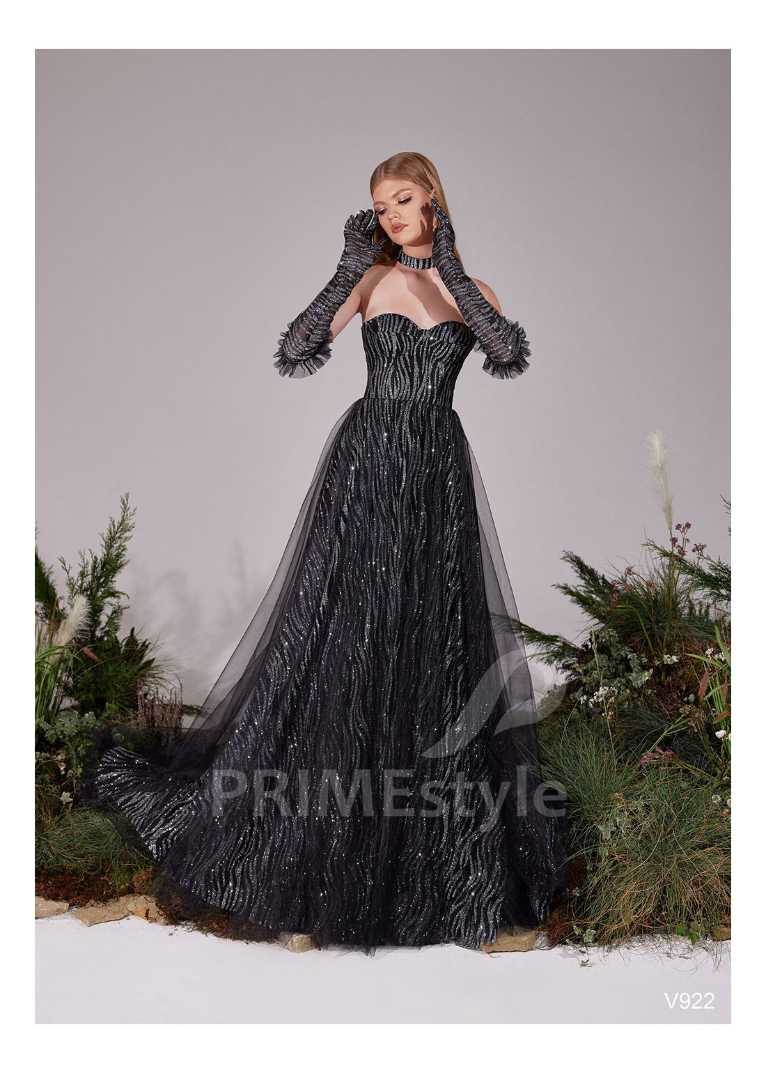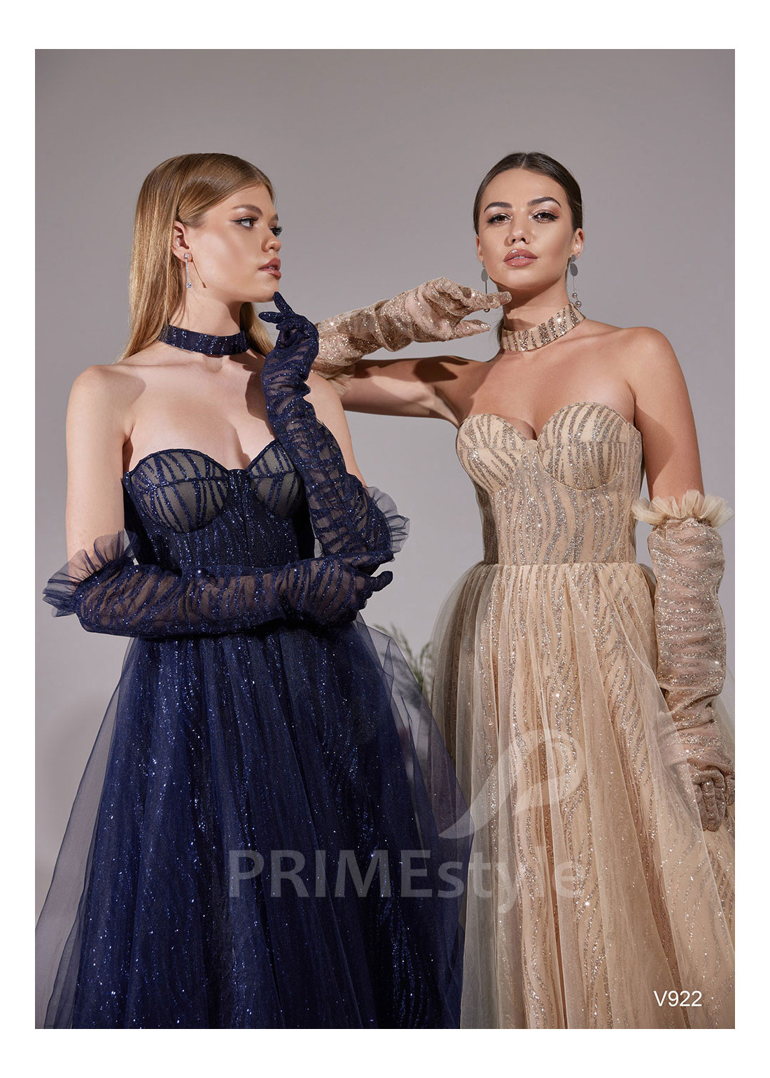 Slávnostné spoločenské šaty s otvoreným dekoltom, trendovým V-výstrihom na hrudi, odhaleným chrbtom a so samostatnými zaujímavo tvarovanými rukavičkami. Vhodné aj ako šaty na stužkovú a šaty na svadbu.
