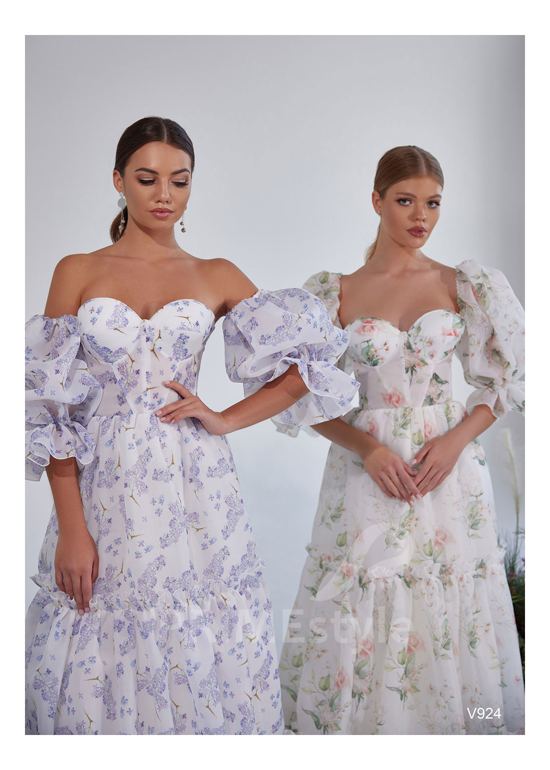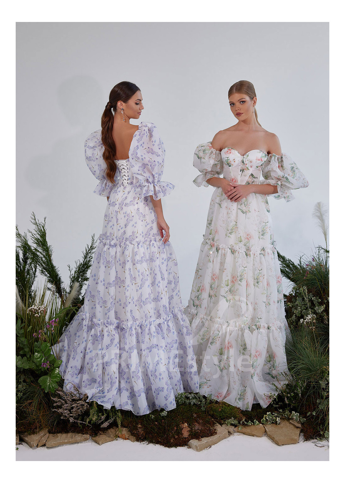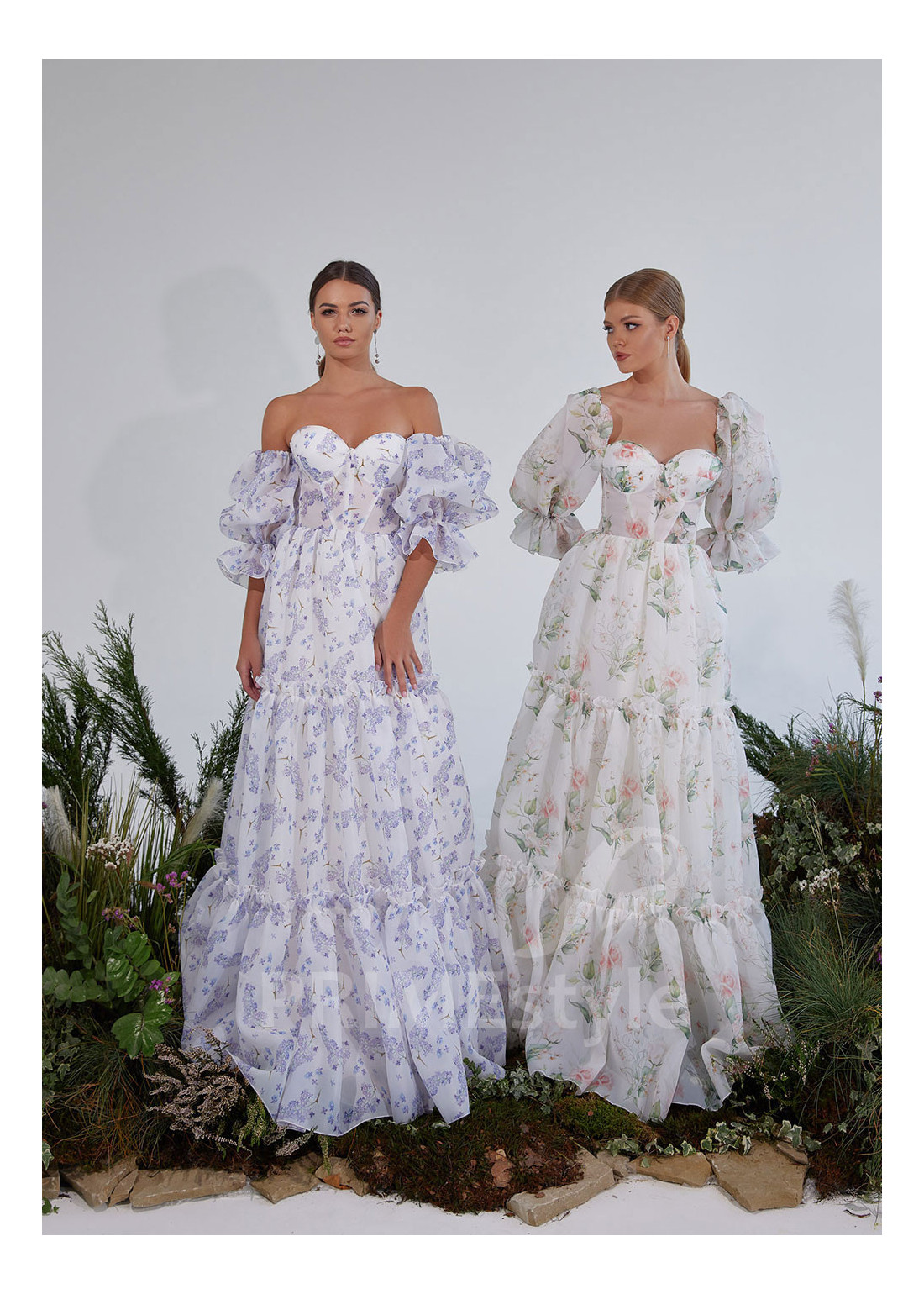 Slávnostné spoločenské šaty s otvoreným dekoltom, trendovým srdiečkovým výstrihom na hrudi, objemnými balónovými rukávmi a efektnou vrstvenou sukňou. Vhodné aj ako šaty na ples, šaty na stužkovú a šaty pre svadobné mamy.