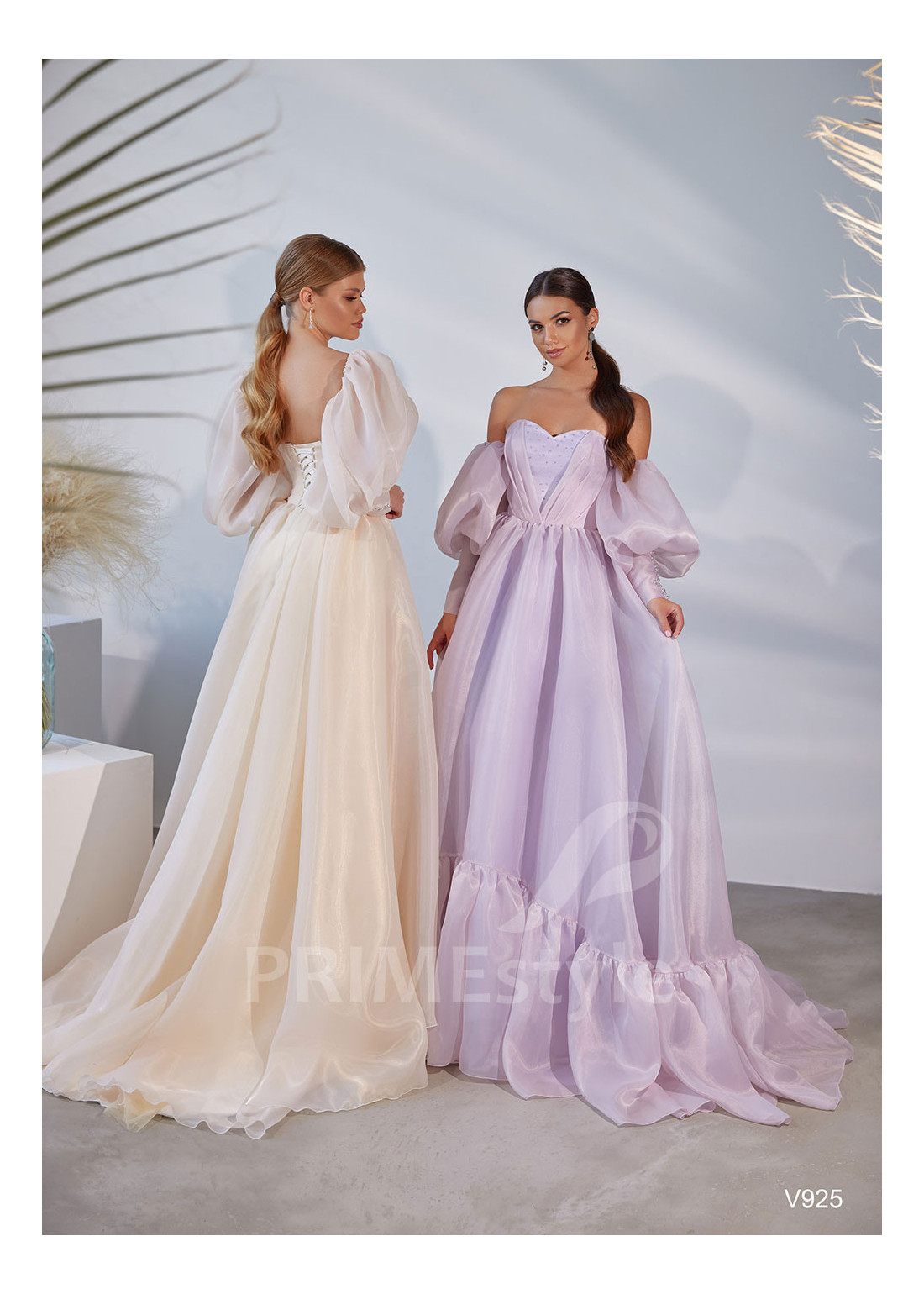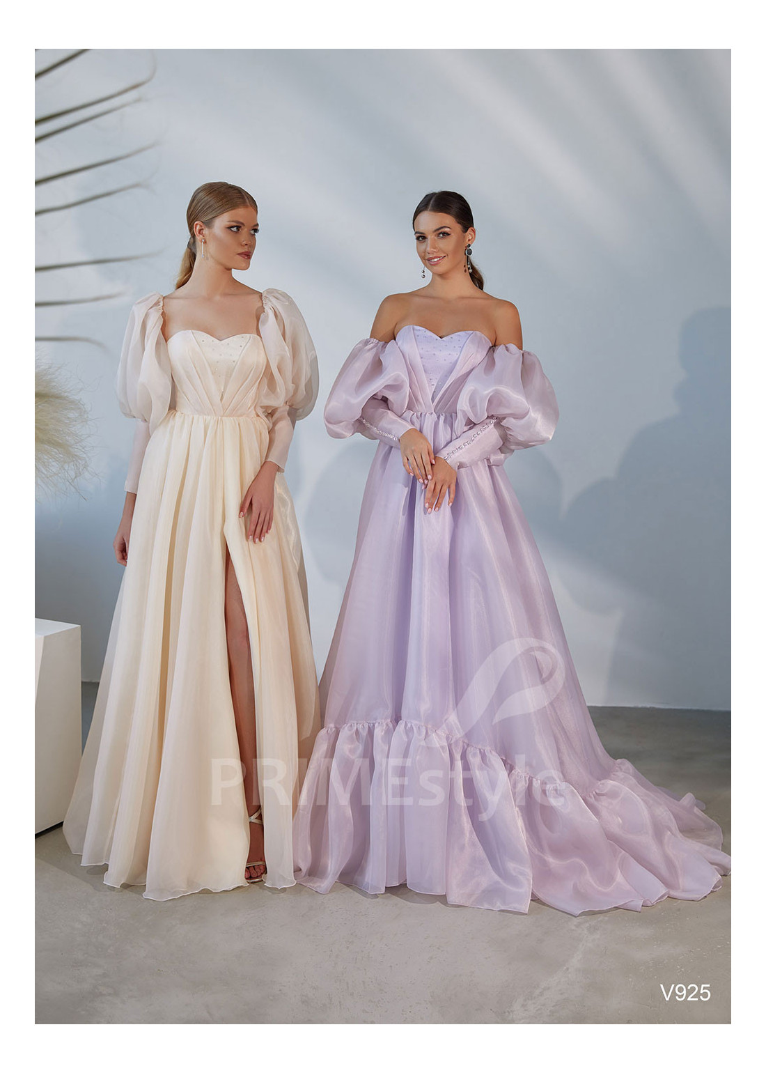 Vkusné spoločenské šaty s otvoreným dekoltom, trendovým srdiečkovým výstrihom na hrudi, samostatnými balónovými rukávmi a s objemnou padavou sukňou. Vhodné aj ako šaty na ples, šaty na stužkovú a šaty na svadbu.