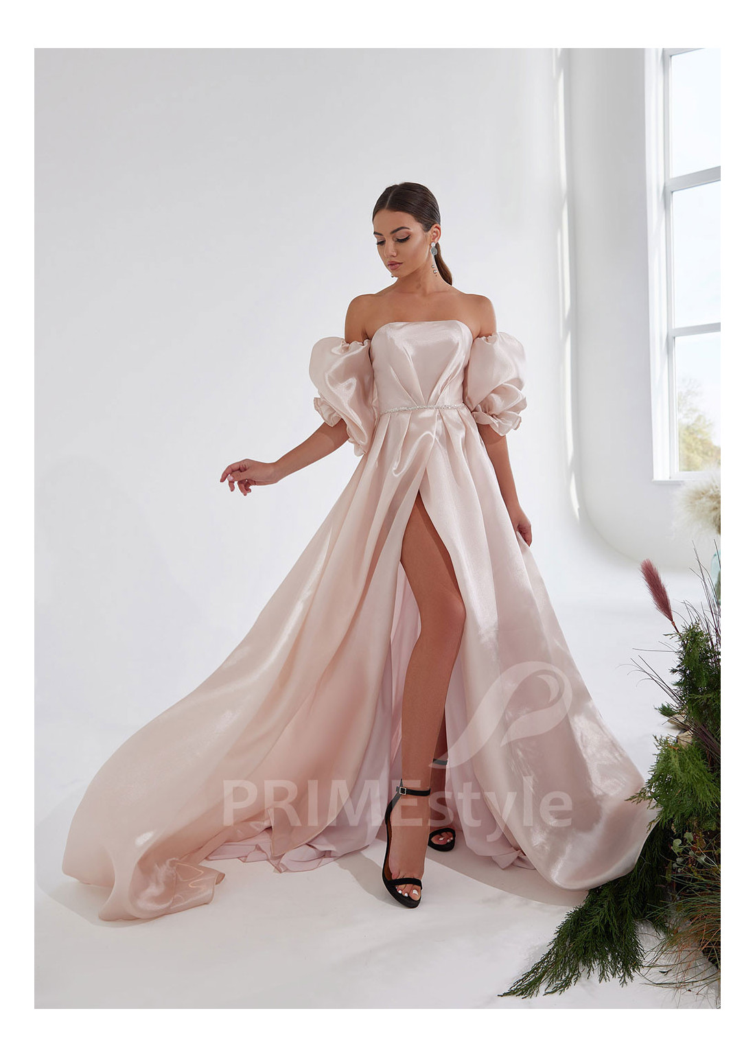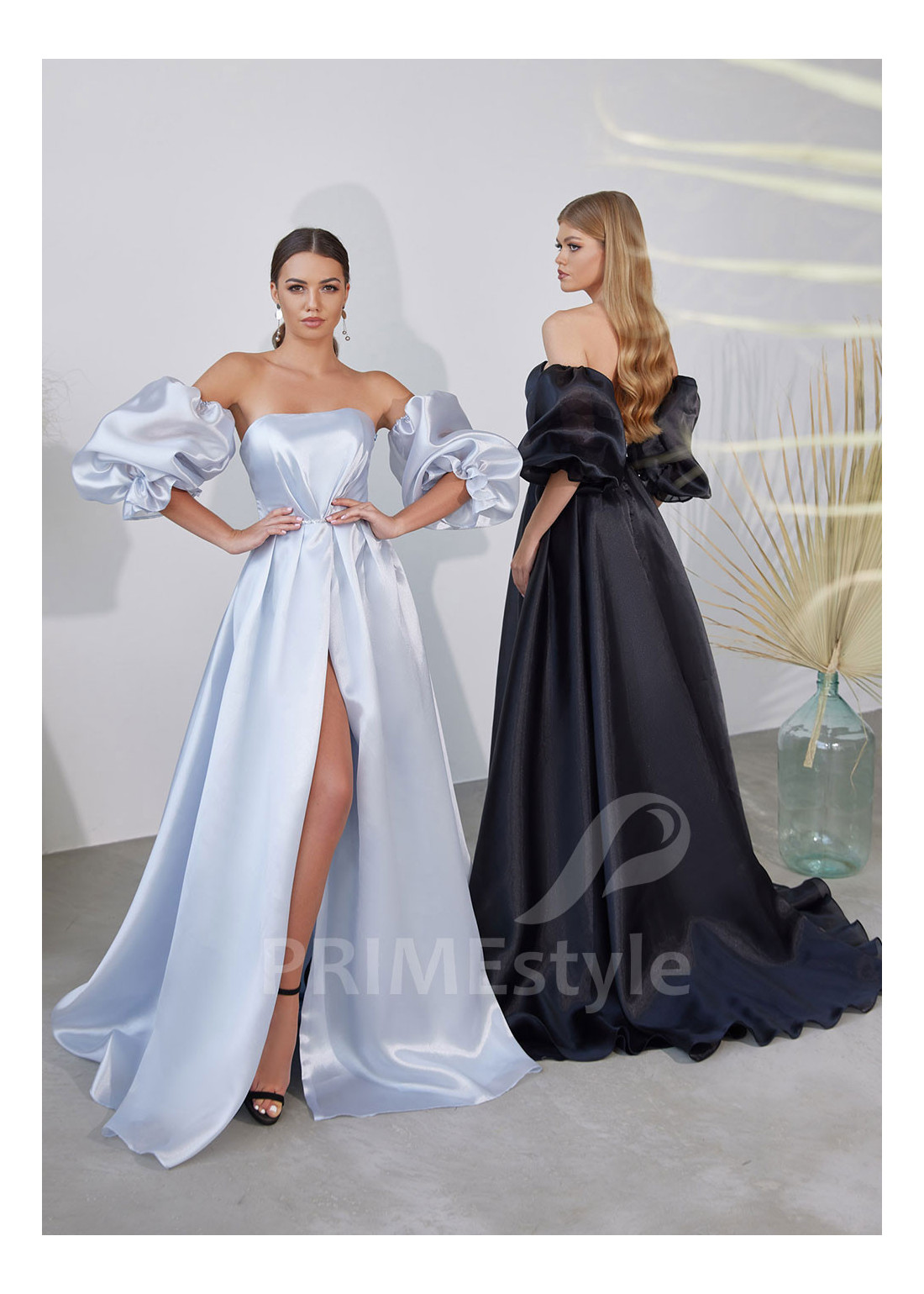 Šarmantné moderné spoločenské šaty s trendovým rovným výstrihom na hrudi, odhaleným chrbtom a so samostatnými pekne tvarovanými balónovými rukávmi. Sukňa s hlbokým rázporkom na pravej nohe. Vhodné ako šaty na ples, šaty na stužkovú, šaty na svadbu, popolnočné šaty a šaty pre svadobné mamy.