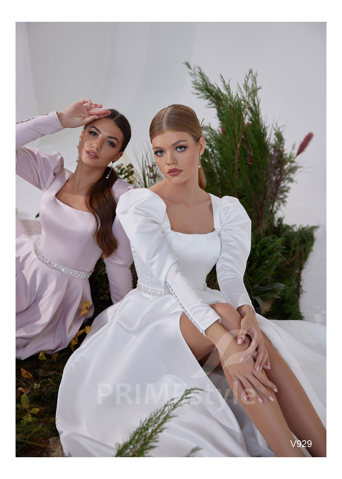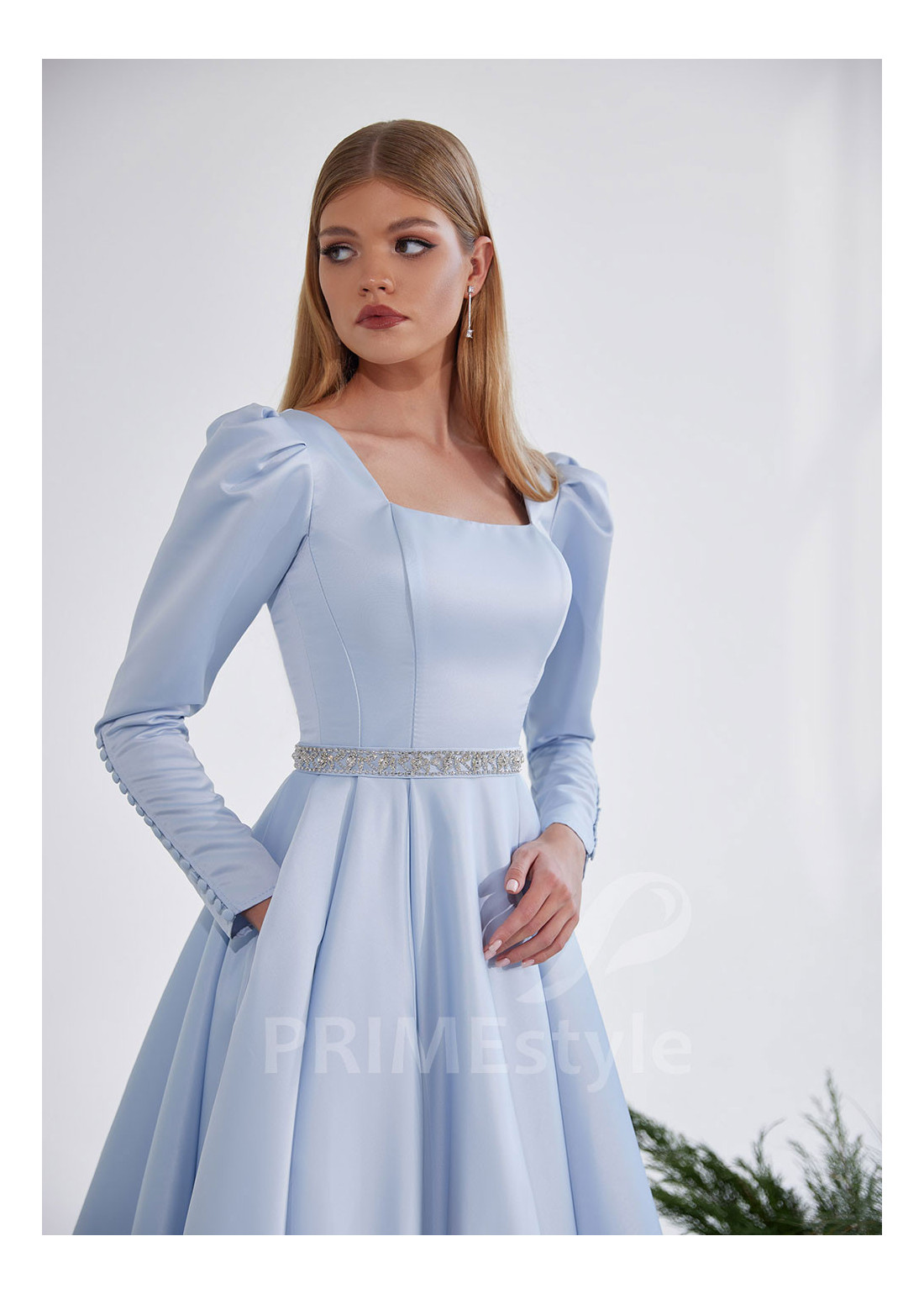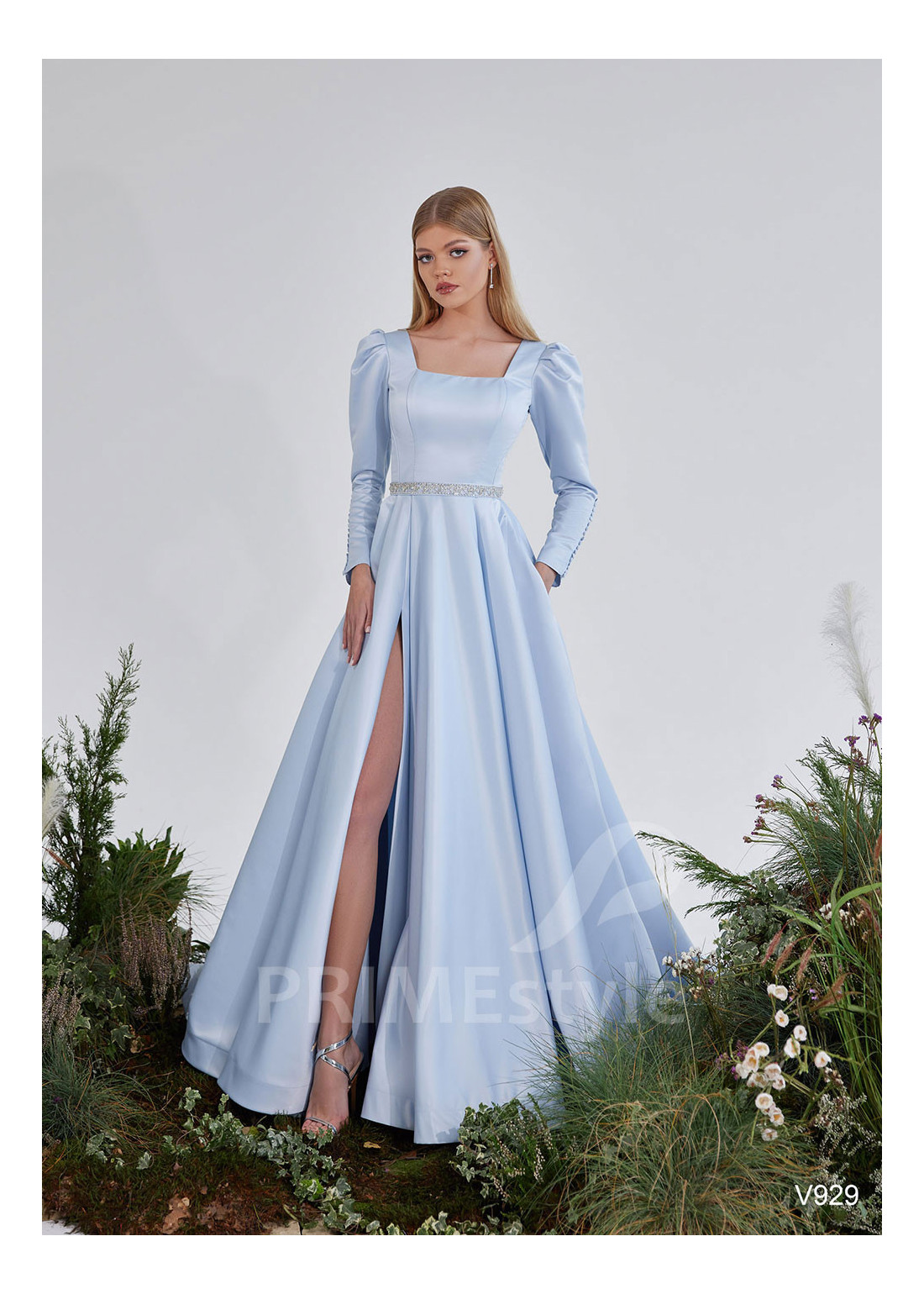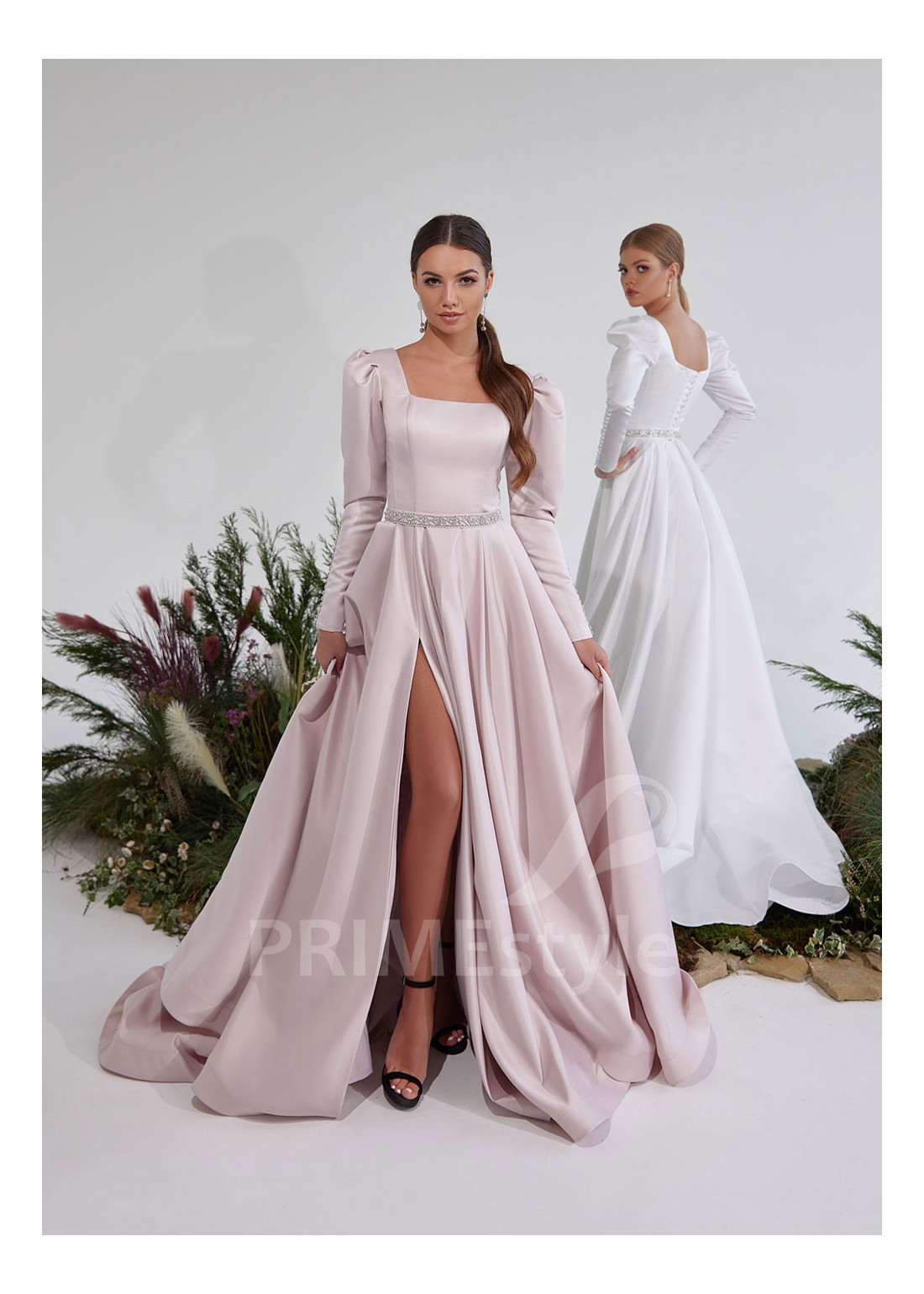 Elegantné spoločenské šaty so zakrytým dekoltom, trendovým rovným výstrhom na hrudi, mierne odhaleným chrbtom a s padavou saténovou sukňou s rázporkom na pravej nohe. Vhodné aj ako šaty na ples, šaty na stužkovú, popolnočné šaty a šaty pre svadobné mamy.