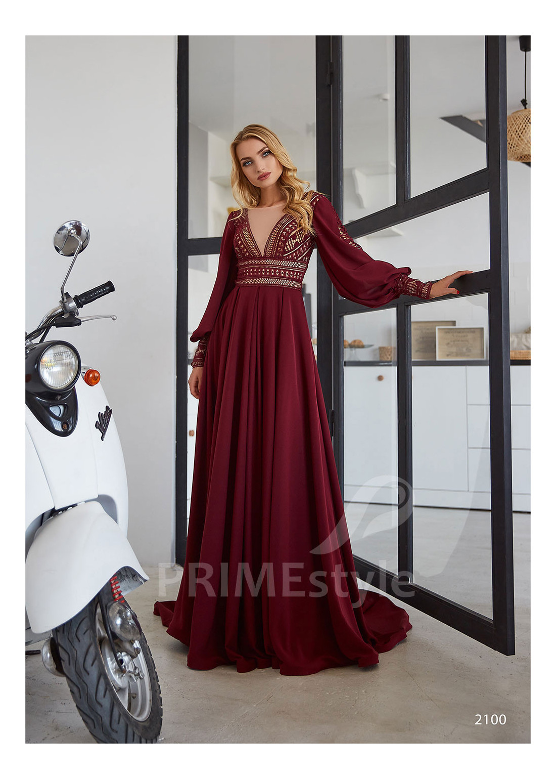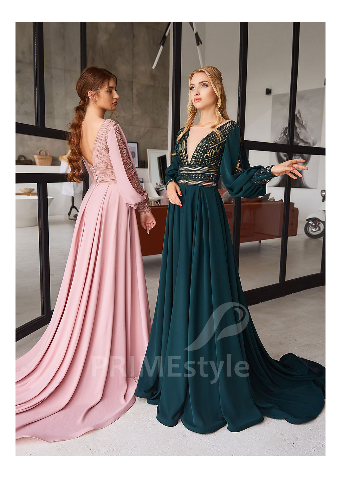 Spoločenské šaty s V-výstrihom na hrudi, dlhým balónovým rukávom a elegantnou padavou sukňou. Korzet a rukávy sú zdobené krajkou. Vhodné ako šaty na ples, šaty na stužkovú, šaty na svadbu s šaty pre svadobné mamy.
