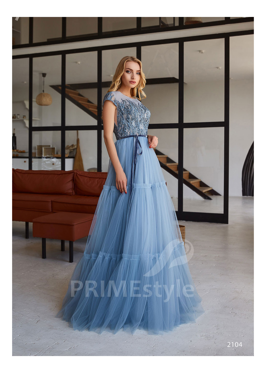 Ľahké tylové spoločenské šaty s krátkym rukávom, lodičkovým výstrihom na hrudi a ľahkou vrstvenou sukňou. Korzet je zdobený krásnou vyšívanou čipkou. Vhodné aj ako šaty na ples, šaty na svadbu a šaty pre svadobné mamy.