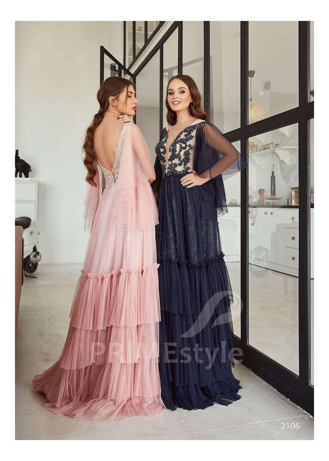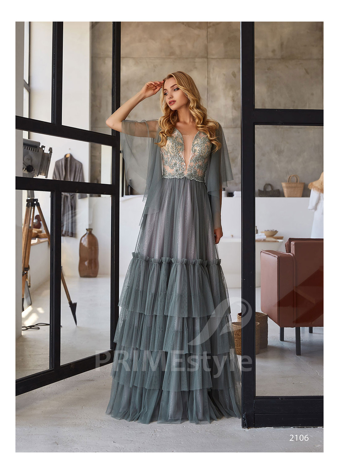 Dlhé luxusné spoločenské šaty s hlbokým V-výstrihom na hrudi, voľnými rukávmi, odhaleným chrbtom a ľahkou vrstvenou trblietavou sukňou. Vhodné aj ako šaty na ples a šaty na stužkovú.