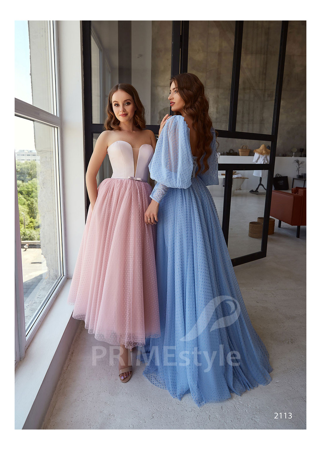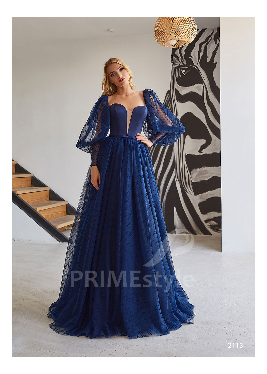 Moderné spoločenské šaty s hlbokým V-výstrihom na hrudi, odhaleným chrbtom, samostatnými balónovými rukávmi a s ľahkou padavou tylovou sukňou. Možnosť ušitia s midi alebo maxi sukňou. Vhodné aj ako šaty na ples, šaty na stužkovú a popolnočné šaty.