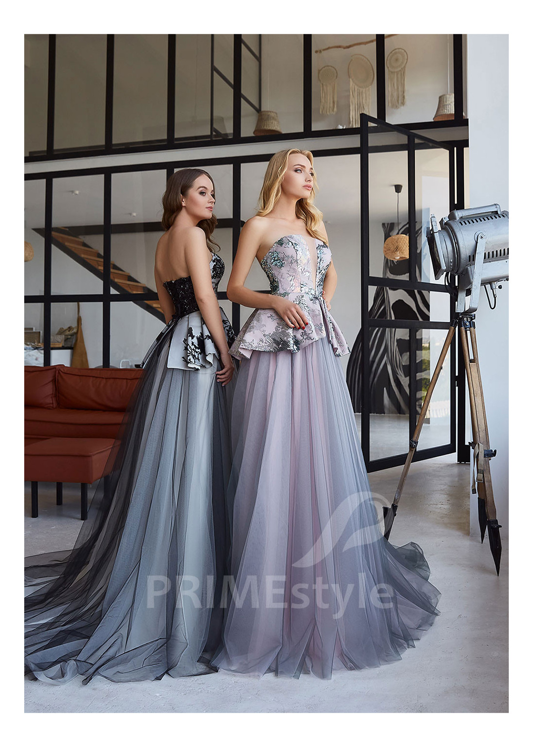 Elegantné spoločenské šaty s hlbokým priesvitným trendovým V-výstrihom na hrudi, odhaleným chrbtom a s objemnou padavou tylovou sukňou. Vhodné ako šaty na ples, šaty na stužkovú, šaty na svadbu a šaty pre svadobné mamy.