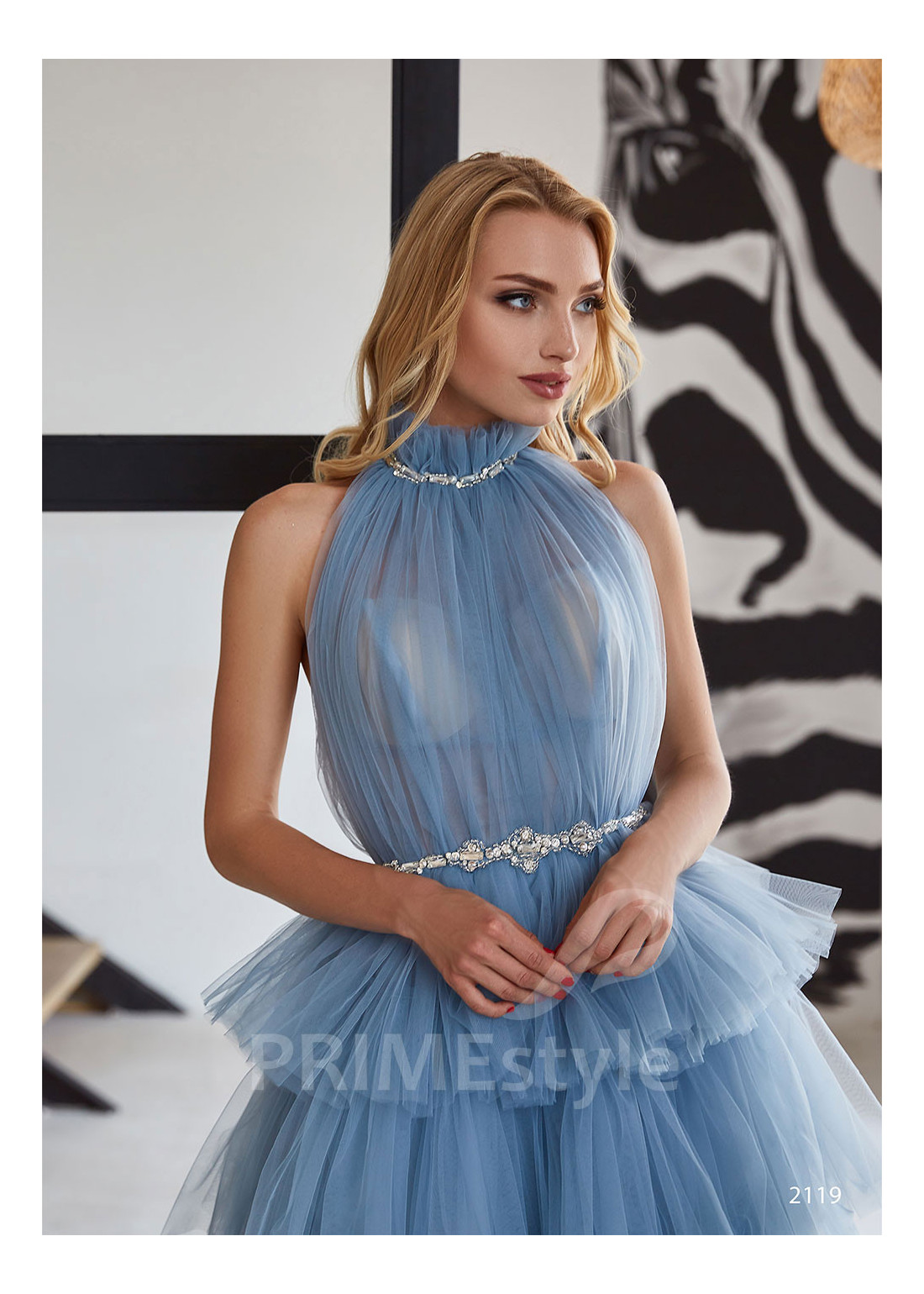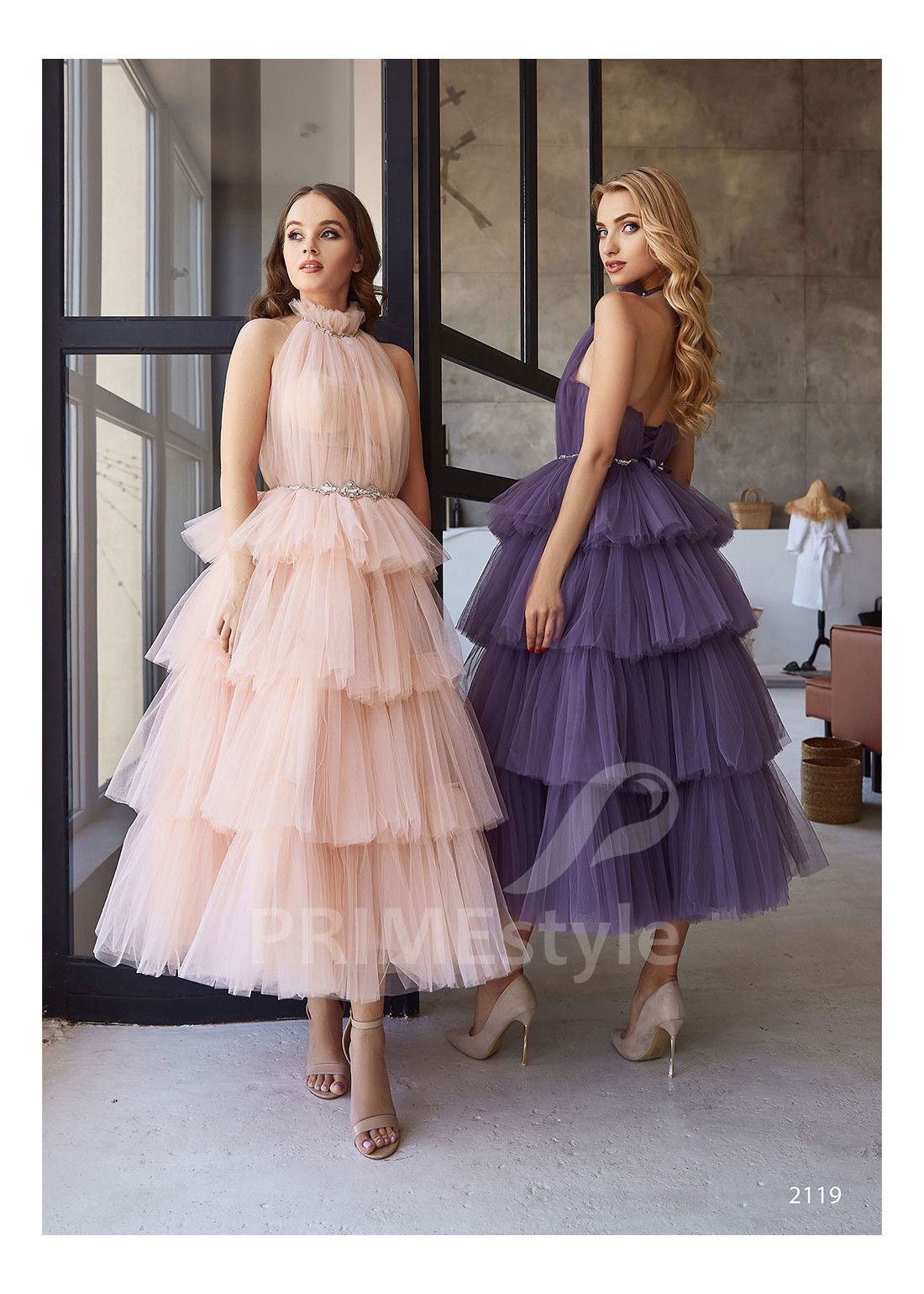 Efektné tylové midi spoločenské šaty so zakrytým dekoltom po krk, odhaleným chrbtom a s rozkošnou vrstvenou tylovou sukňou. Možnosť ušitia aj s maxi sukňou. Vhodné ako šaty na ples, šaty na stužkovú a šaty pre družičky.