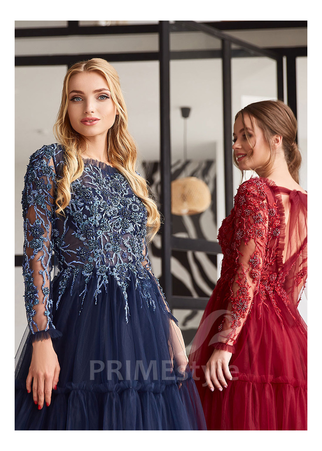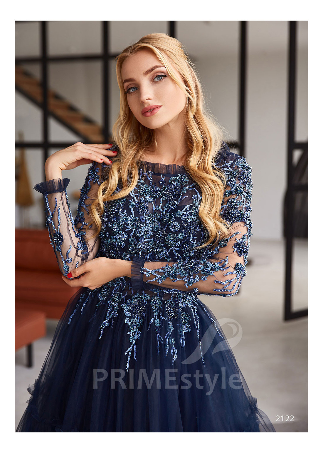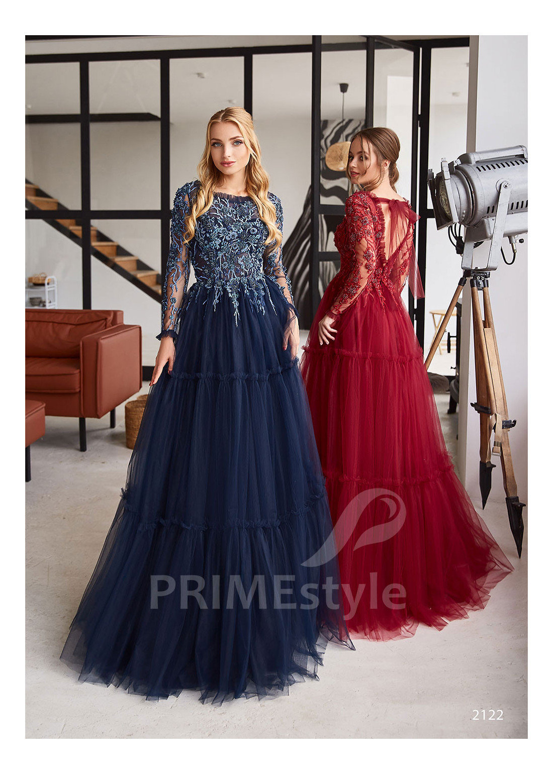Luxusné spoločenské šaty s dlhými rukávmi, lodičkovým výstrihom na hrudi, otvoreným chrbtom a s rozkošnou tylovou vrstvenou sukňou. Vhodné aj ako šaty na stužkovú, šaty na svadbu, popolnočné šaty a šaty pre svadobné mamy.