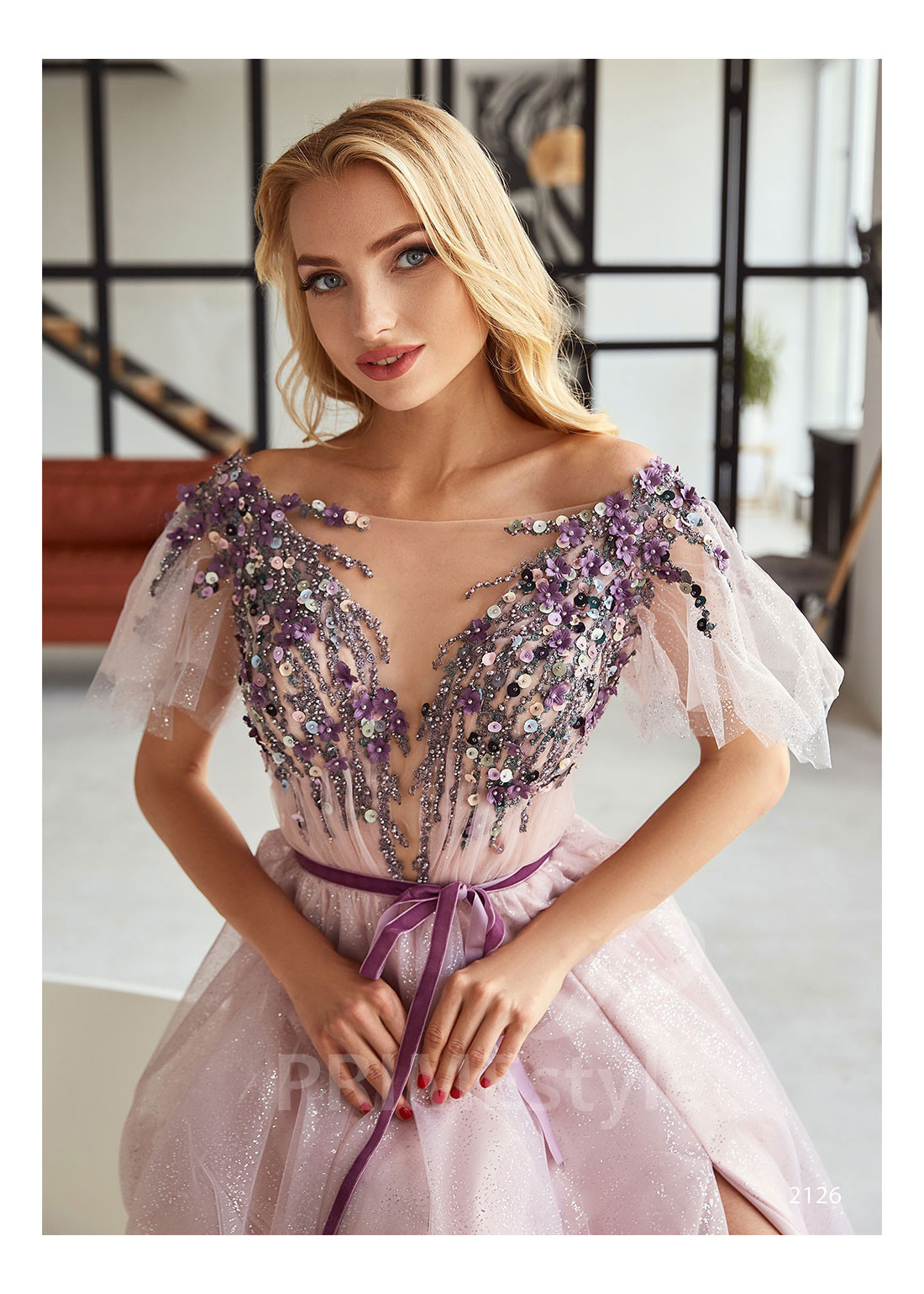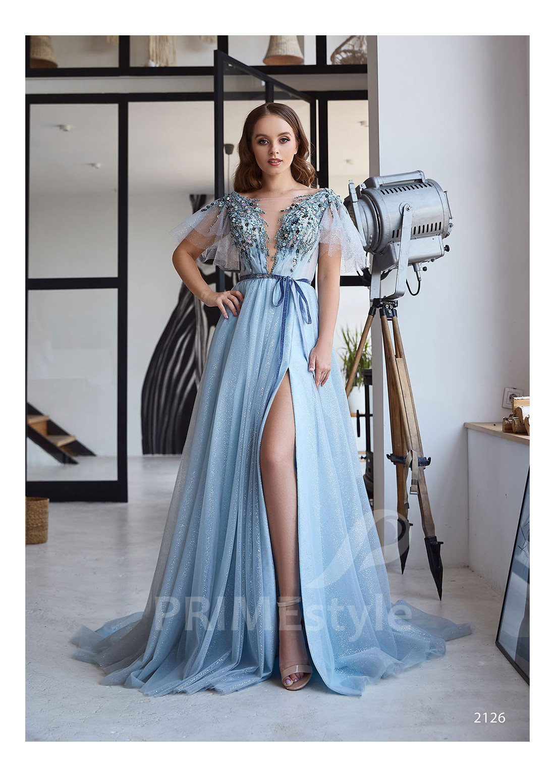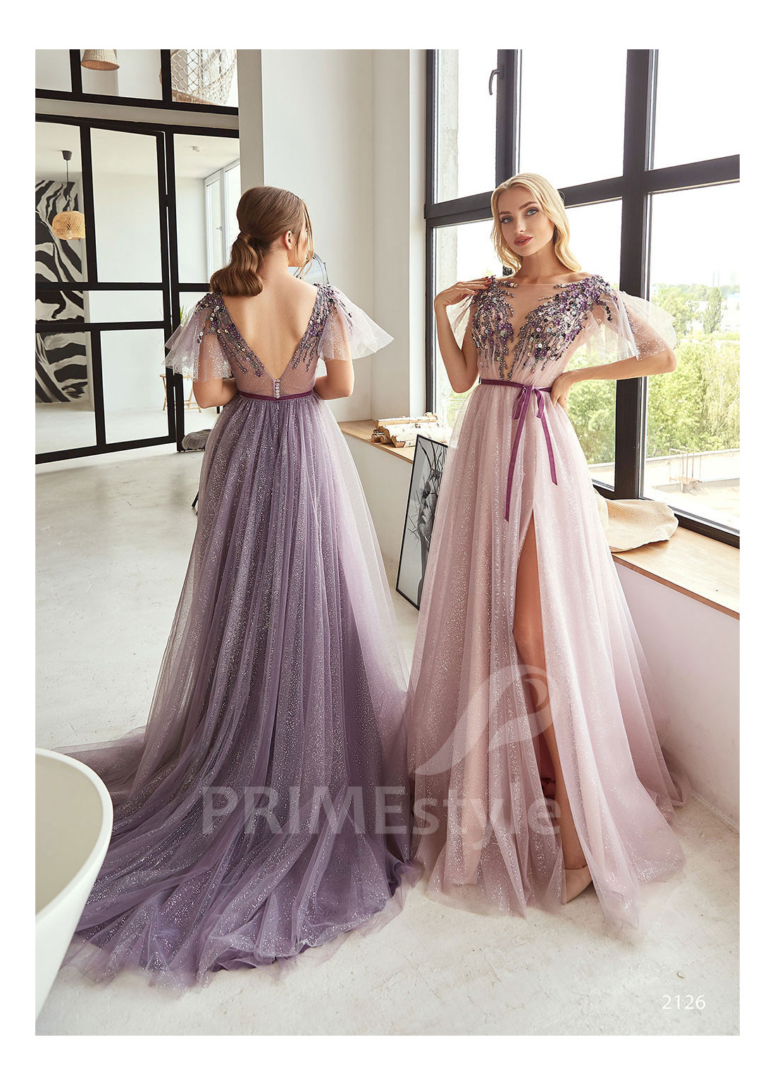 Slávnostné spoločenské šaty s hlbokým výsrihom do V-čka, odhaleným chrbtom, krátkym voľným rukávom a ľahkou trblietavou tylovou sukňou s rázporkom. Korzet je zdobený bohatou vyšívanou čipkou. Vhodné aj ako šaty na ples, popolnočné šaty a šaty pre svadobné mamy.