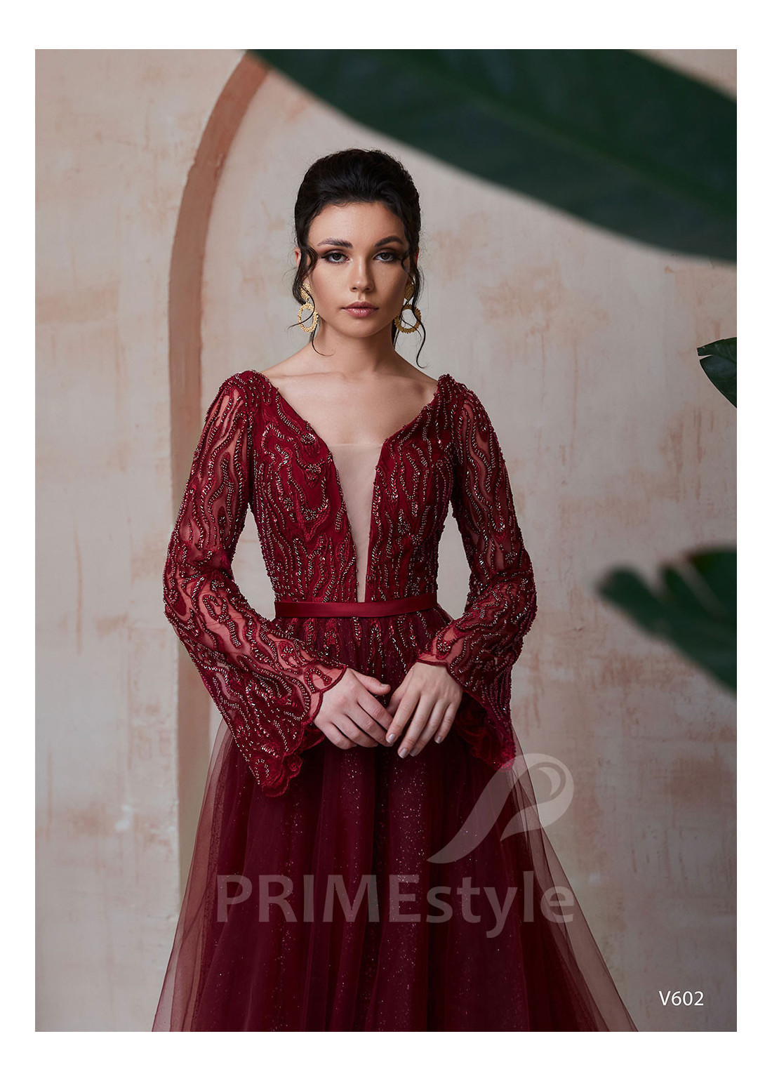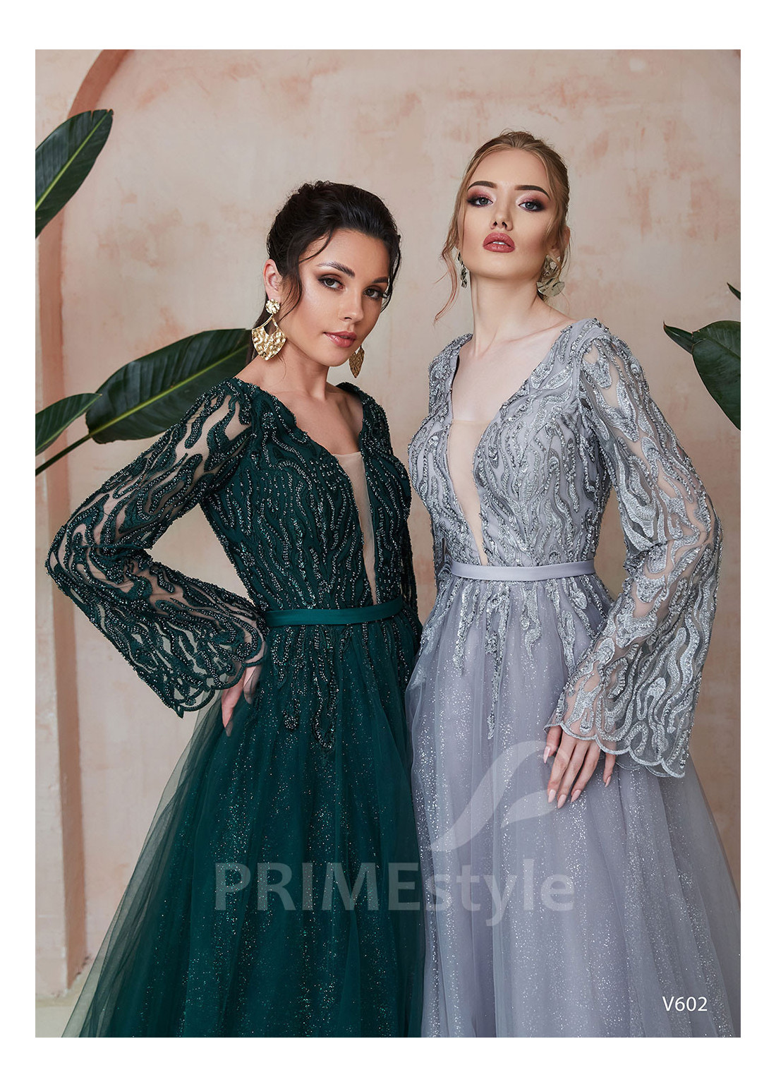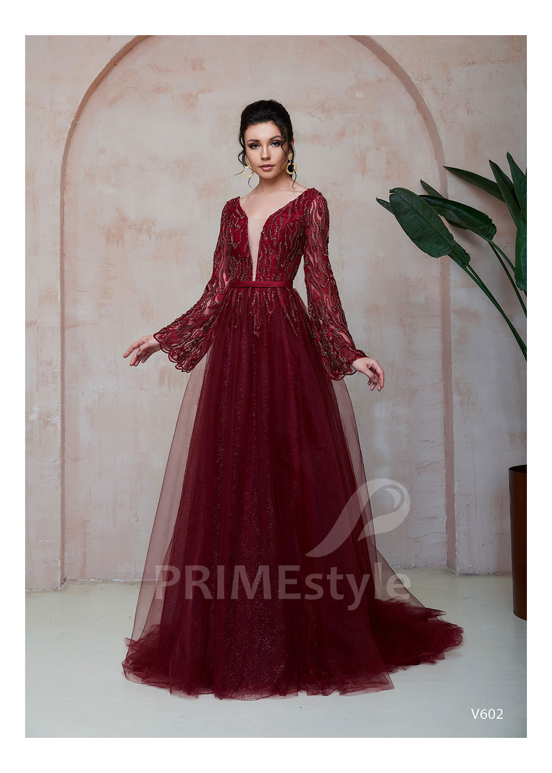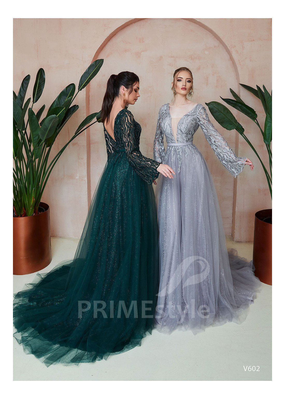 Spoločenské šaty s dlhým rukávom s rozšíreným spodným okrajom, s hlbokým V-výstrihom na hrudi, odhaleným chrbtom a ľahkou trblietavou tylovou sukňou. Korzet a rukávy sú zdobené bohatou vyšívanou čipkou. Vhodné aj ako šaty na ples, šaty na stužkovú a popolnočné šaty.