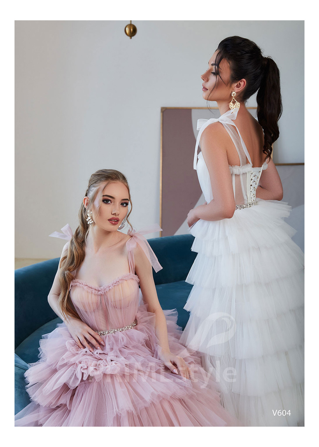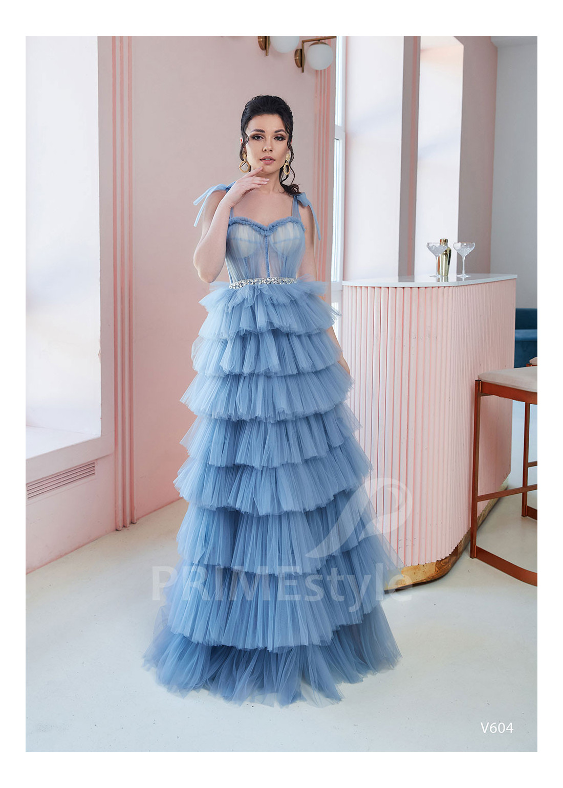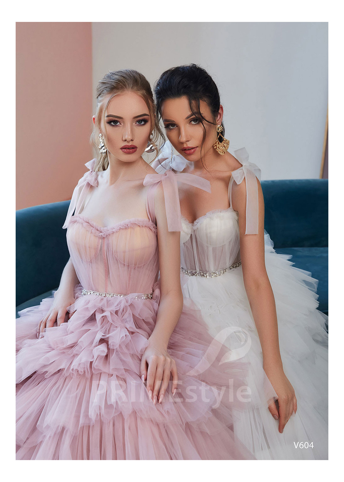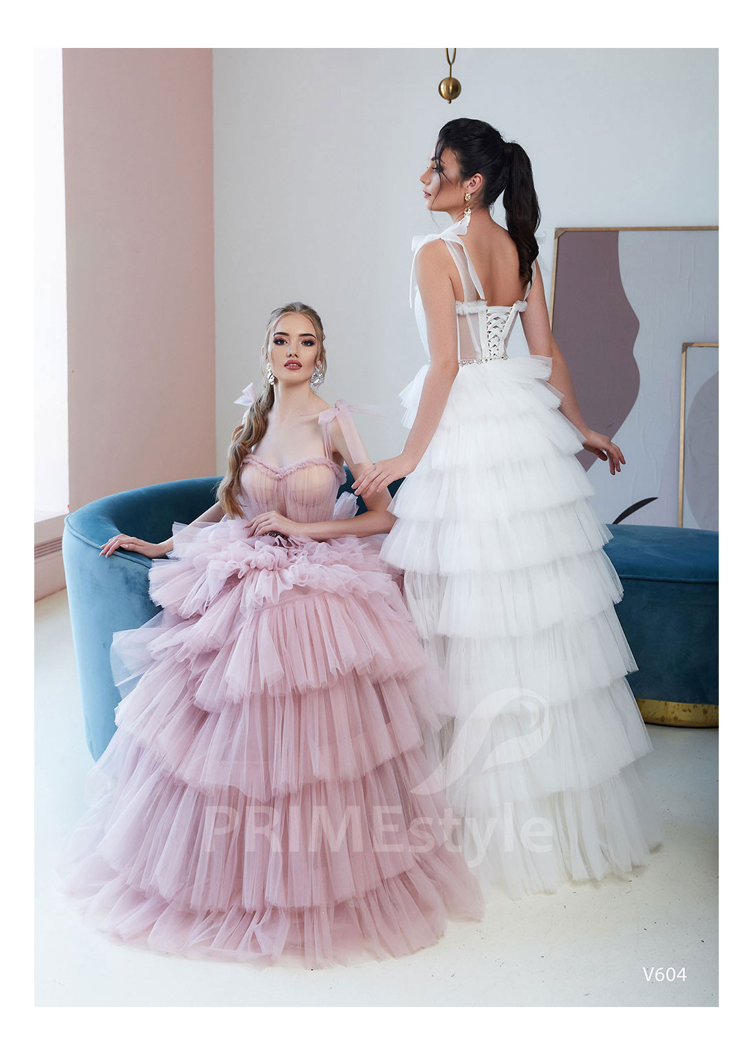 Roztomilé extravagantné spoločenské šaty na ramienka s trendovým srdiečkovým výstrihom na hrudi, sexi priesvitným korzetom a bohatou vrstvenou tylovou sukňou. Vhodné aj ako šaty na ples, šaty na svadbu a popolnočné šaty.