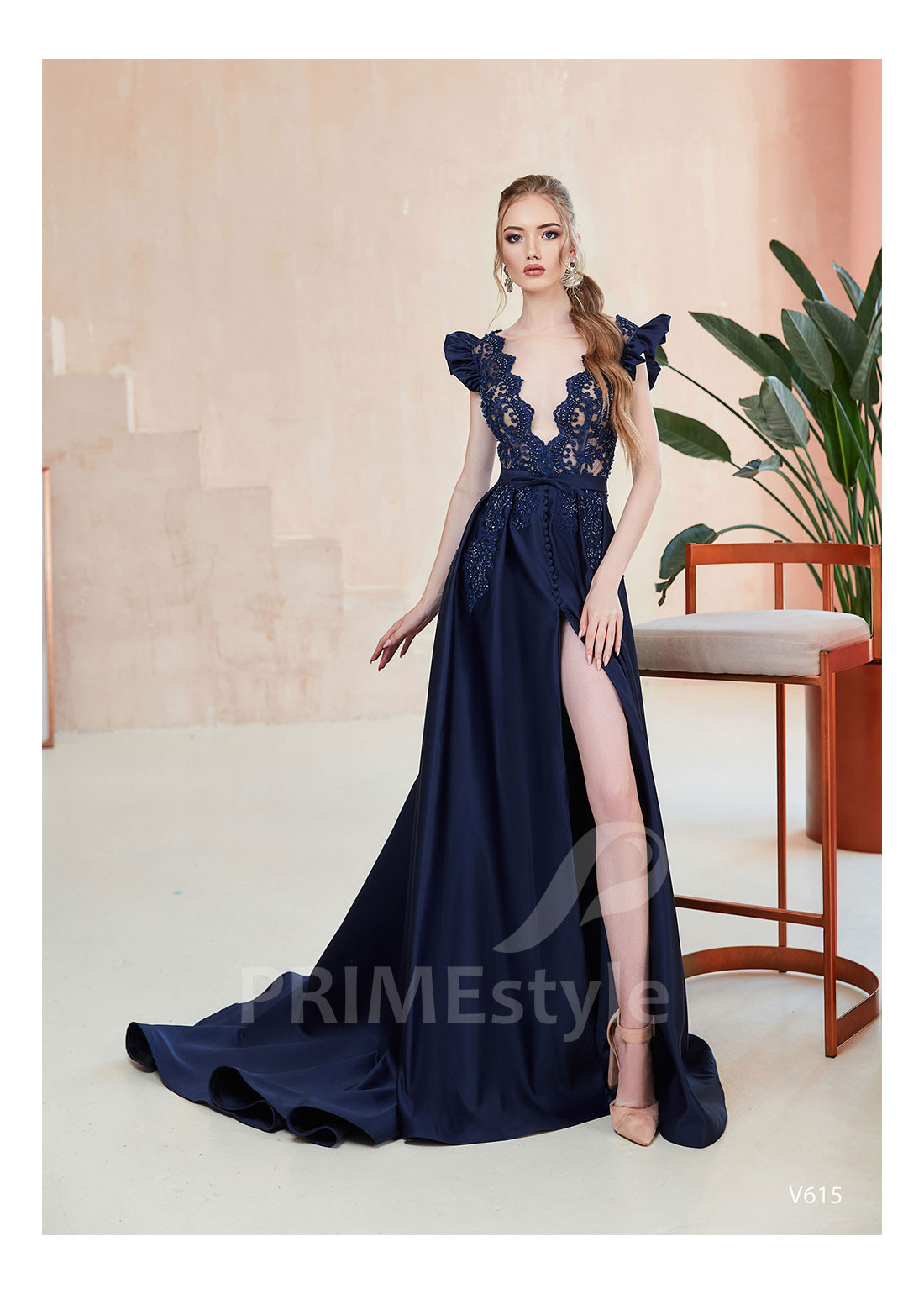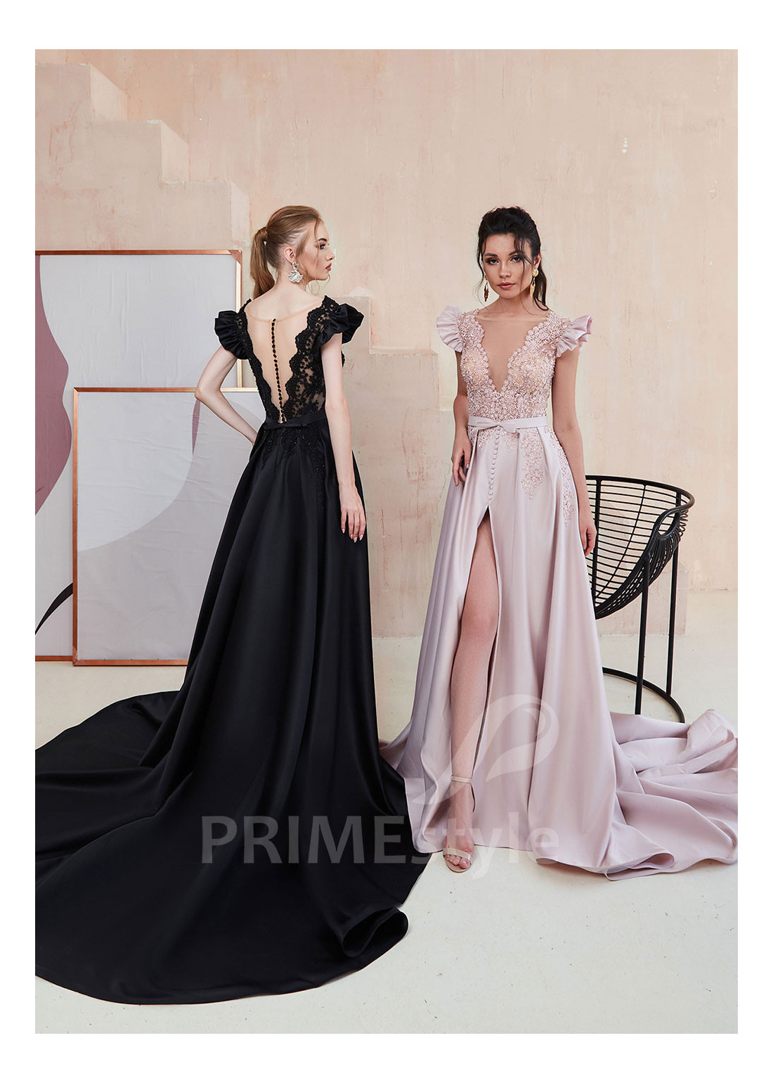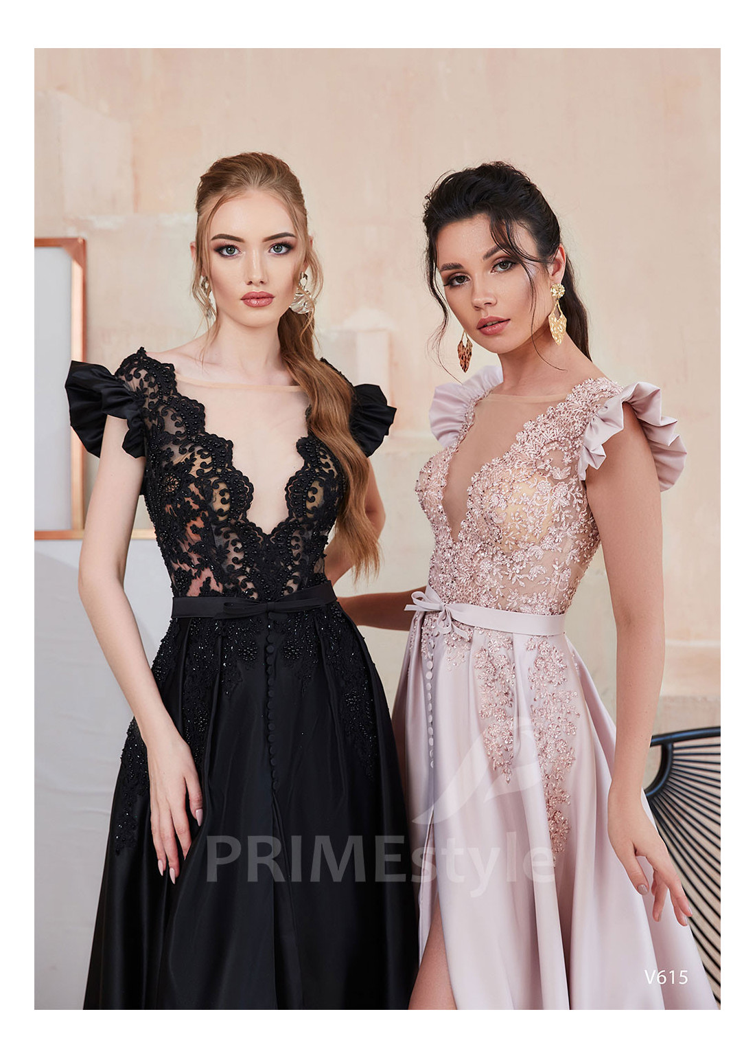 Vkusné elegantné spoločenské šaty s priesvitným korzetom, hlbokým výstrihom do V-čka, otvoreným chrbtom a padavou elegantnou sukňou s rázporkom. Korzet je zdobený rozkošnou vyšívanou čipkou. Vhodné ako šaty na ples, šaty na stužkovú, šaty na svadbu, popolnočné šaty a šaty pre svadobné mamy.