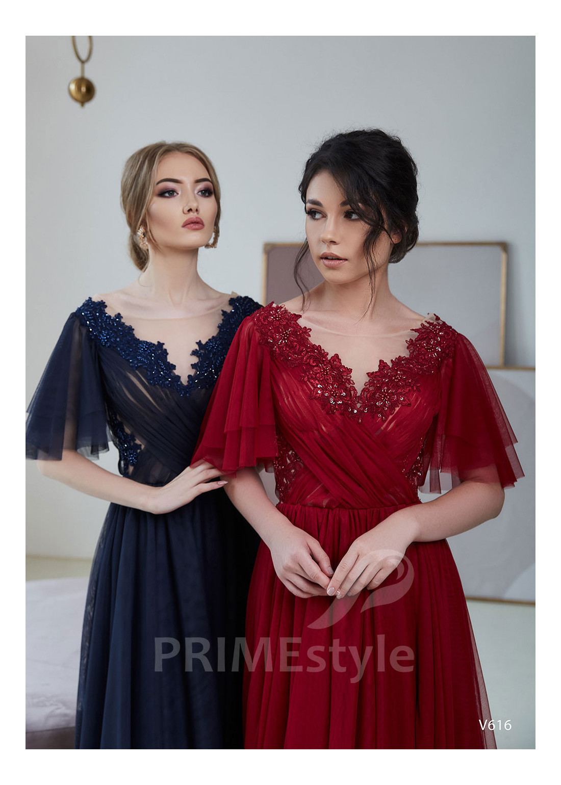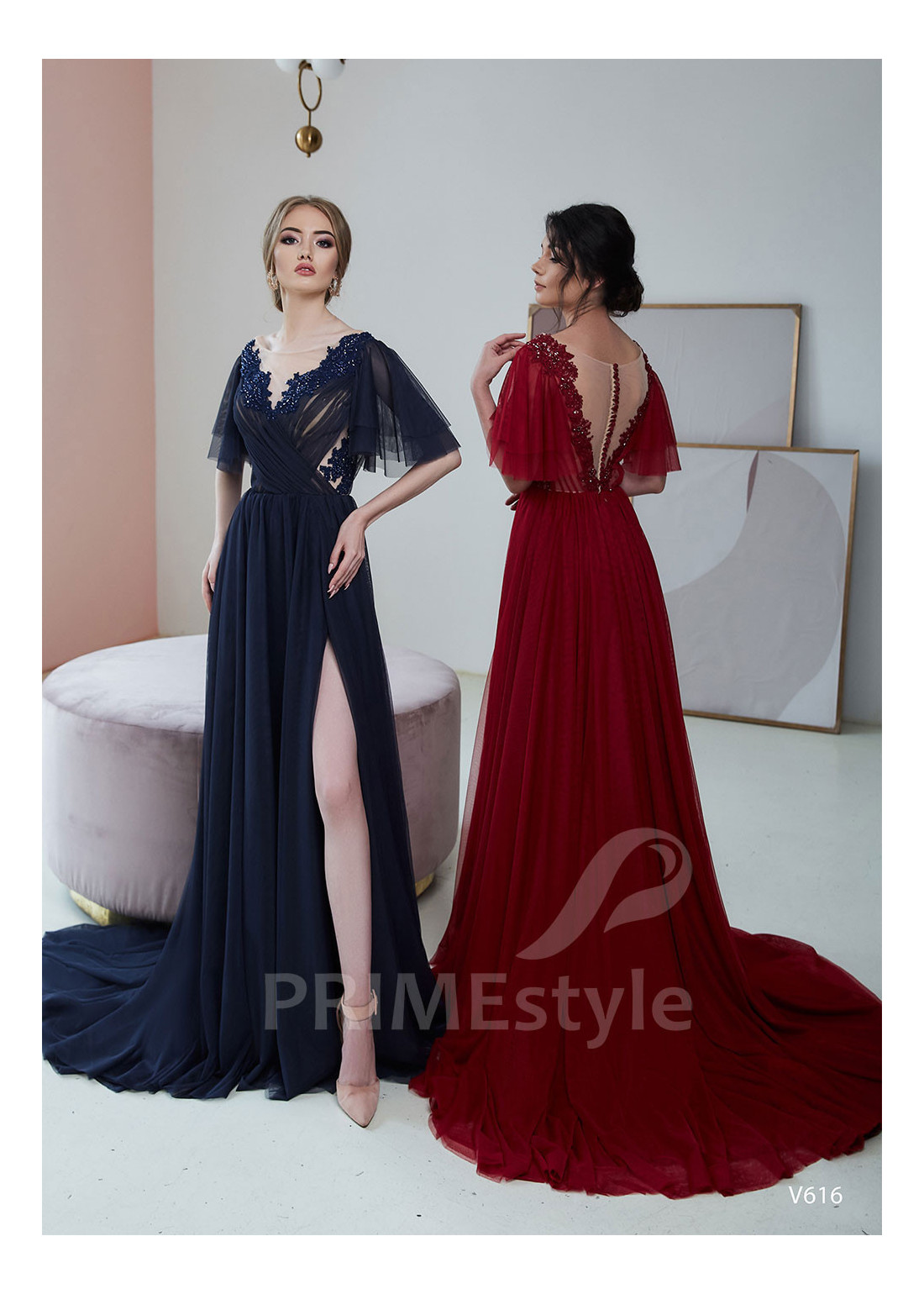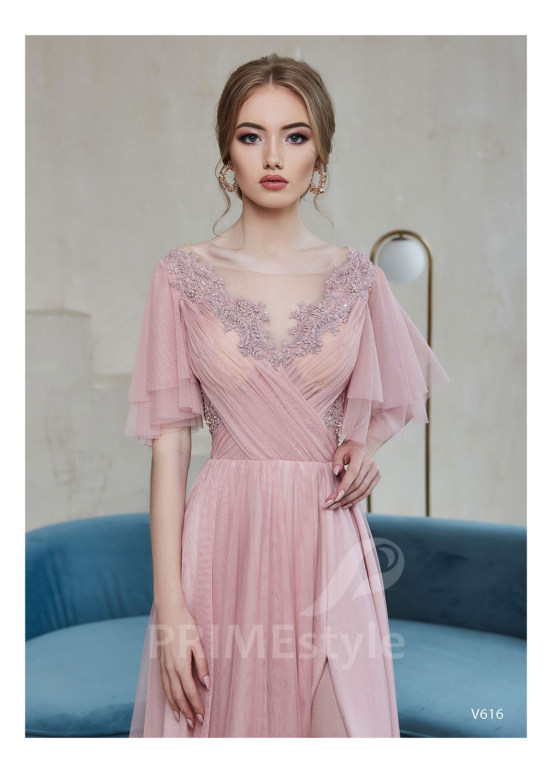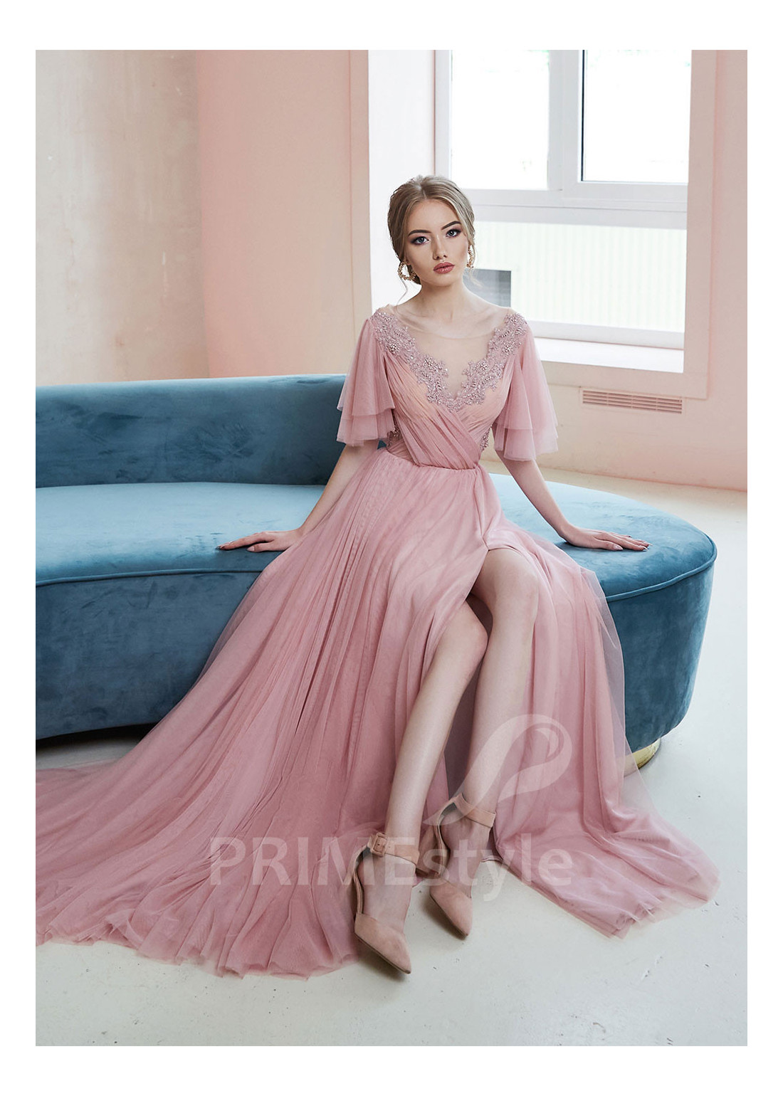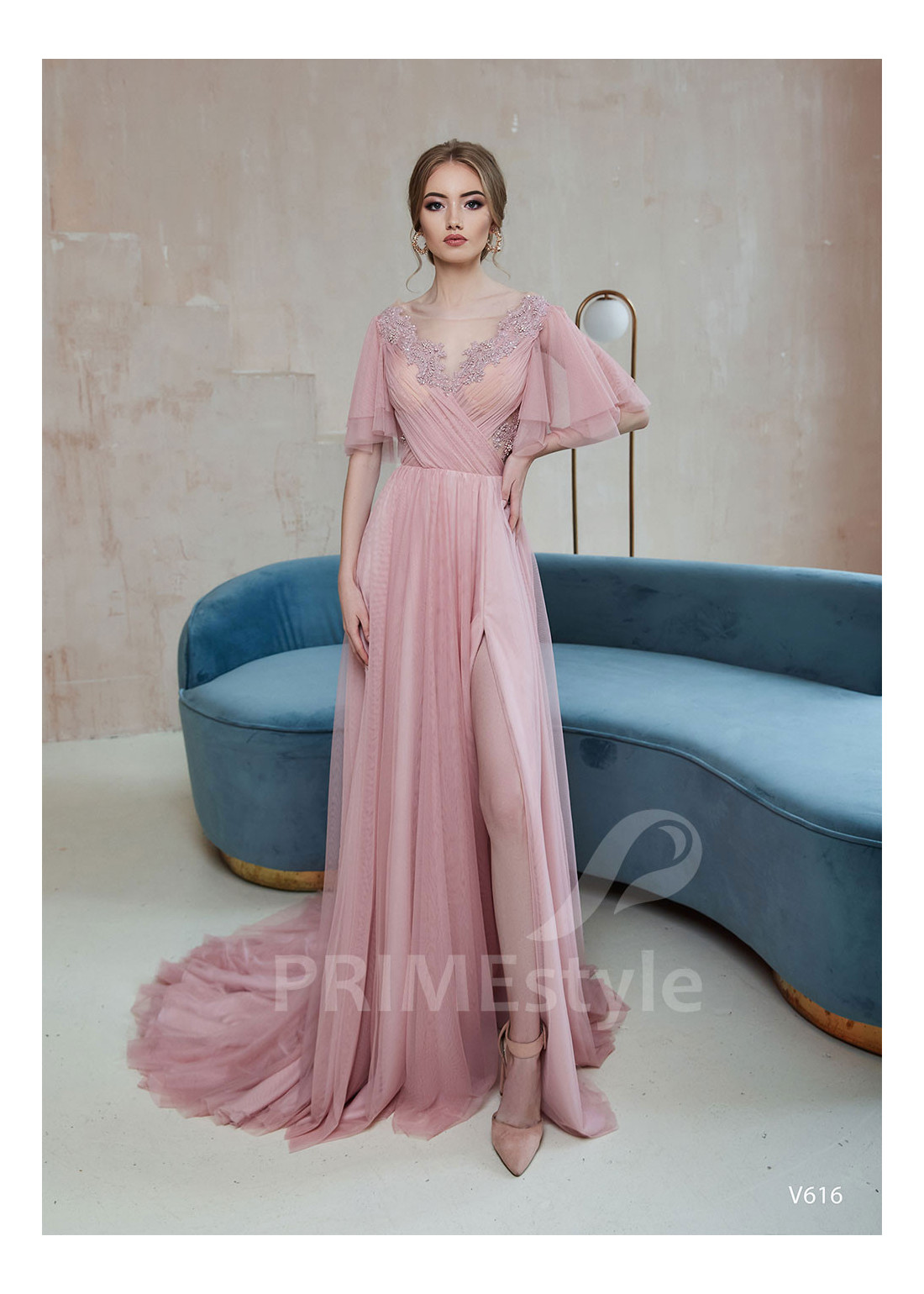 Nádherné tylové spoločenské šaty s voľnými krátkymi rukávmi, výstrihom do V-čka, otvoreným chrbtom a ľahkou padavou tylovou sukňou s rázporokom na ľavej nohe. Korzet je dekorovaný krásnou vyšívanou čipkou. Vhodné aj ako šaty na ples, šaty na stužkovú, šaty na svadbu a popolnočné šaty.