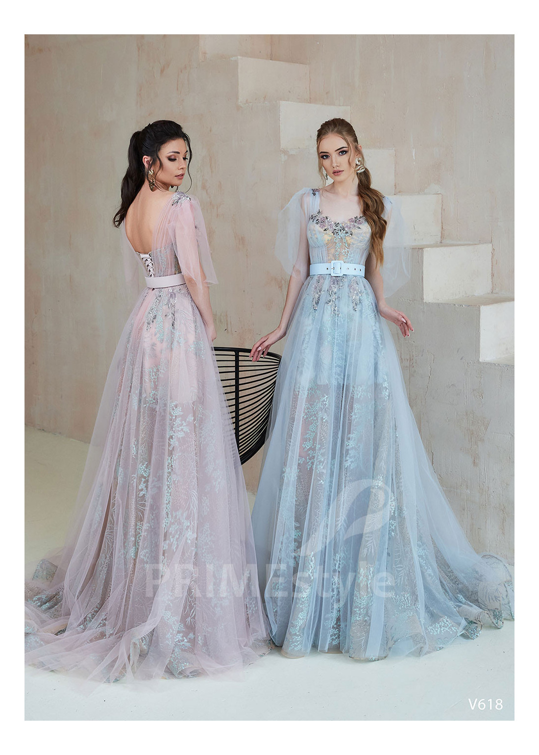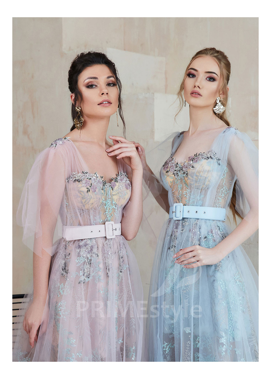 Nežné tylové celočipkované spoločenské šaty s priesvitným korzetom, voľnými tylovými rukávmi, trendovým srdiečkovým výstrihom na hrudi a ľahkou sukňou. Vhodné aj ako šaty na ples, šaty na stužkovú, popolnočné šaty a šaty pre svadobné mamy.