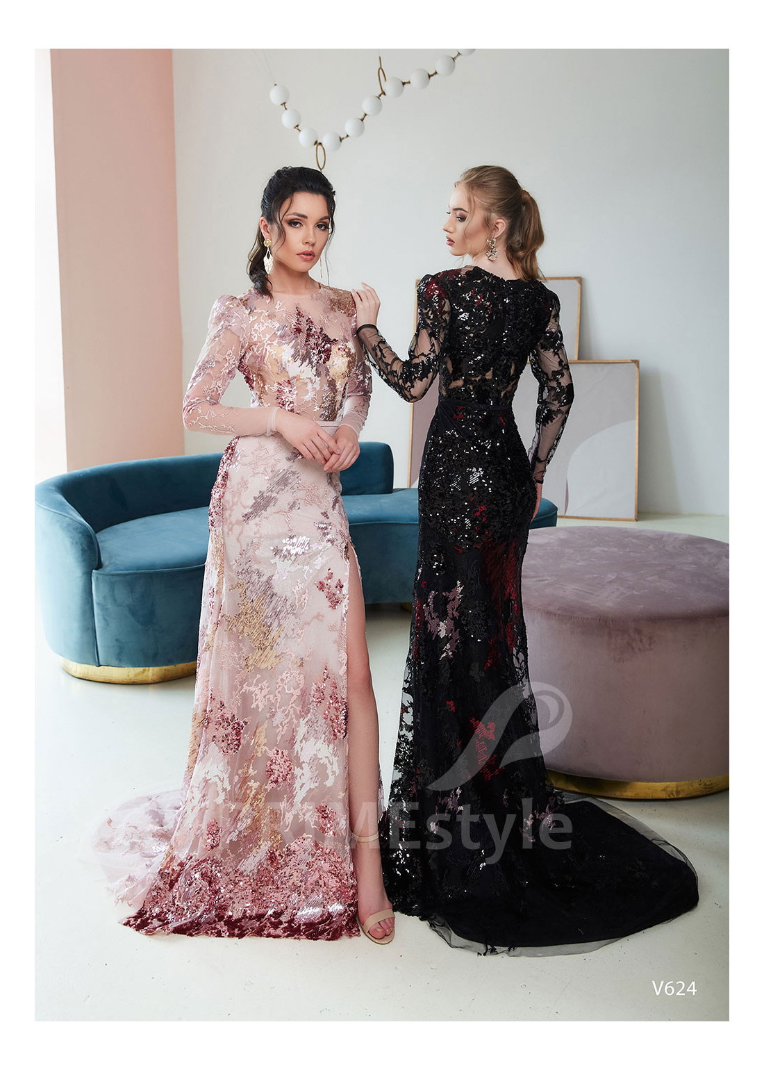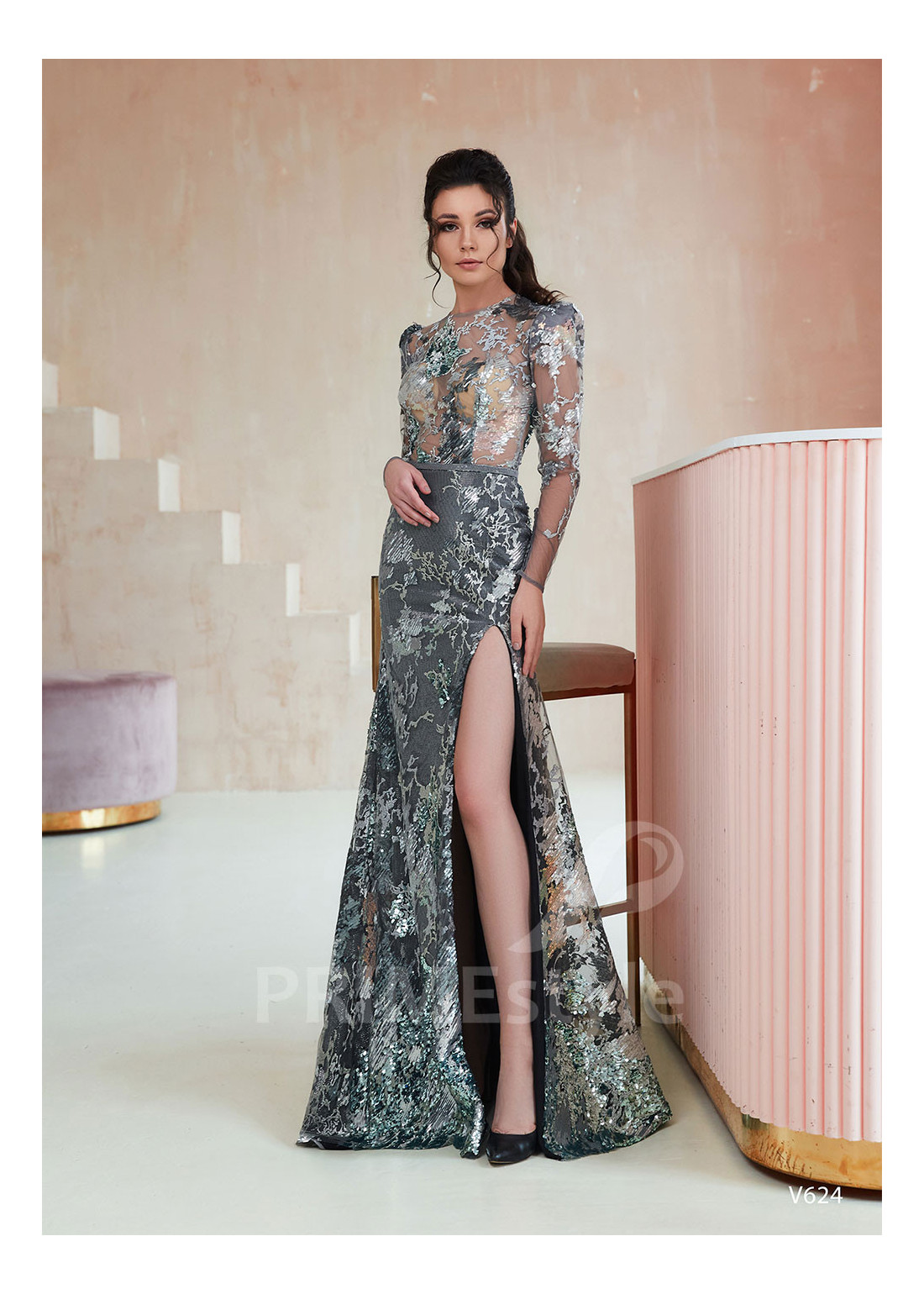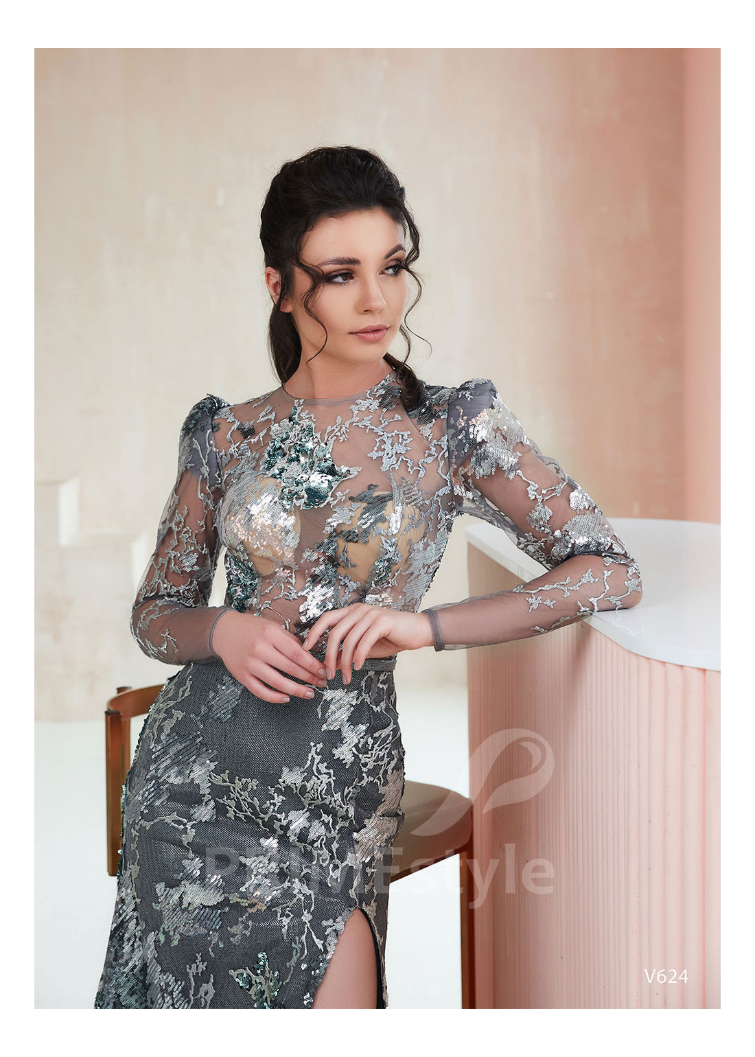 Šarmantné úzke spoločenské šaty s dlhým rukávom, zakrytým dekoltom a zahaleným chrbtom. Elegantná trblietavá sukňa je s rázporkom na ľavej nohe. Vhodné aj ako šaty na stužkovú, šaty na svadbu a popolnočné šaty.