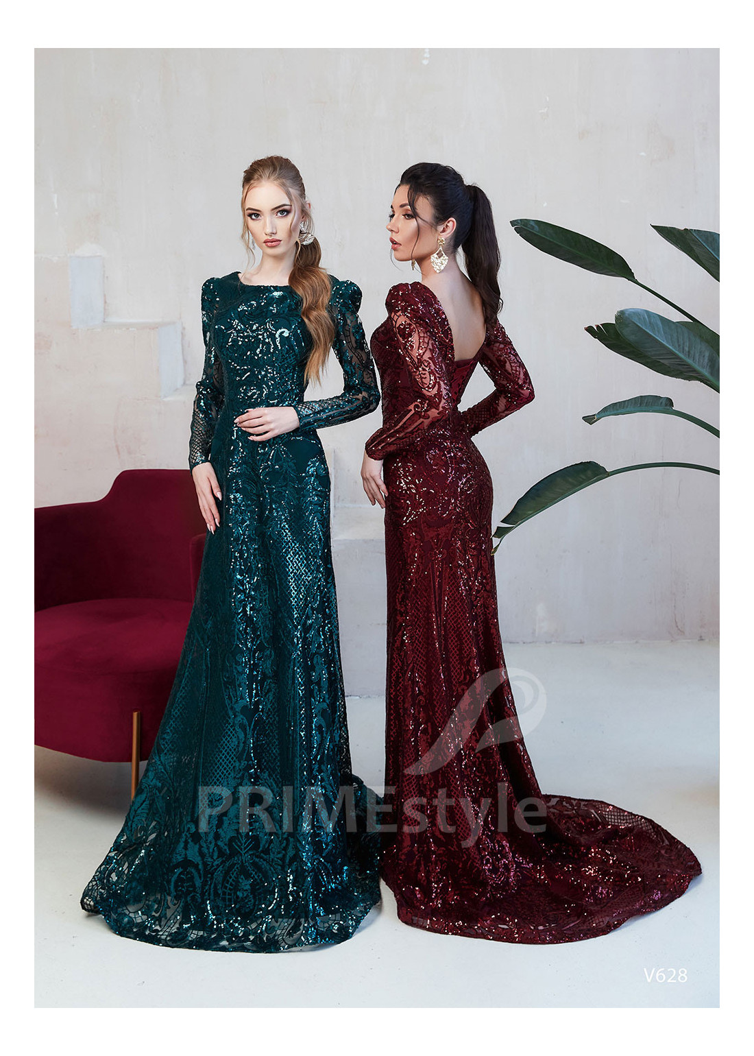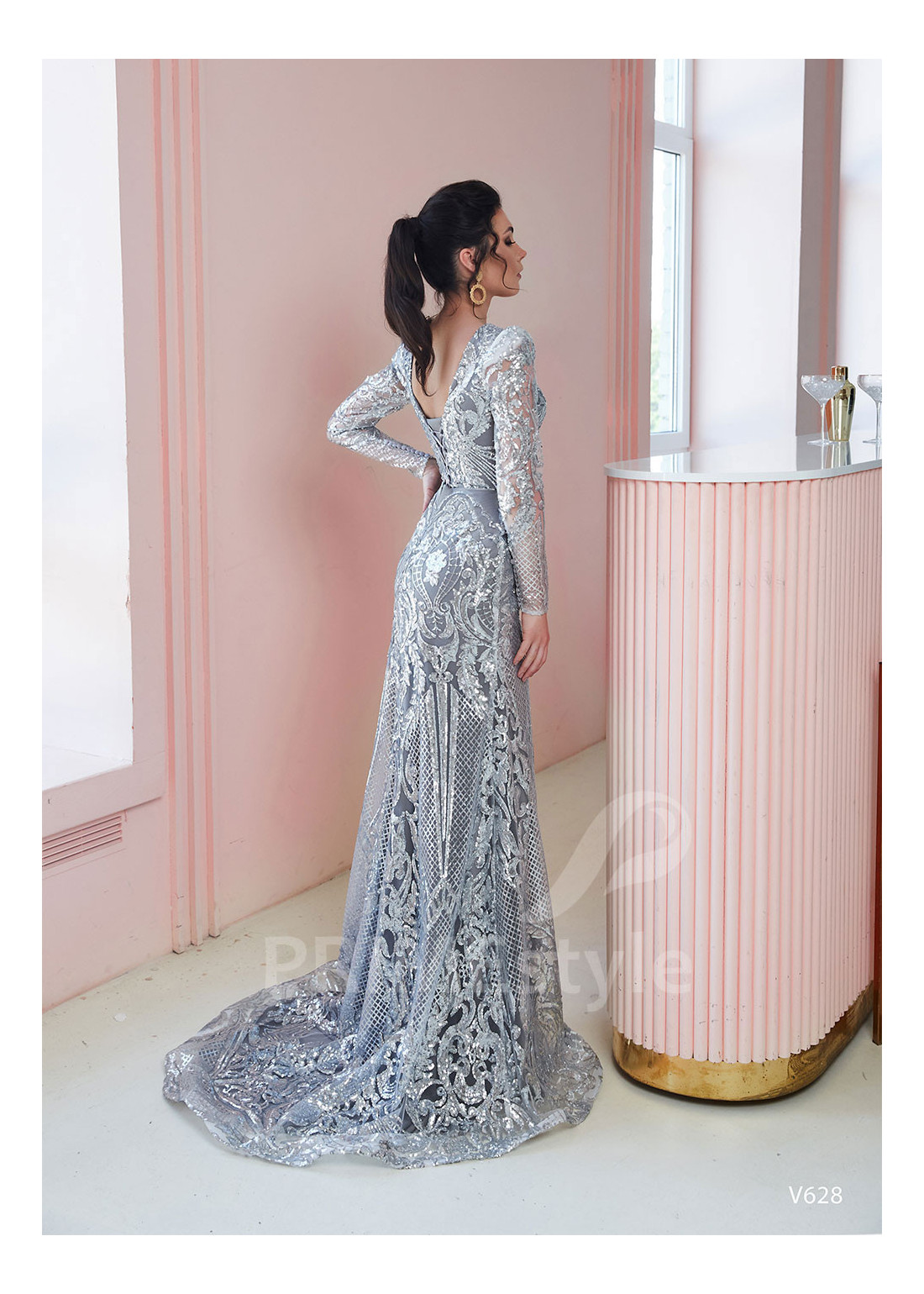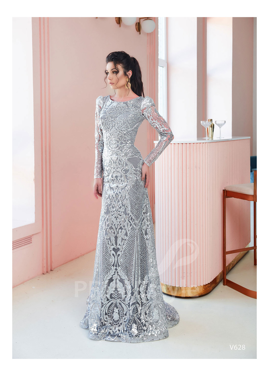 Rozkošné celotrblietavé úzke spoločenské šaty s dlhým rukávom, zakrytým dekoltom, mierne odhaleným chrbtom a efektnou pekne tvarovanou sukňou. Vhodné ako šaty na ples a šaty na stužkovú.