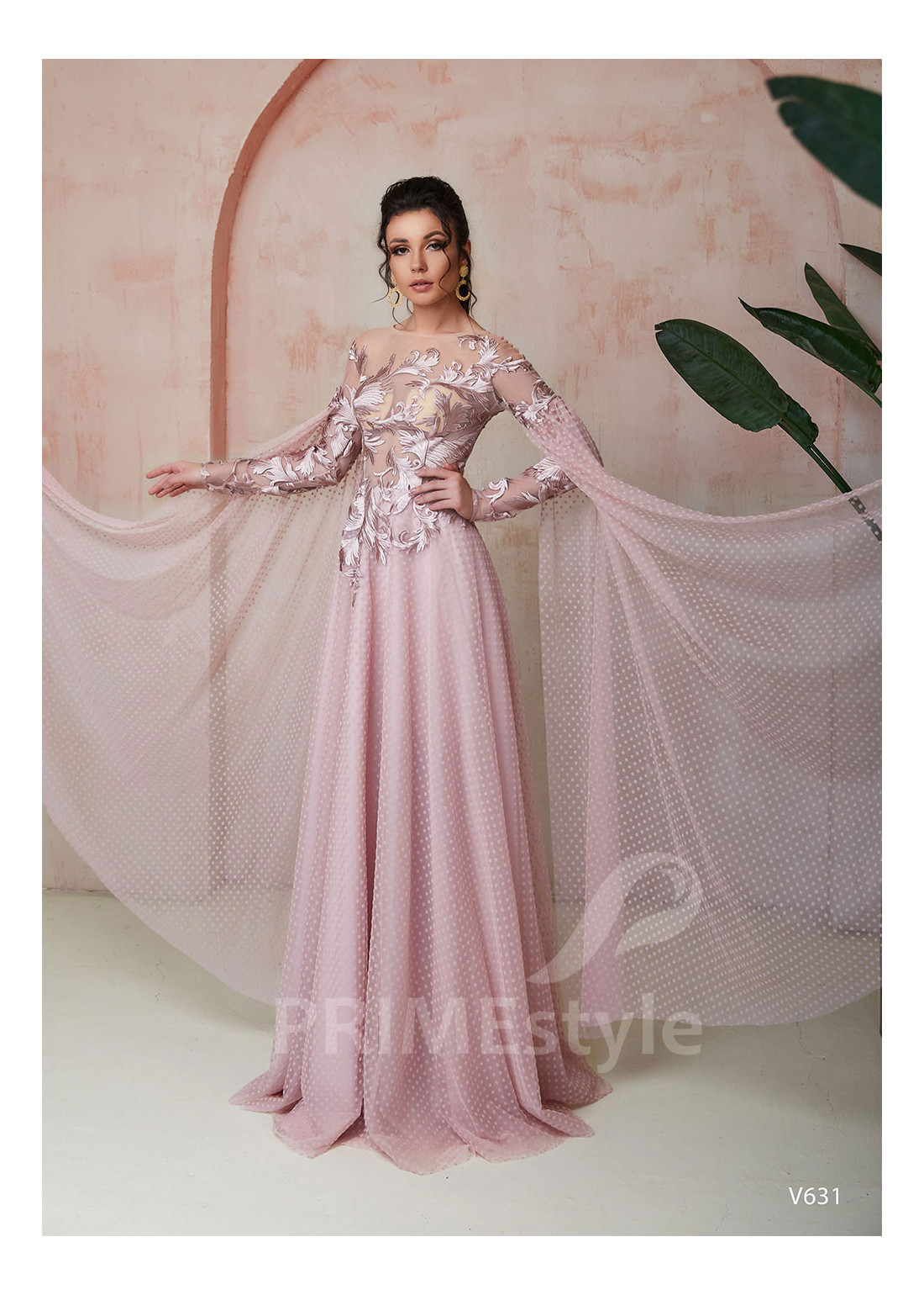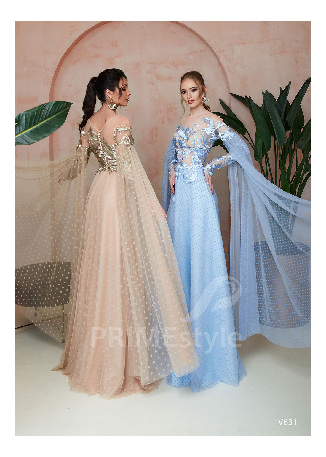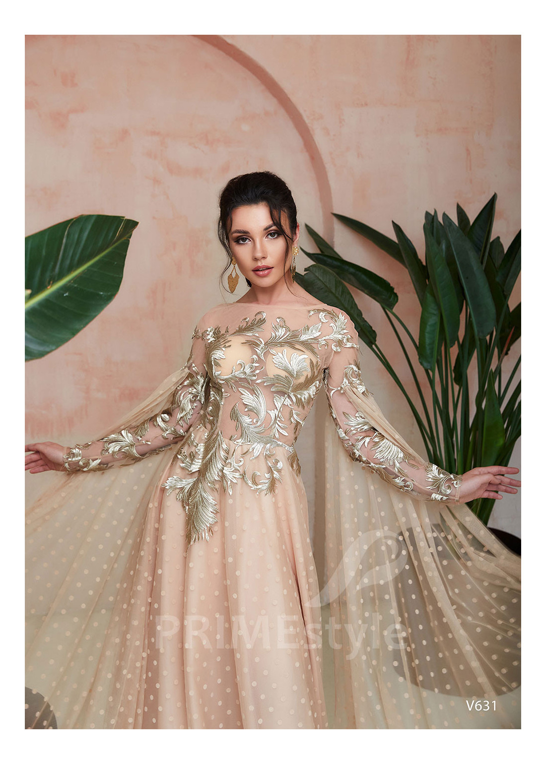 Moderné spoločenské šaty s priesvitným korzetom, dlhými rukávmi s vlečkou a pekne tvarovanou padavou sukňou. Korzet a horná časť sukne sú zdobené čipkou s veľkým trendovým vzorom. Vhodné aj ako šaty na stužkovú, šaty na svadbu, popolnočné šaty a šaty pre svadobné mamy.