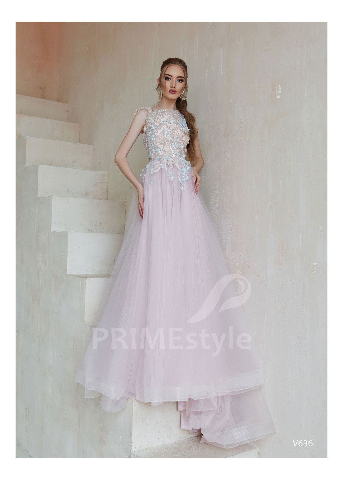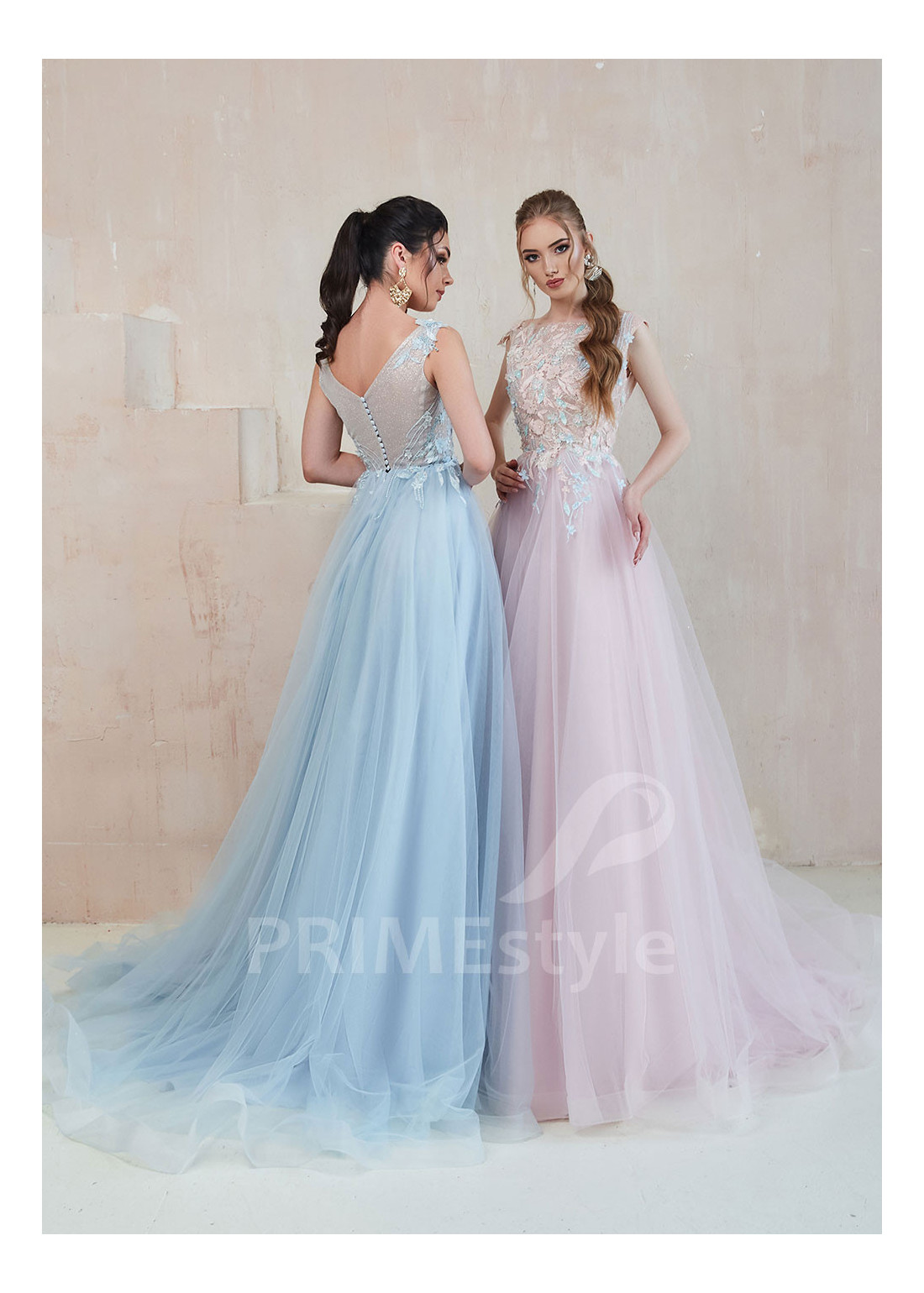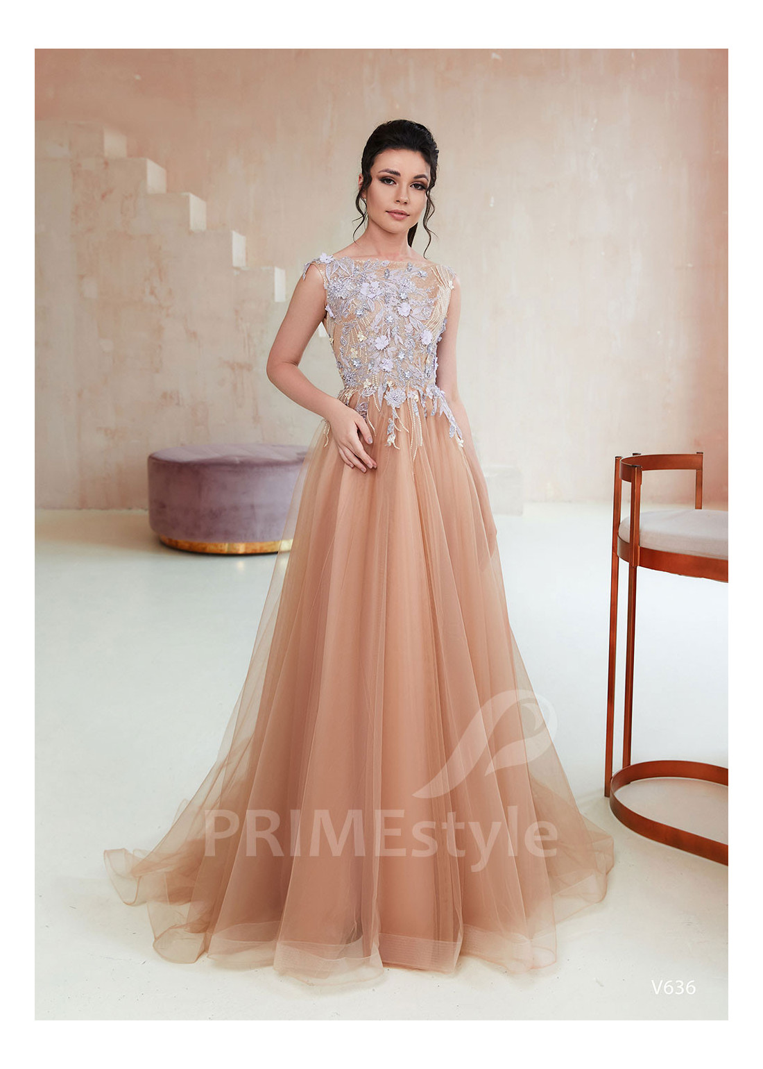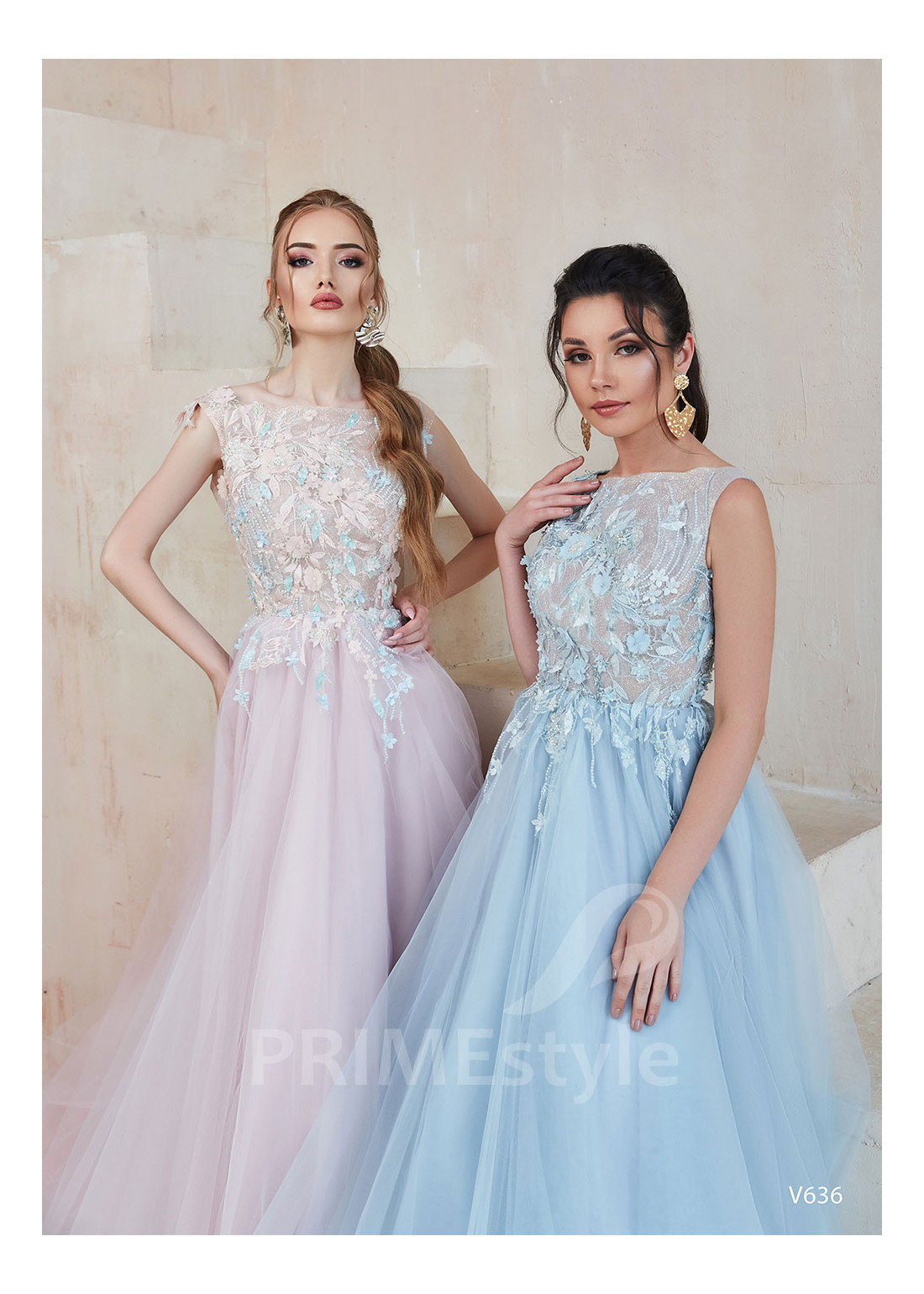 Jemné romantické spoločenské šaty s lodičkovým výstrihom, mierne otvoreným chrbtom a s ľahkou padavou tylovou sukňou. Korzet a horná časť sukne sú dekorované bohatou vyšívanou čipkou. Vhodné aj ako šaty na ples, šaty na svadbu, popolnočné šaty a šaty pre svadobné mamy.