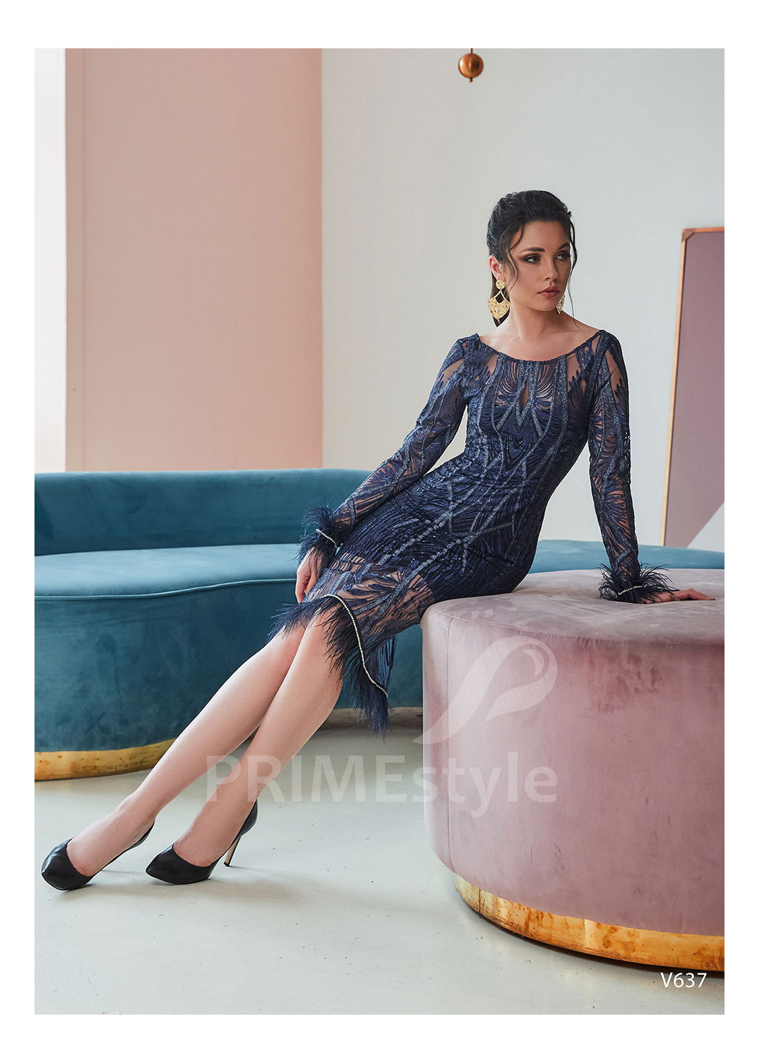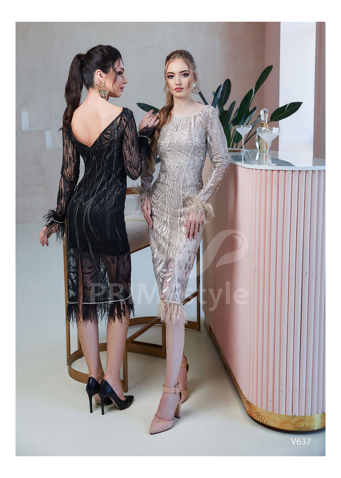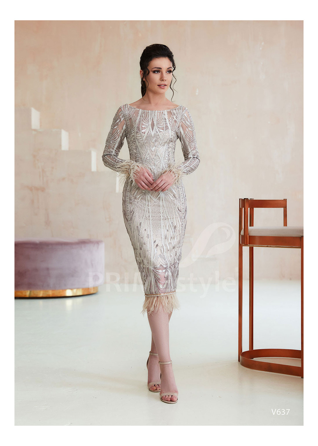 Efektné celočipkované spoločenské šaty s dlhým rukávom, lodičkovým výstrihom na hrudi, odhaleným chrbtom a elegantnou priliehavou sukňou. Okraje rukávov a sukne sú dekorované pierkami. Vhodné aj ako šaty na ples, šaty na stužkovú, šaty na svadbu a popolnočné šaty.