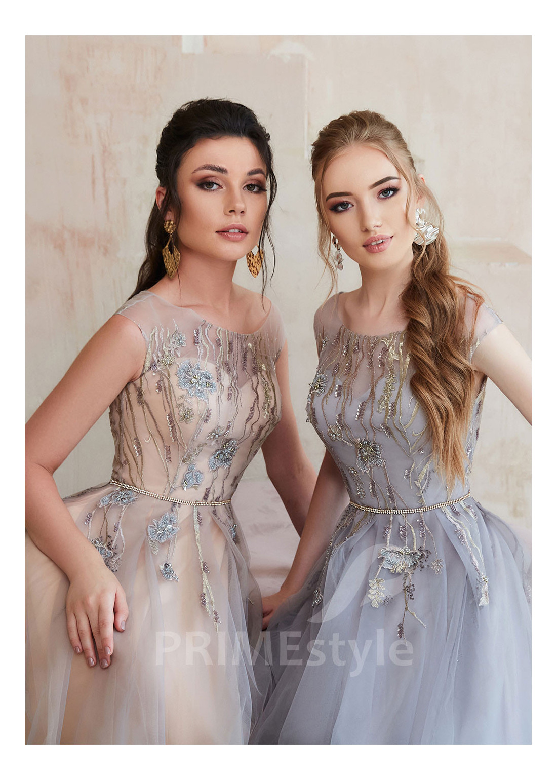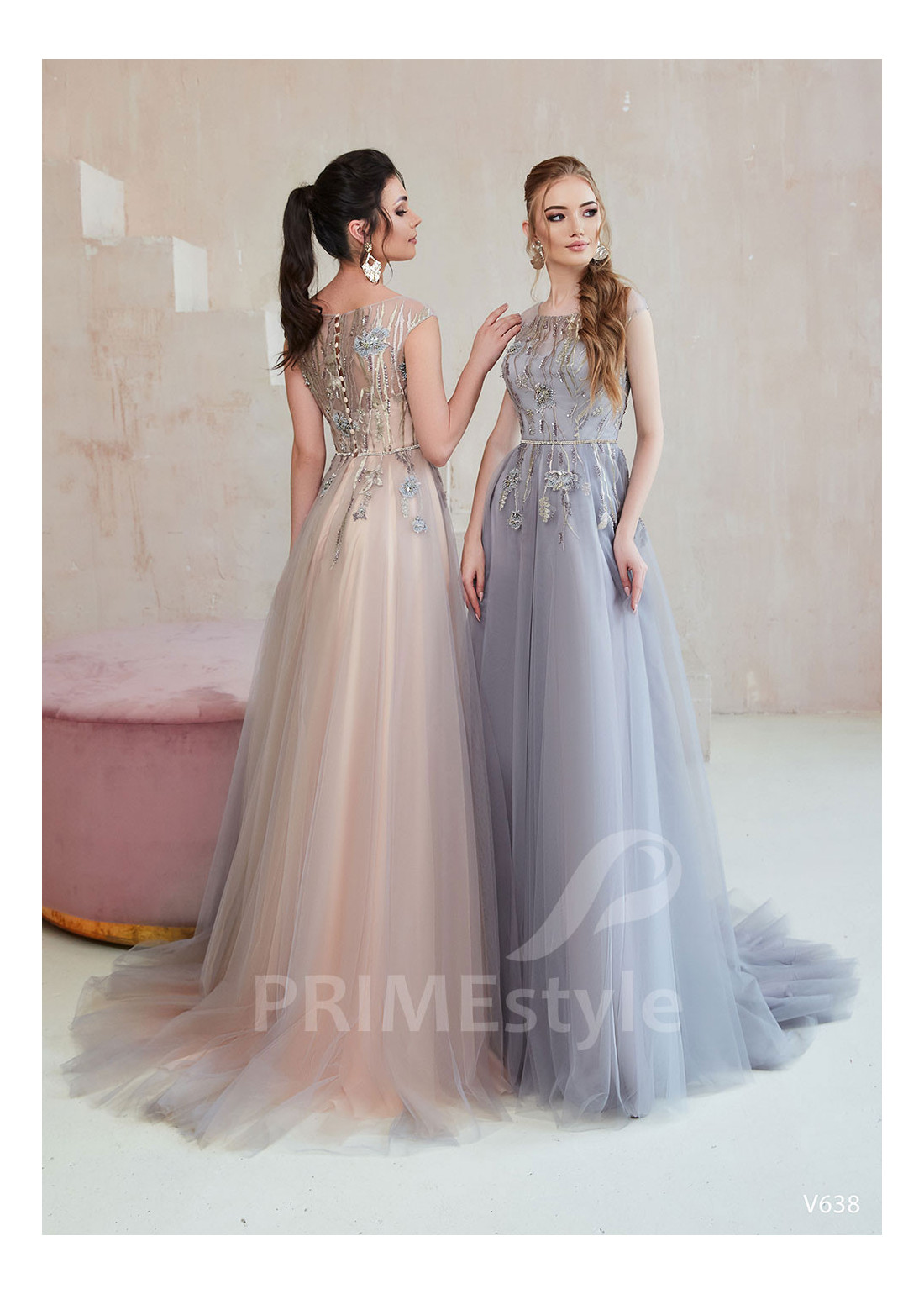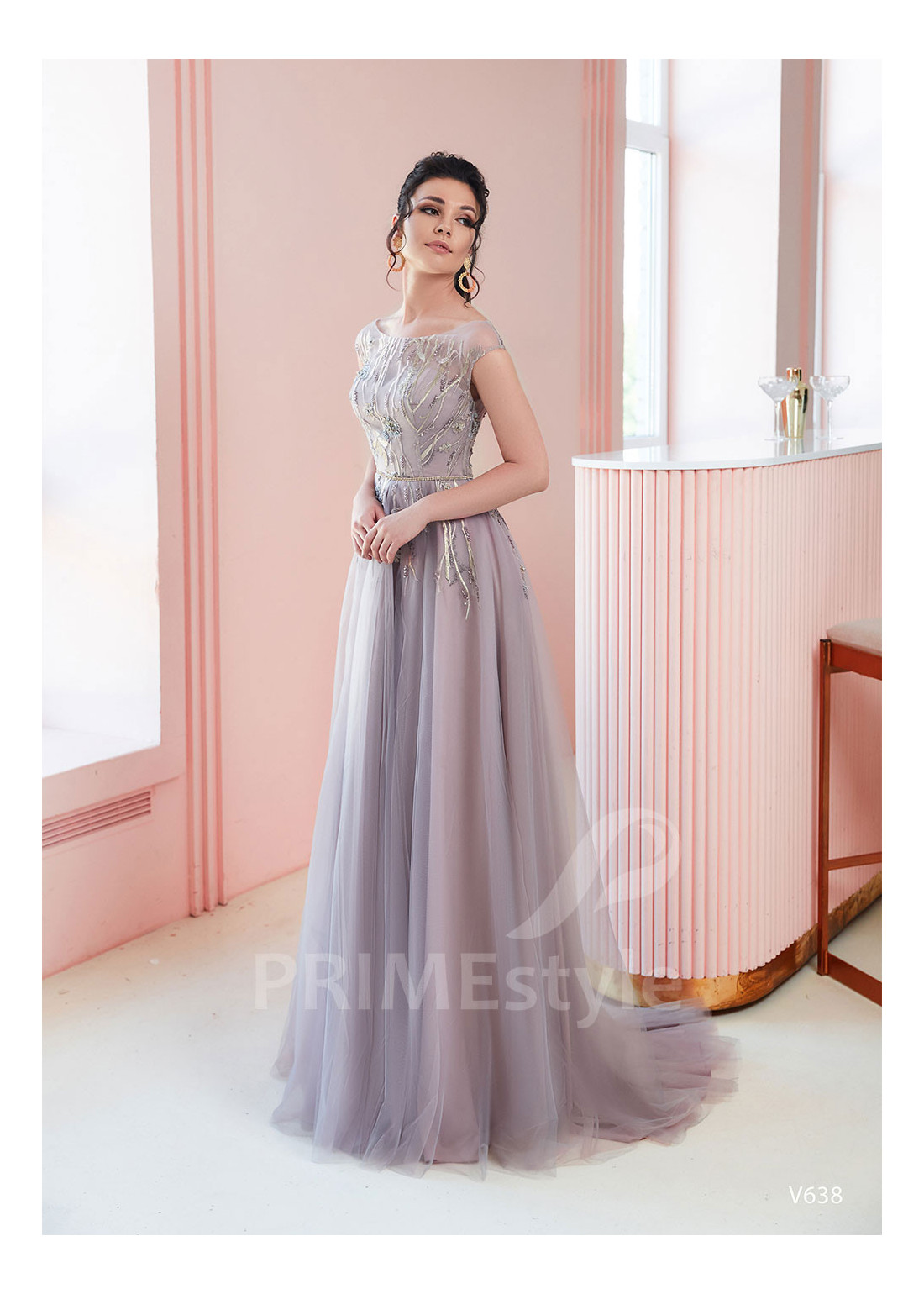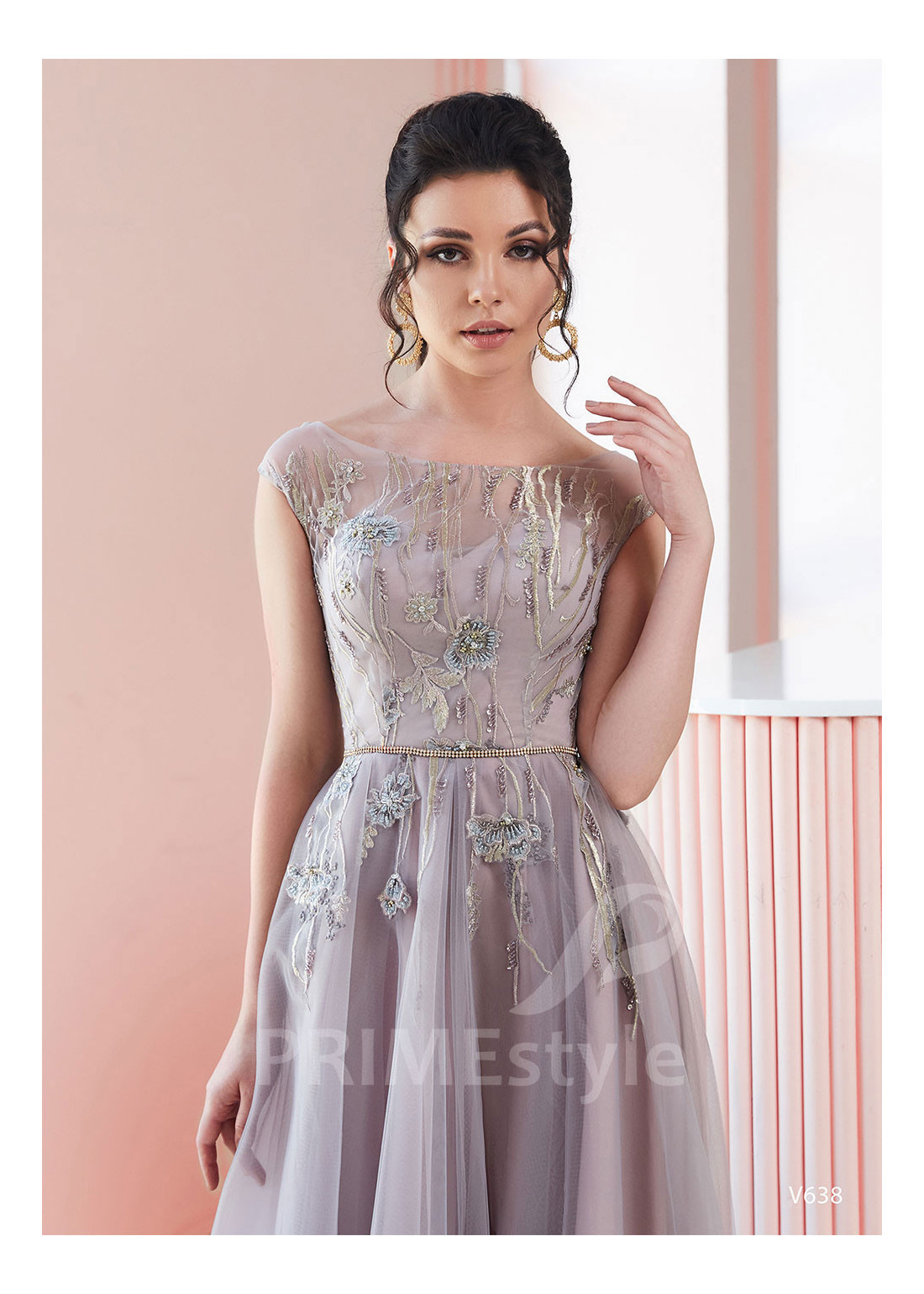 Jemné tylové spoločenské šaty so srdiečkovým výstrihom na hrudi a vzdušnou tylovou sukňou. Korzet a horná časť sukne sú dekorované nežnou vyšívanou čipkou. Vhodné aj ako šaty na ples, šaty na stužkovú, popolnočné šaty a šaty pre svadobné mamy.