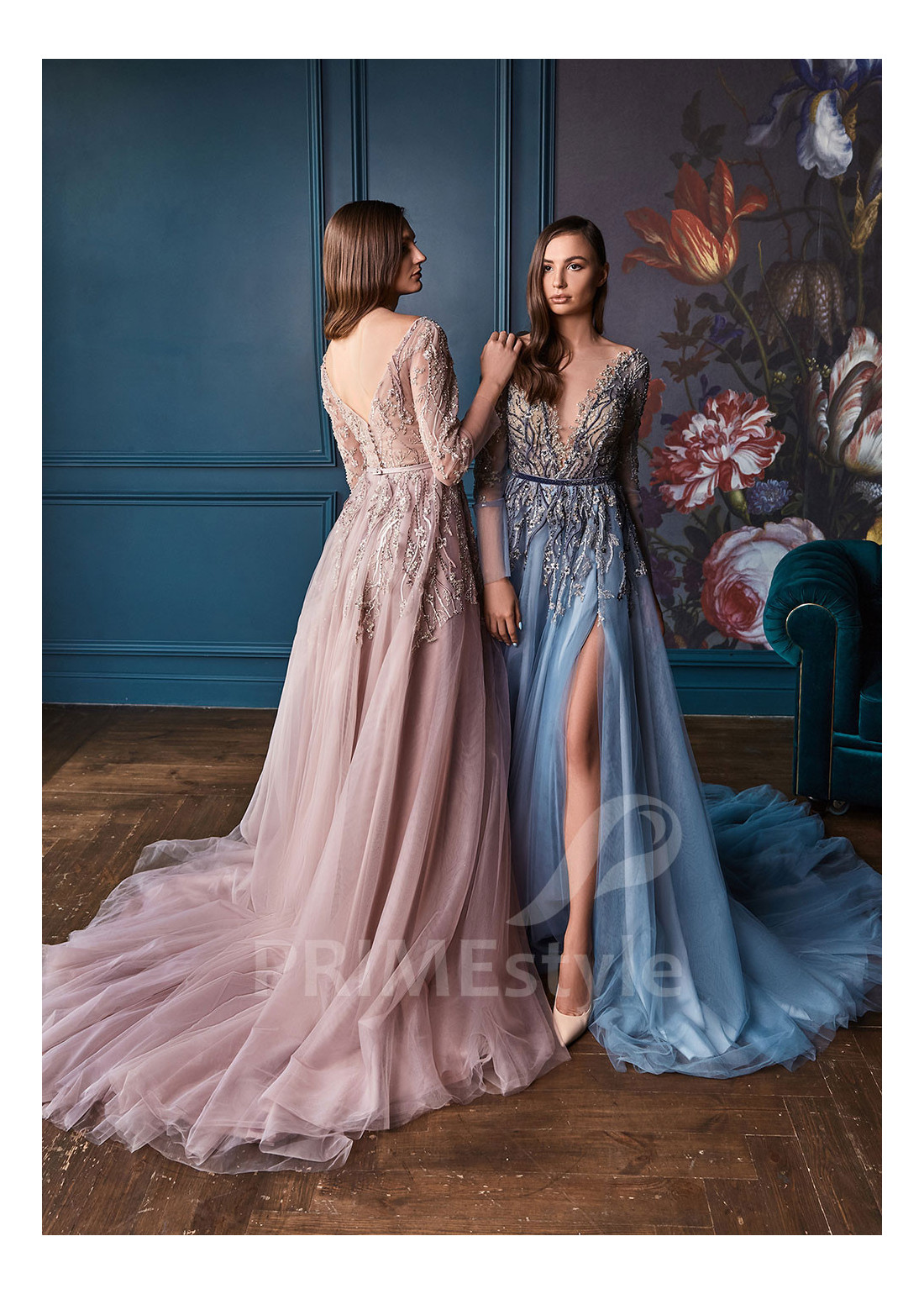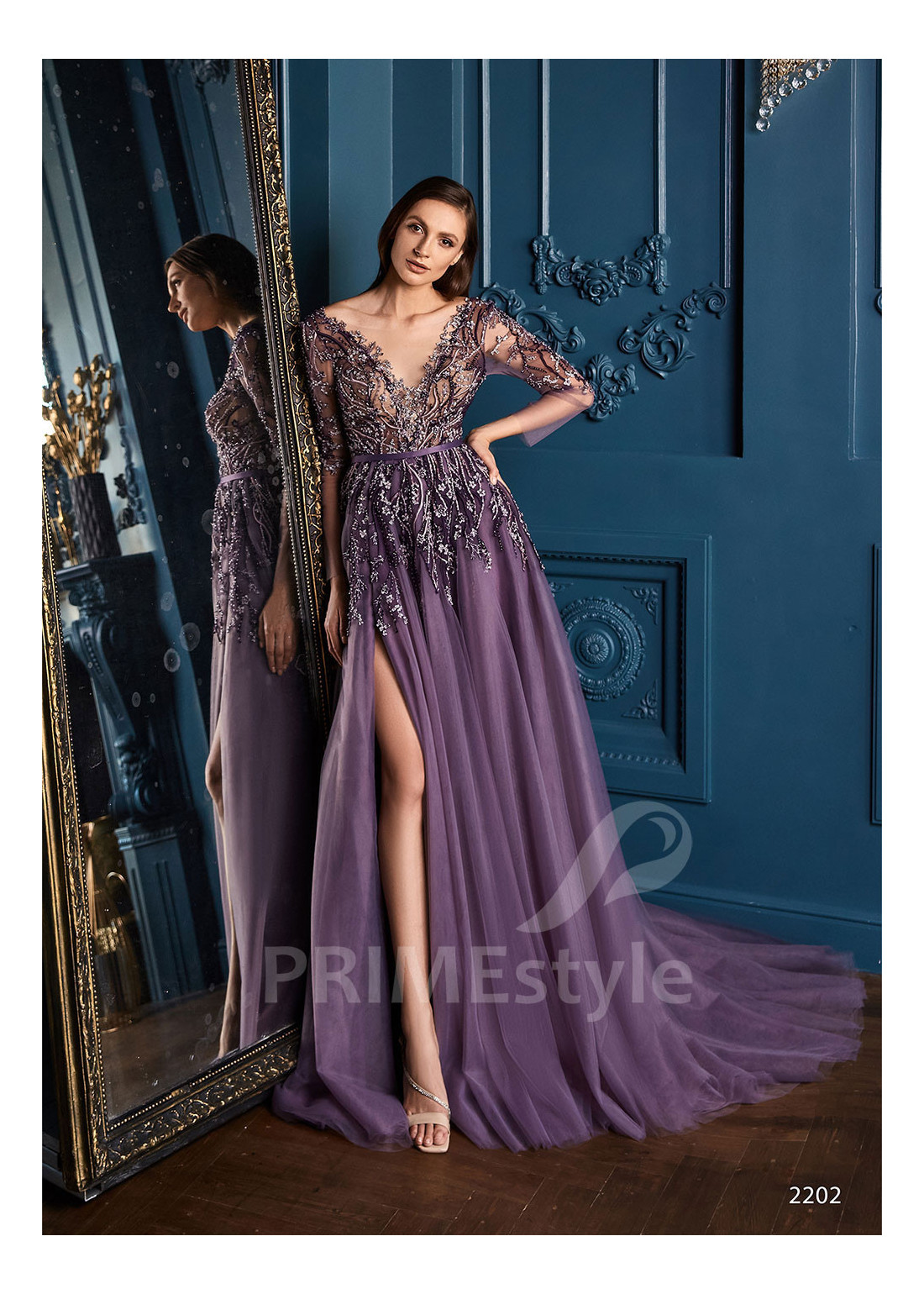 Spoločenské šaty s dlhým rukávom, výstrihom do V-čka, mierne odhaleným chrbtom a s ľahkou padavou tylovou sukňou s rázporkom na ľavej nohe. Korzet a horná časť sukne sú zdobené bohatou vyšívanou čipkou. Vhodné aj ako šaty na stužkovú, popolnočné šaty a šaty pre svadobné mamy.
