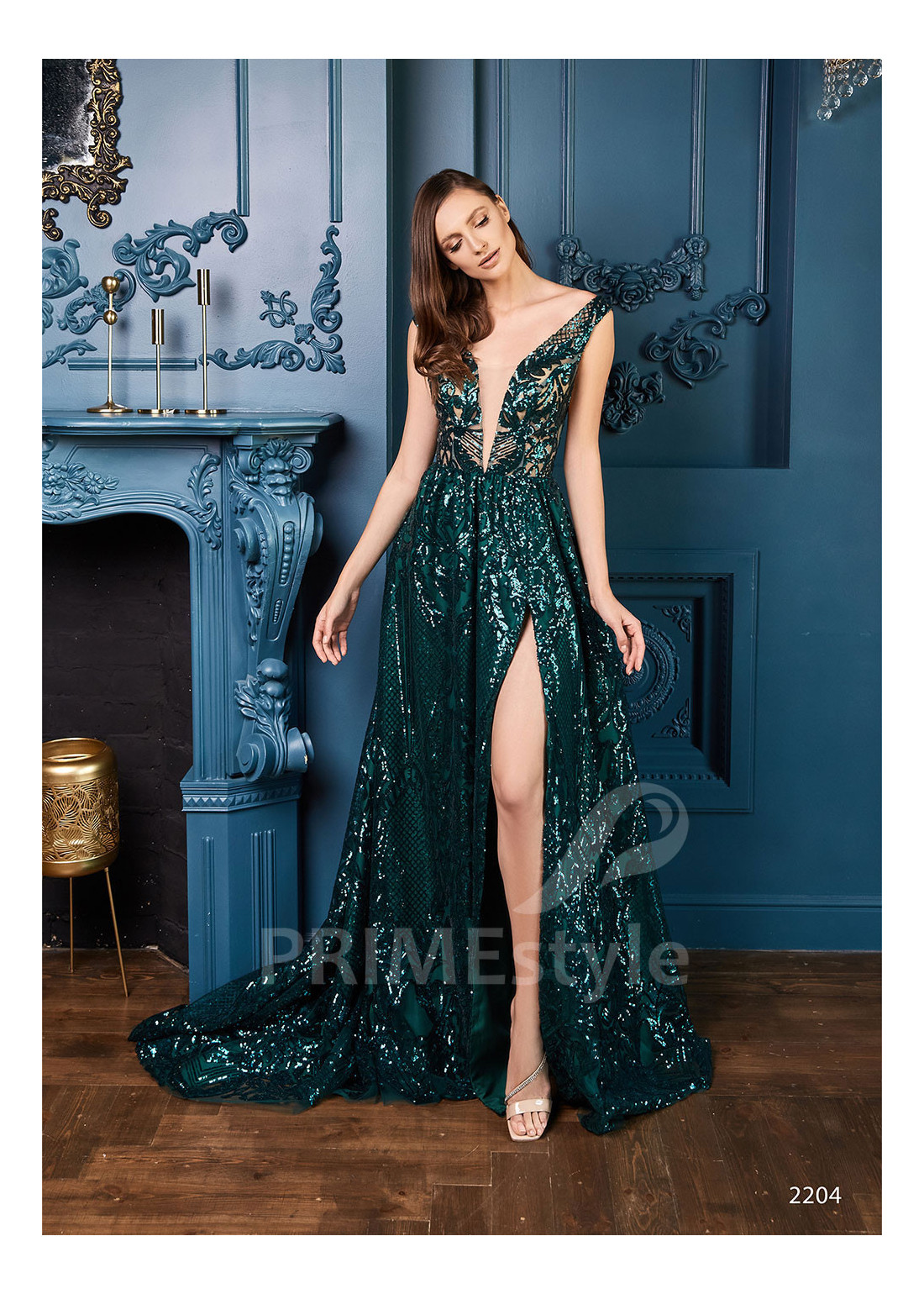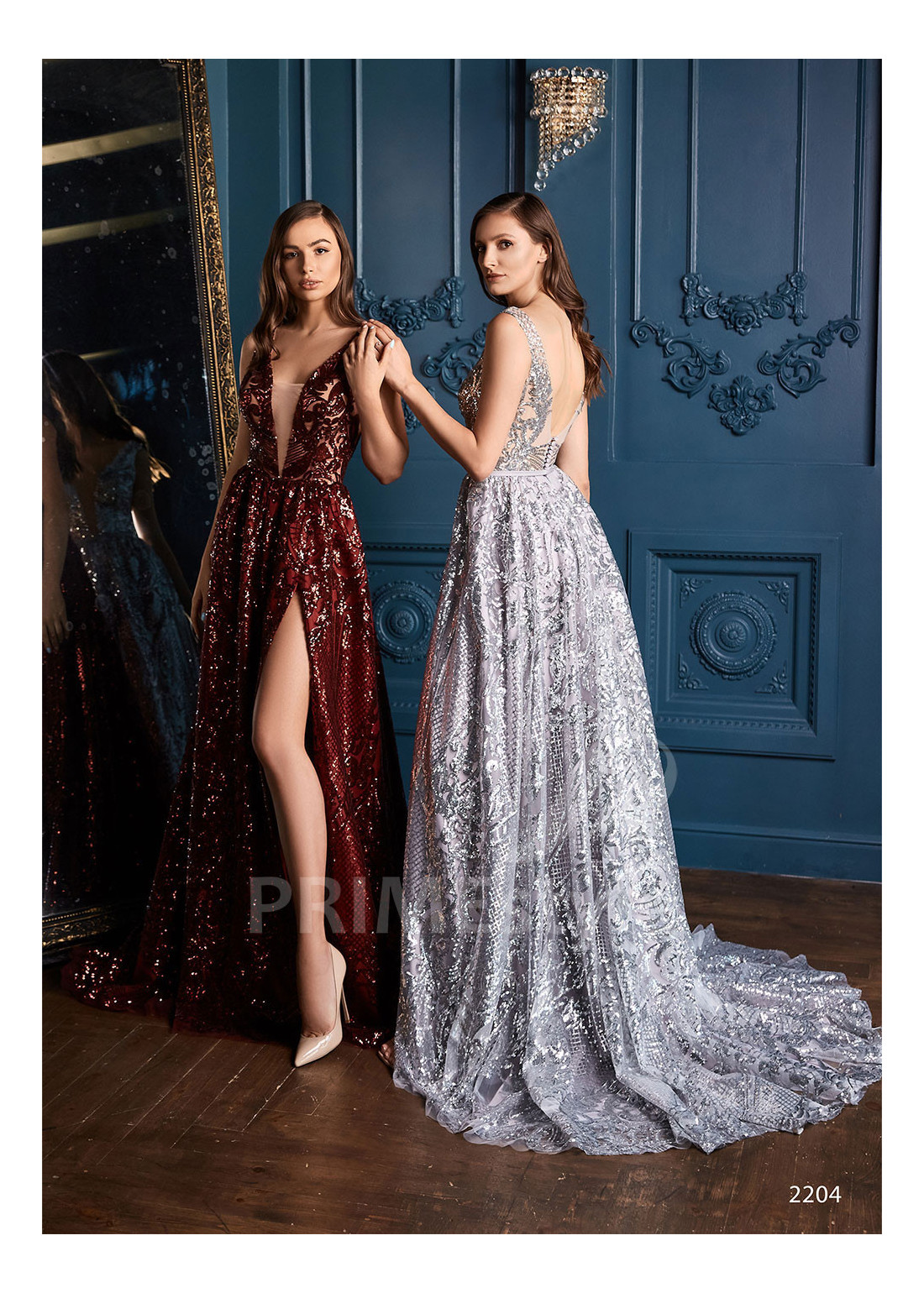 Extravagantné celotrblietavé spoločenské šaty s hlbokým V-výstrihom na hrudi, odhaleným chrbtom a efektnou padavou sukňou s rázporokom na nohe. Vhodné ako šaty na ples, šaty na stužkovú a popolnočné šaty.