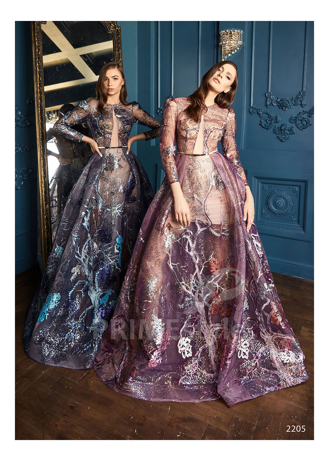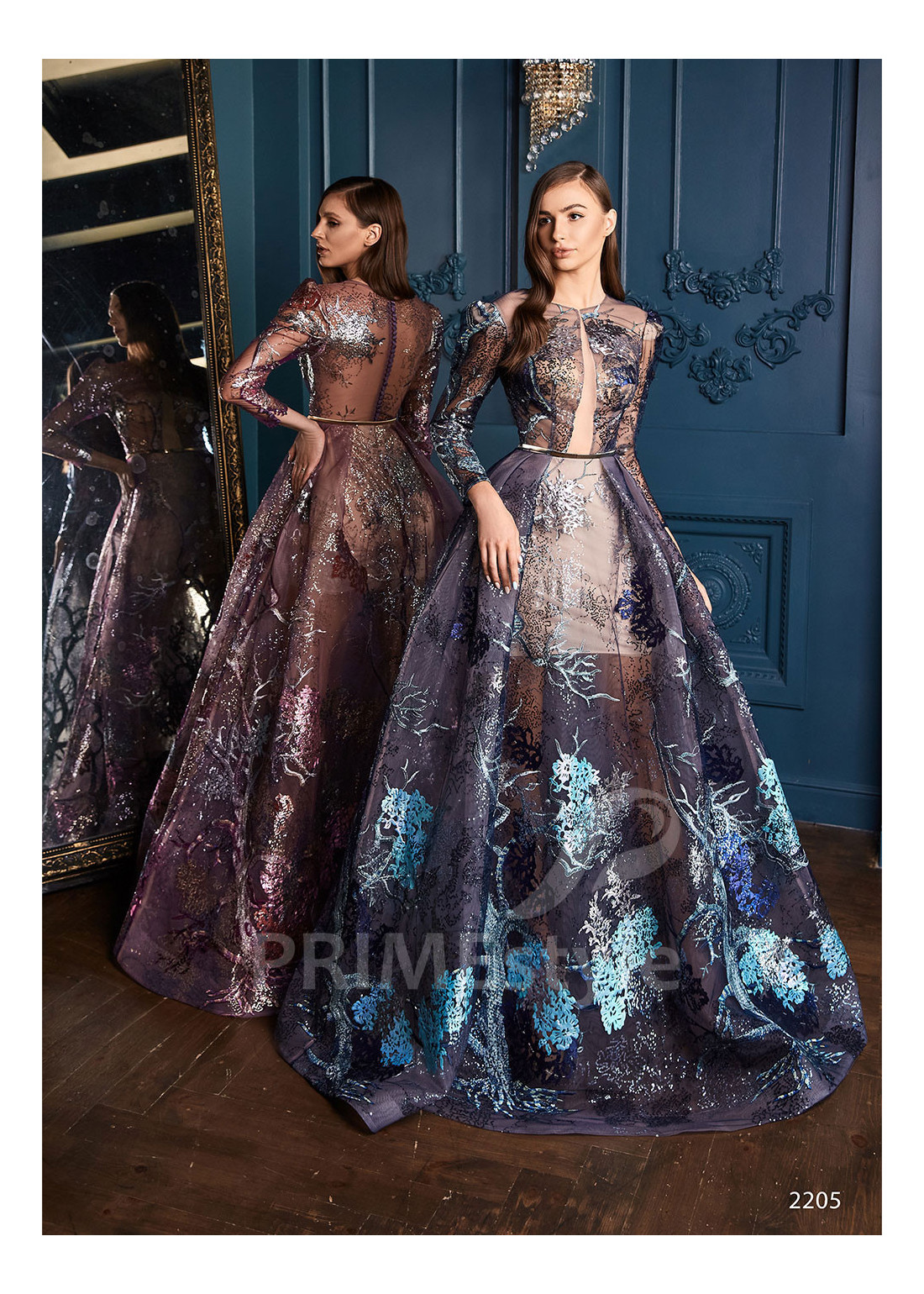 Luxusné trblietavé spoločenské šaty s dlhým rukávom, zatvoreným dekoltom, zahaleným chrbtom a s objemnou sukňou z tvrdej sieťky, ukončenej lemom. Vhodné ako šaty na ples, šaty na stužkovú a popolnočné šaty.