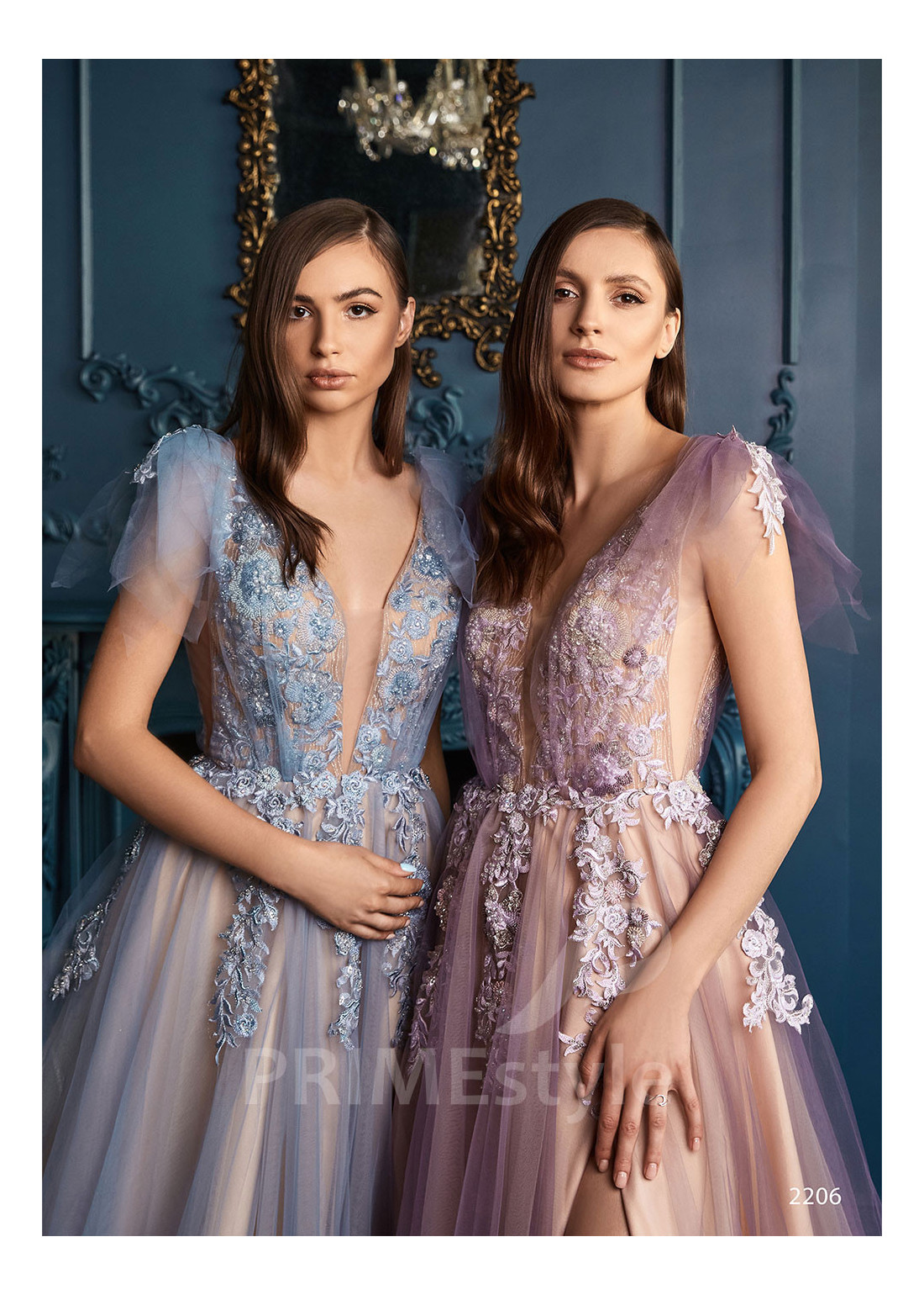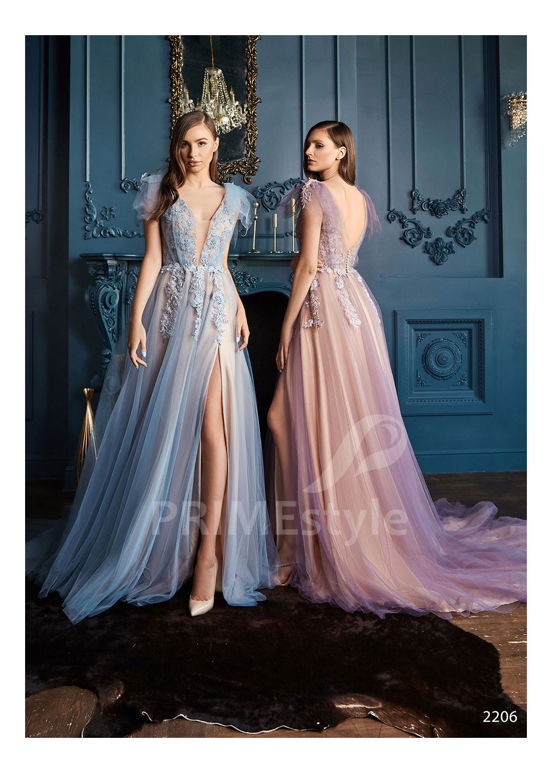 Romantické tylové spoločenské šaty s výstrihom do V-čka, odhaleným chrbtom a ľahjou padavou sukňou s rozparkom na ľavej nohe. Korzet a horná časť sukne sú dekorované bohatou vyšívanou čipkou s 3D kvetmi. Vhodné aj ako šaty na ples, šaty na svadbu, popolnočné šaty a šaty pre svadobné mamy.