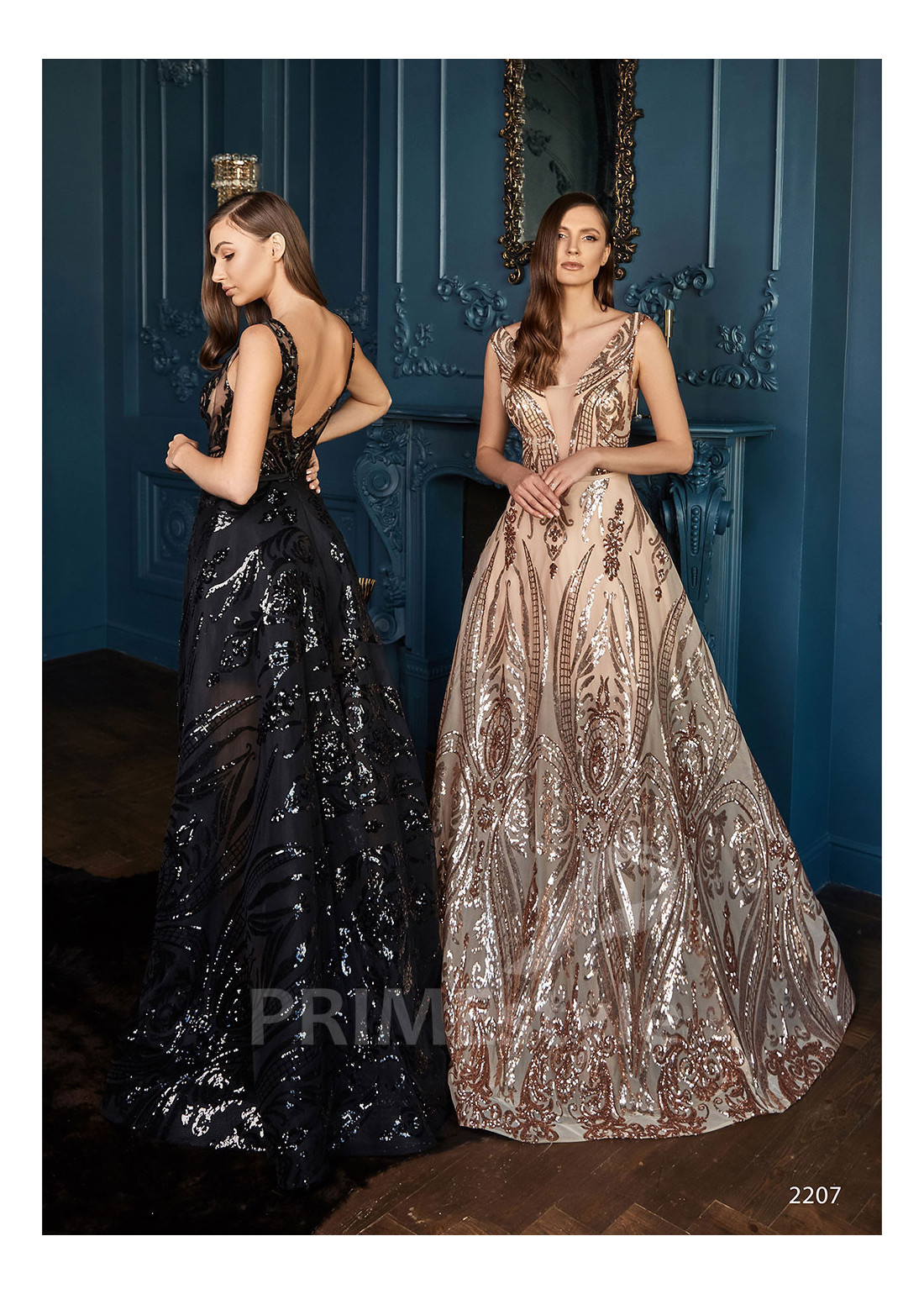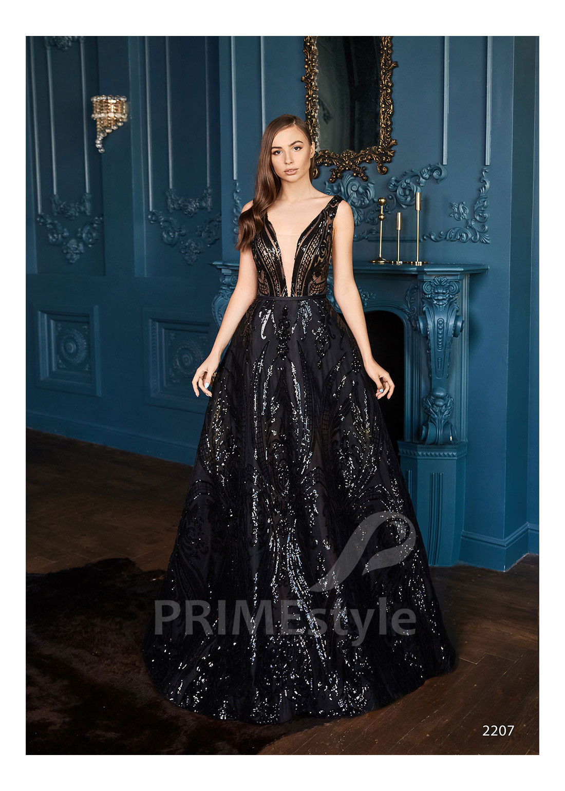 Efektné slávnostné spoločenské šaty s otvoreným dekoltom, hlbokým výstrihom do V-čka, odhaleným chrbtom a objemnou trblietavou A-čkovou sukňou. Vhodné ako šaty na ples, šaty na stužkovú a popolnočné šaty.