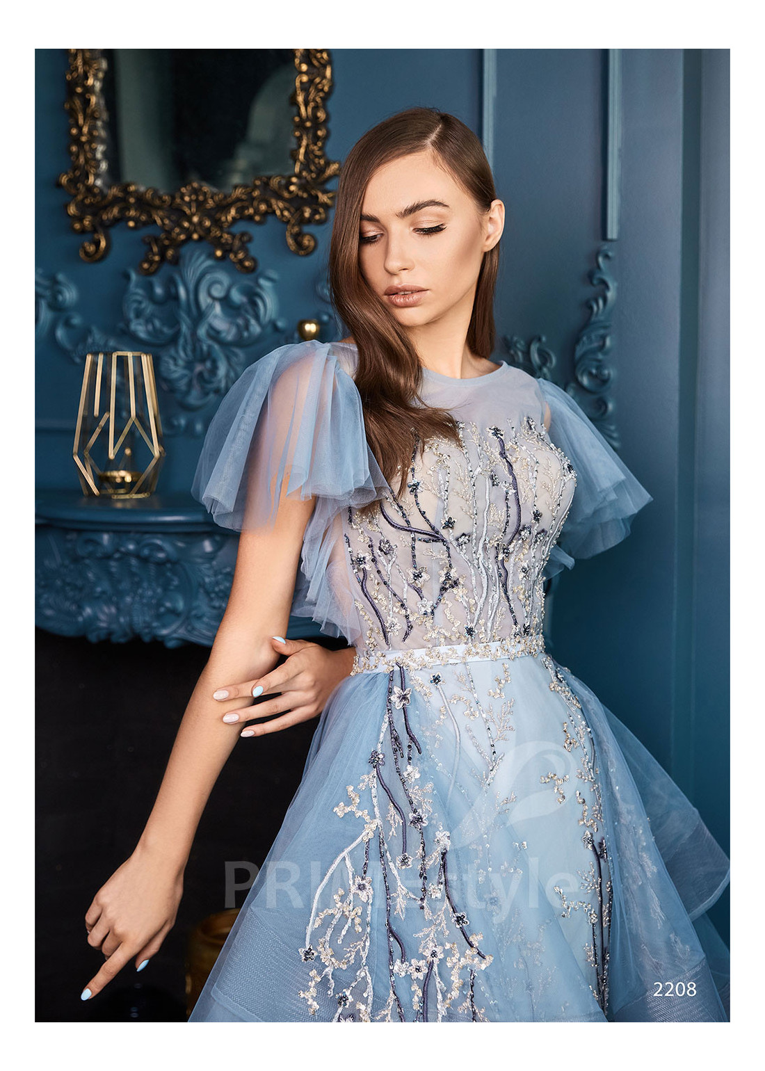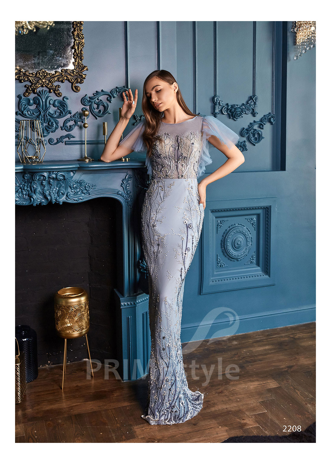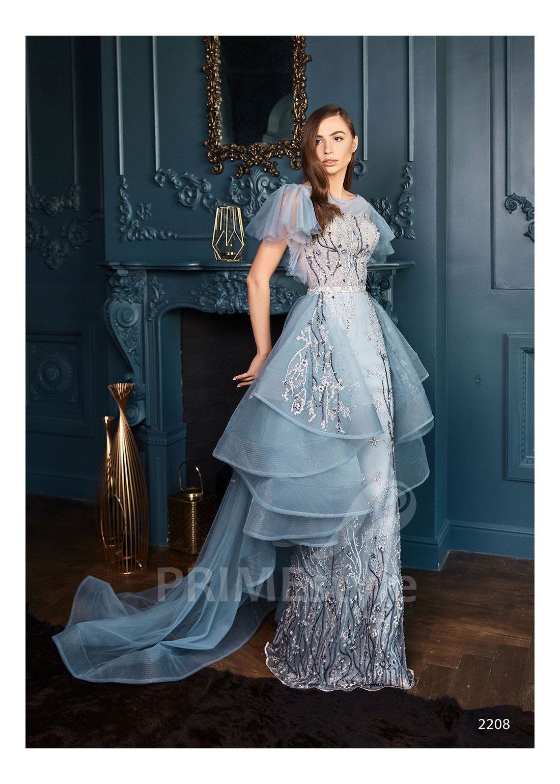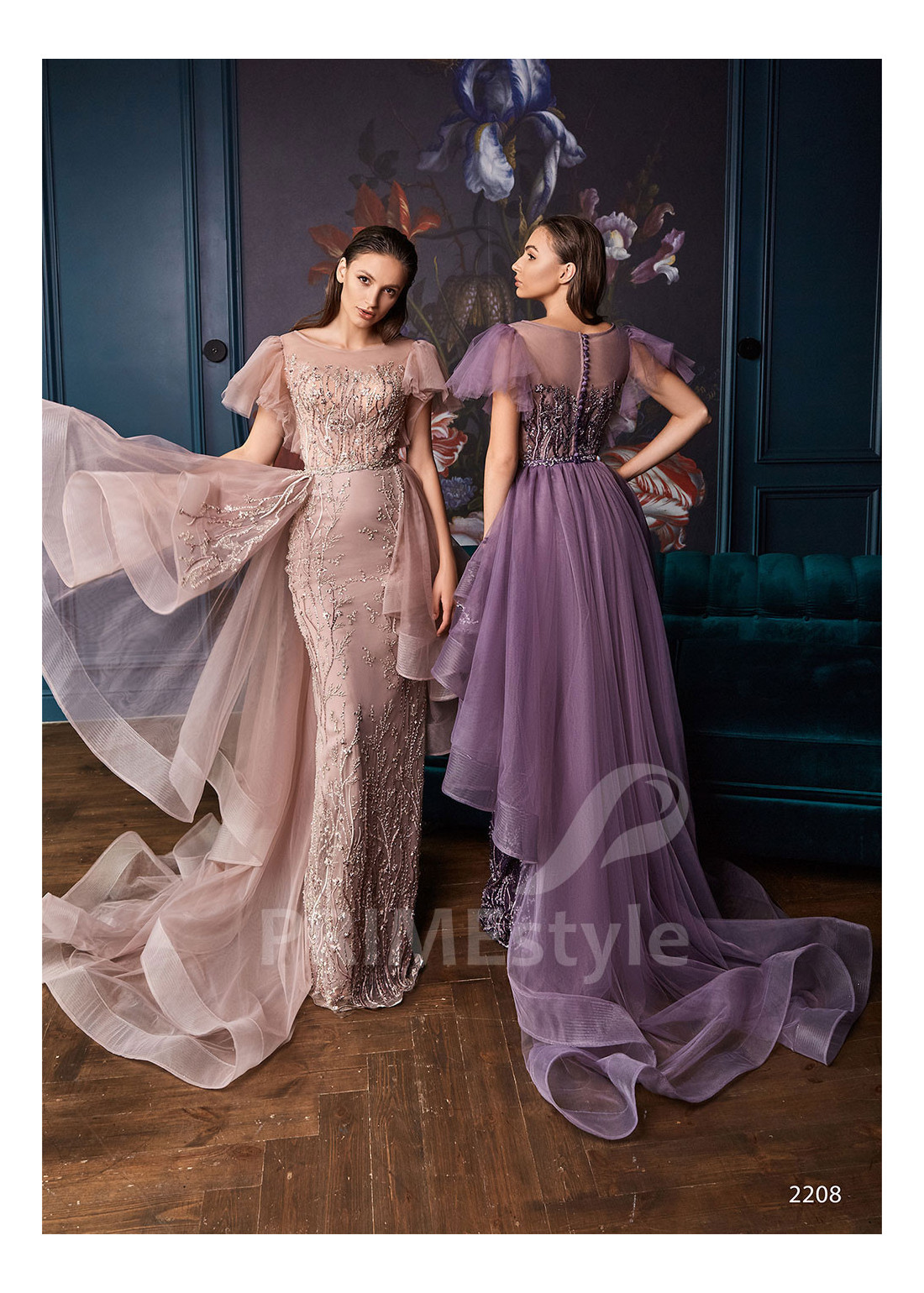 Originálne celočipkjované 2-dielne spoločenské šaty s krátkymi voľnými rukávmi, zakrytým dekoltom a úzkou bohato zdobenou sukňou. Súčasťou šiat je aj samostatná odpojiteľná asymetrická vllečka. Vhodné aj ako šaty na stužkovú a popolnočné šaty.
