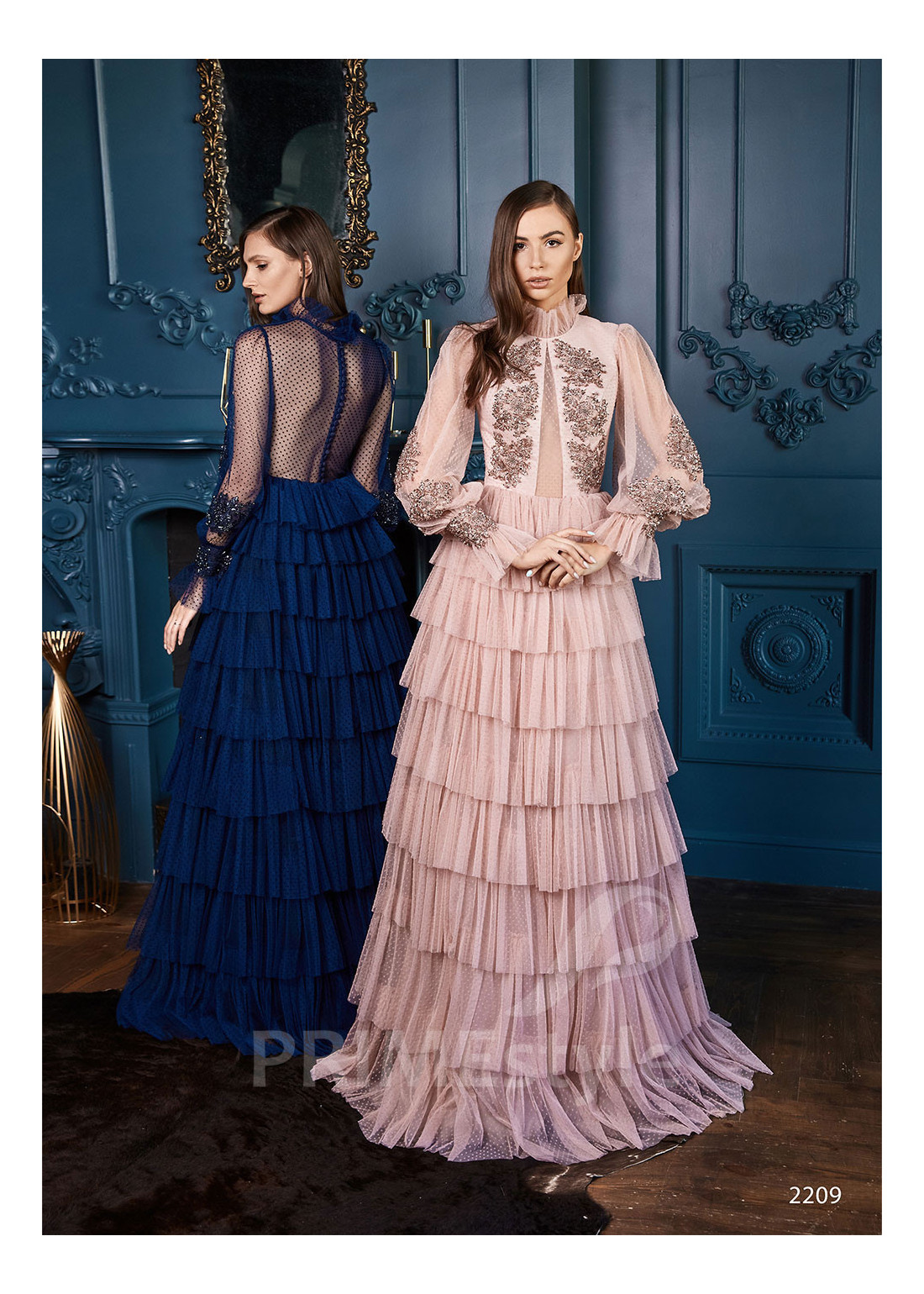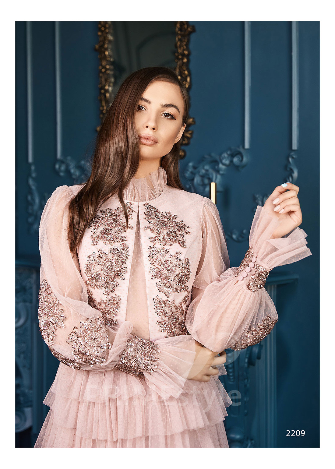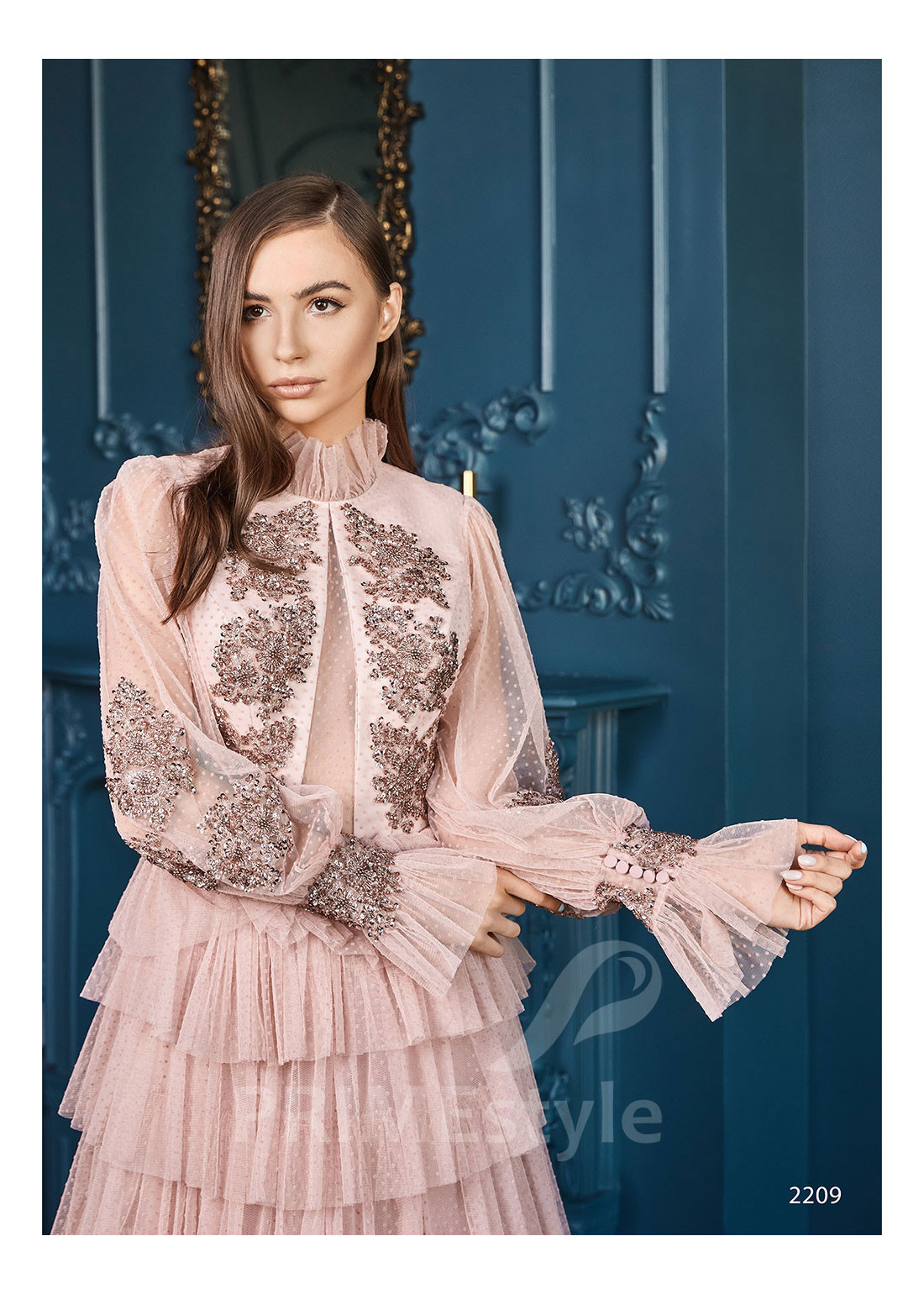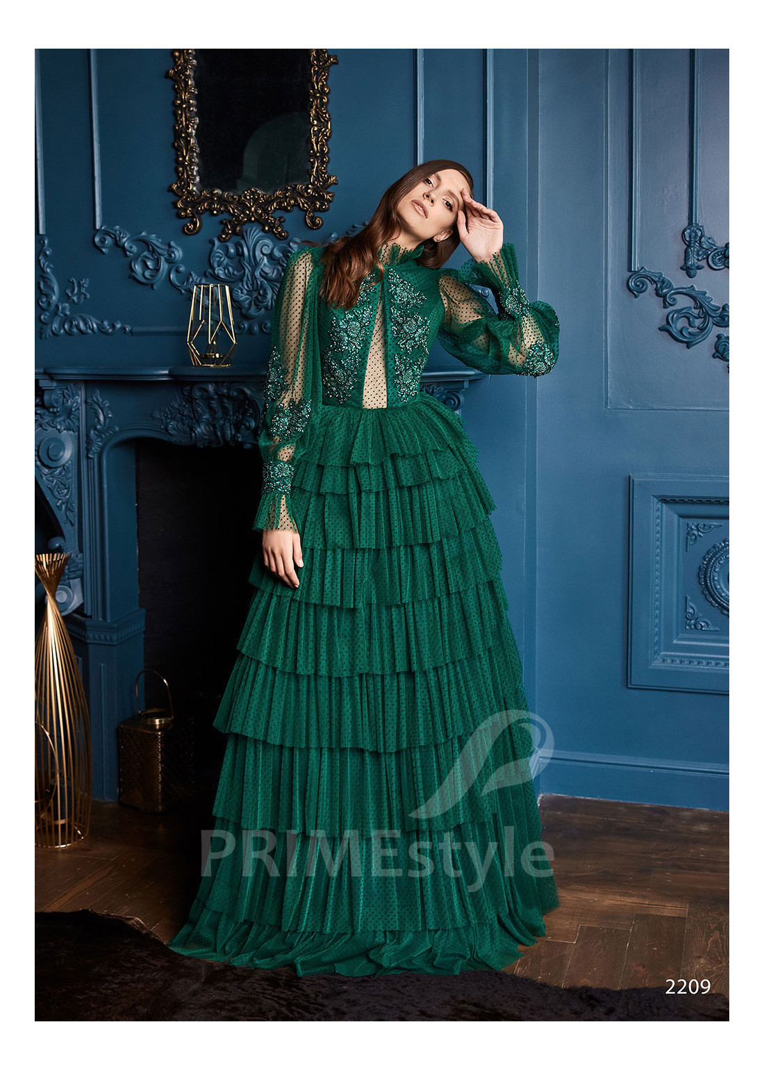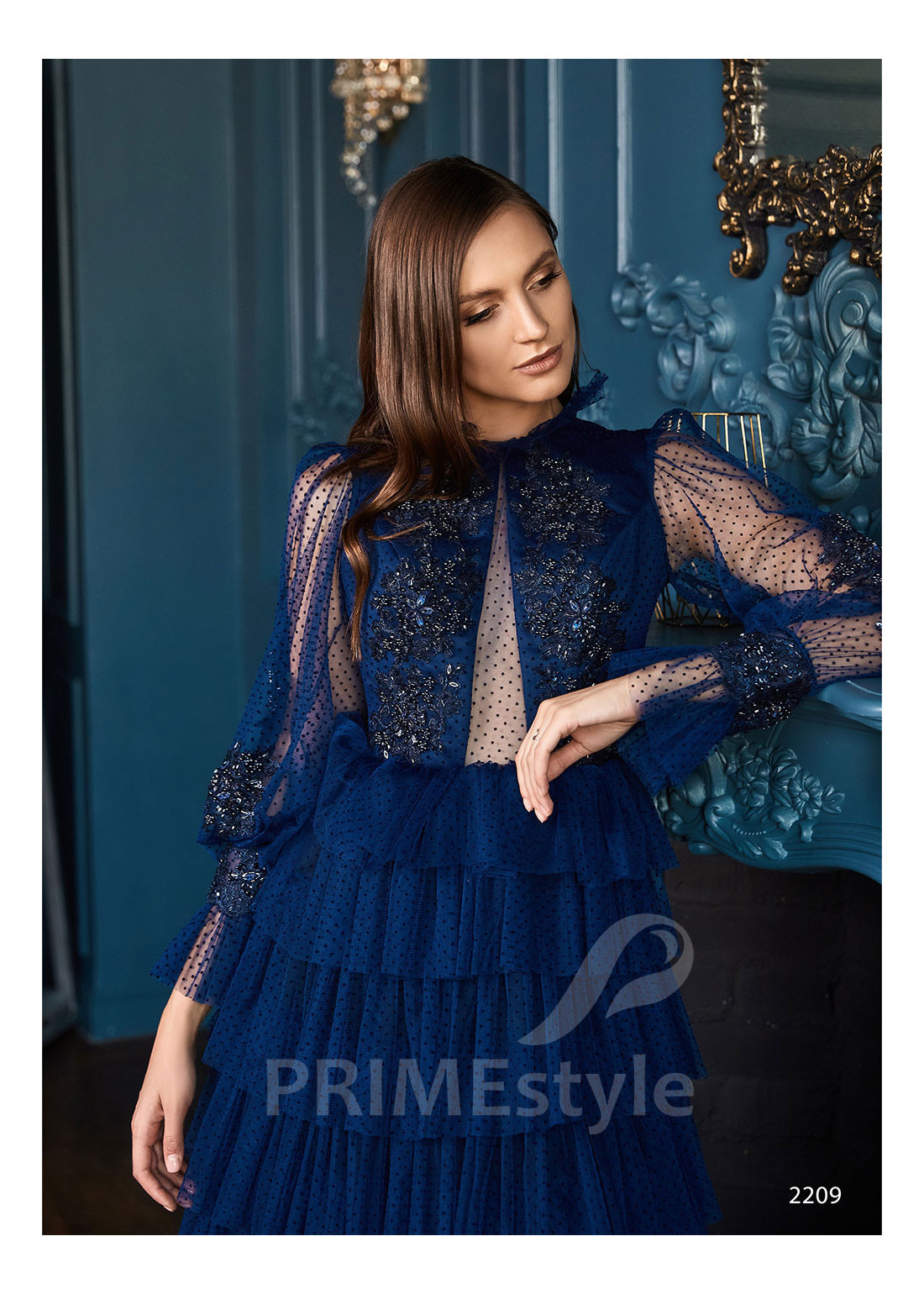 Romantické spoločenské šaty s dlhým rukávom, zakrytým dekoltom až po krk, chrbtom prekrytým priesvitnou sieťkou, širokými originálne tvarovanými rukávmi a s efektnou vrstvenou sukňou. Vhodné aj ako šaty na ples a šaty na stužkovú.