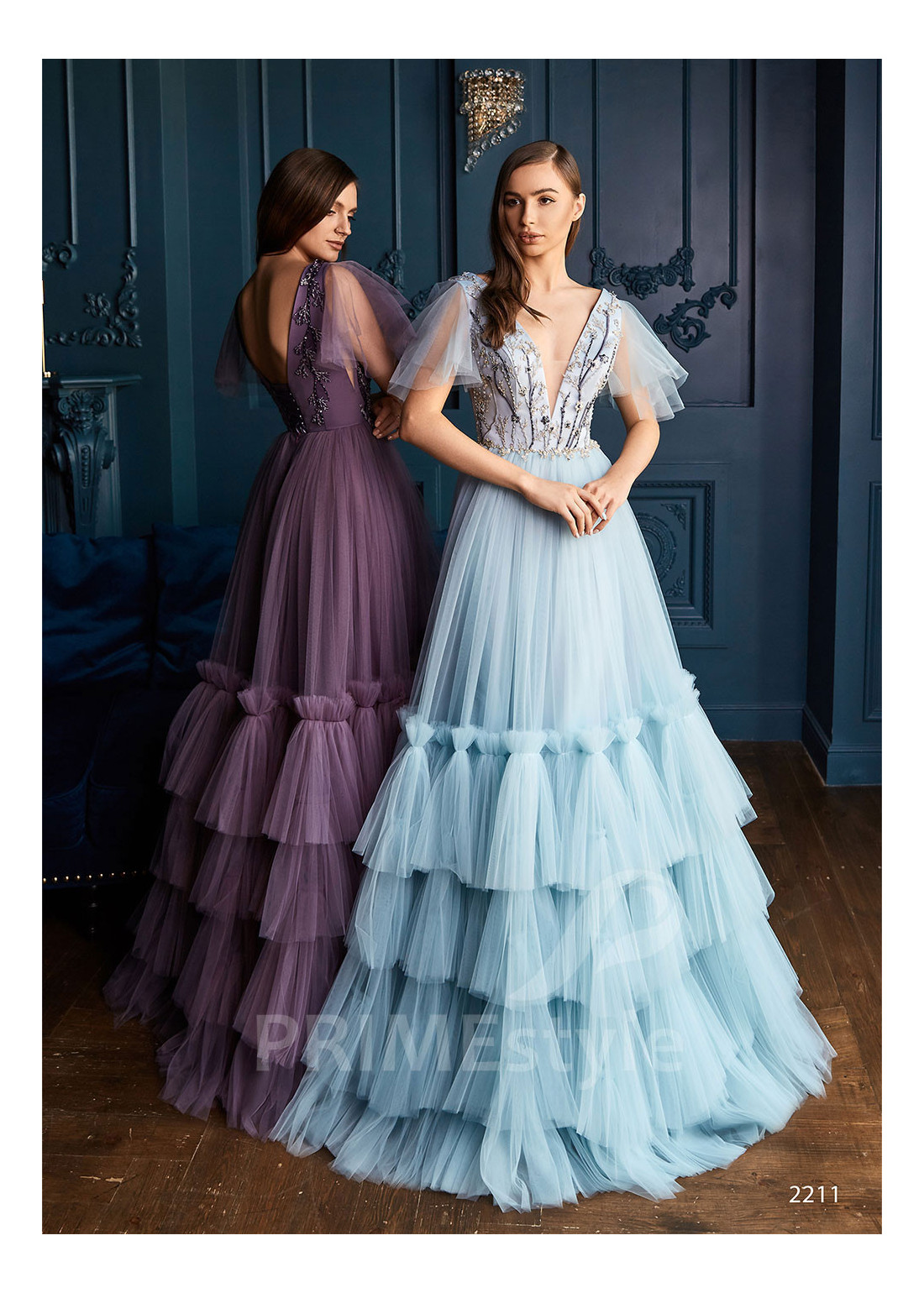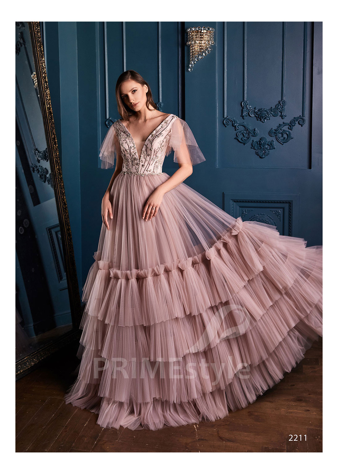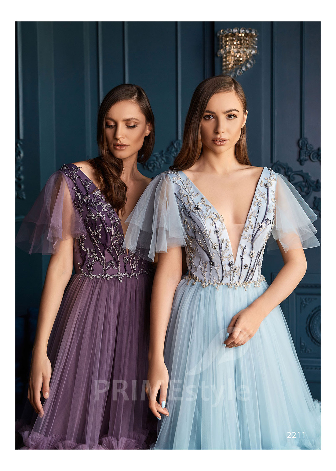 Luxusné spoločenské šaty s krátkymi voľnými rukávmi, hlbokým V-výstrihom na hrudi, odhdaleným chrbtom a s bohatou vstvenou tylovou sukňou. Korzet je zdobený farebnou vyšívanou čipkou. Vhodné aj ako šaty na ples, šaty na svadbu, popolnočné šaty a šaty pre svadobné mamy.