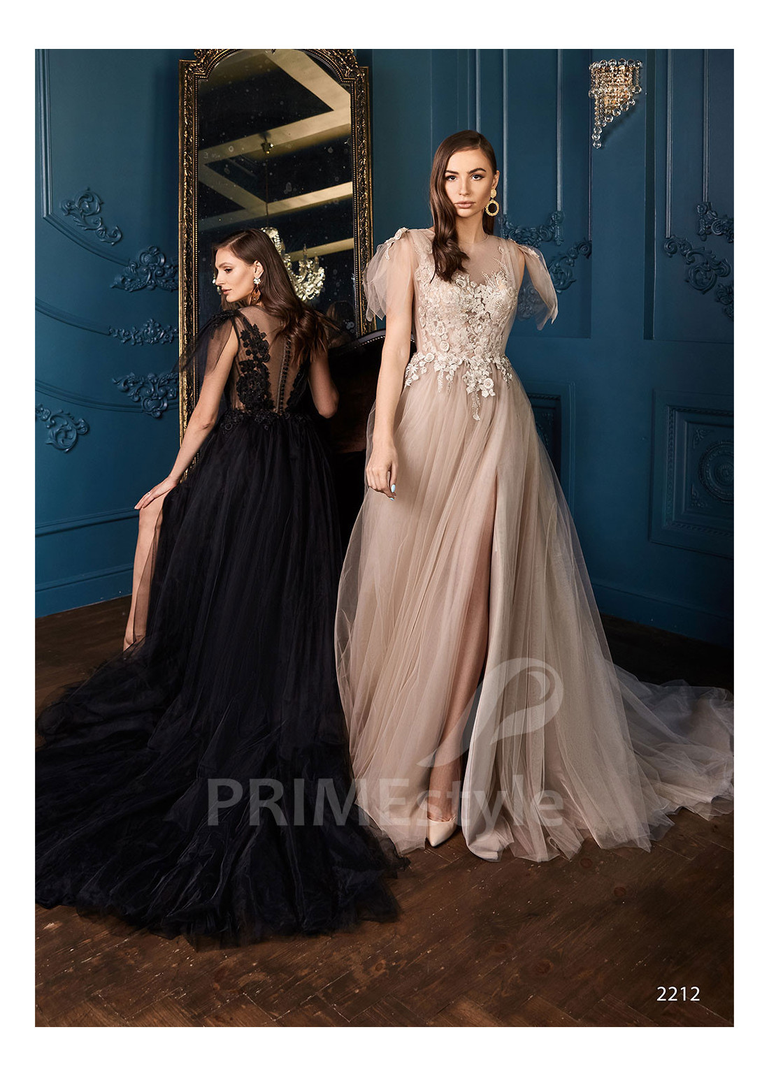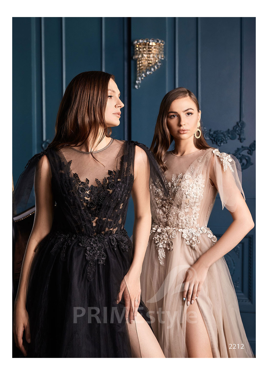 Luxusné tylové spoločenské šaty s otvoreným dekoltom, prekrytým priesvitnou sieťkou a s ľahkou padavou tylovou sukňou s rázporkom na ľavej nohe. Korzet a horná časť sukne sú zdobené rozkošnou vyšívanou čipkou s 3D kvetmi. Vhodné aj ako šaty na stužkovú, šaty na svadbu, popolnočné šaty a šaty pre svadobné mamy.