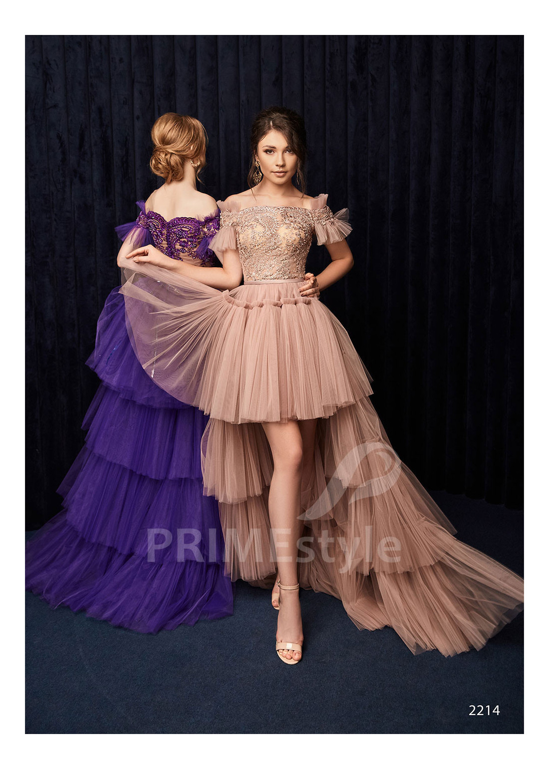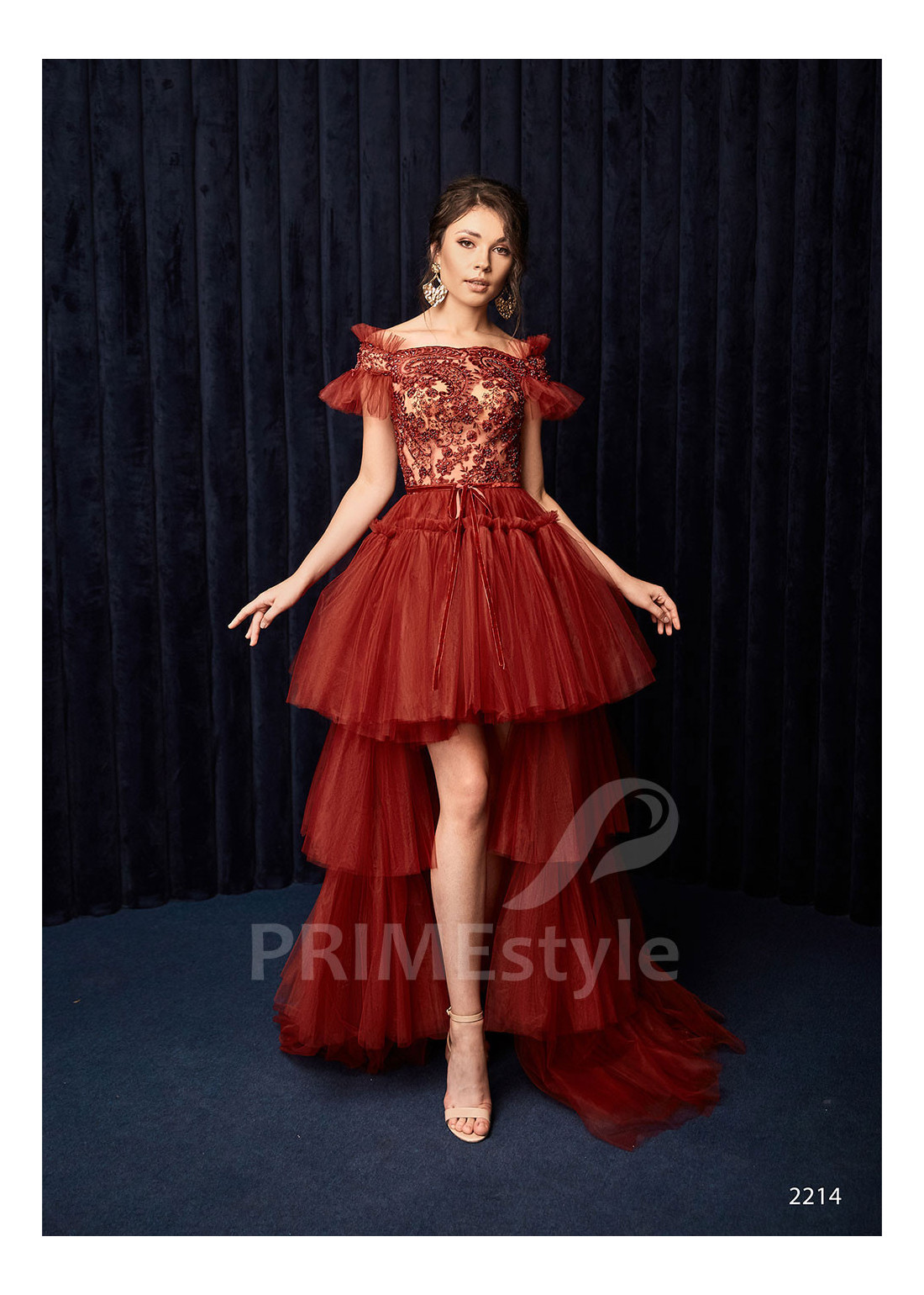 Extravagantné spoločenské šaty s trendovým rovným výstrihom na hrudi, zaujímavo tvarovanými padnutými ramienkami a efektnou krátkou vrstvenou sukňou a so šarmantnou vlečkou. Vhodné ako šaty na ples, šaty na stužkovú a popolnočné šaty.