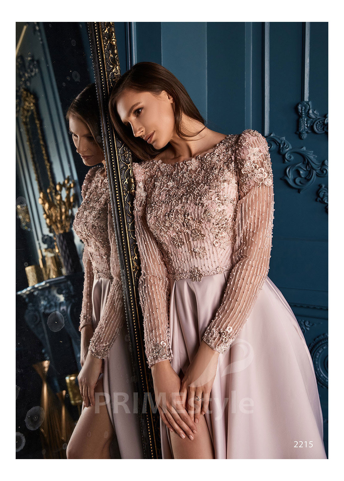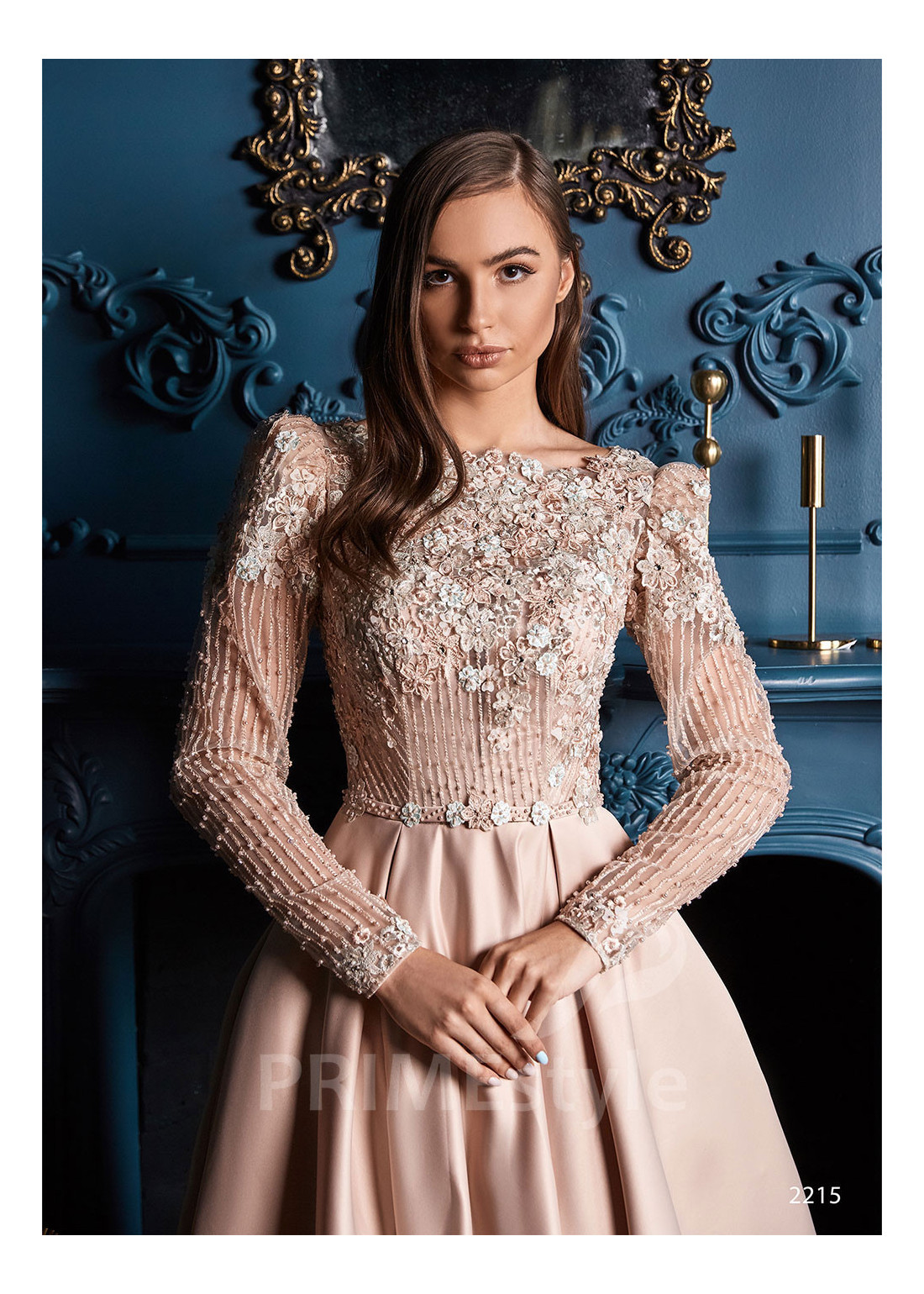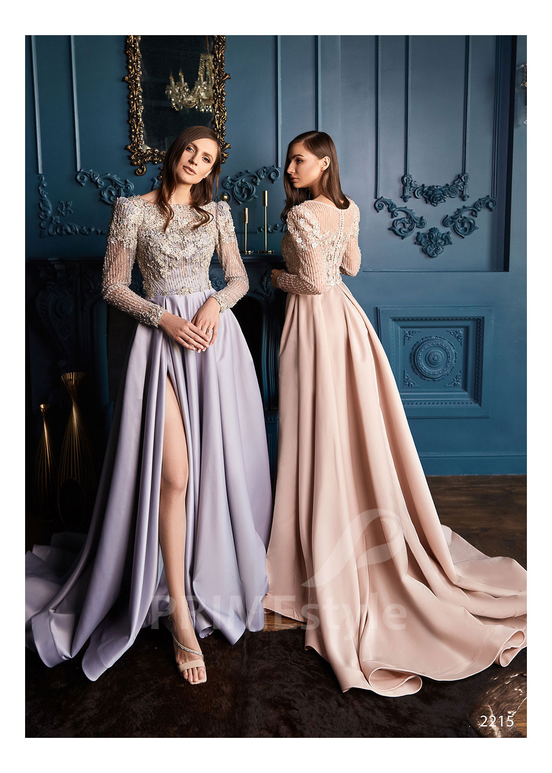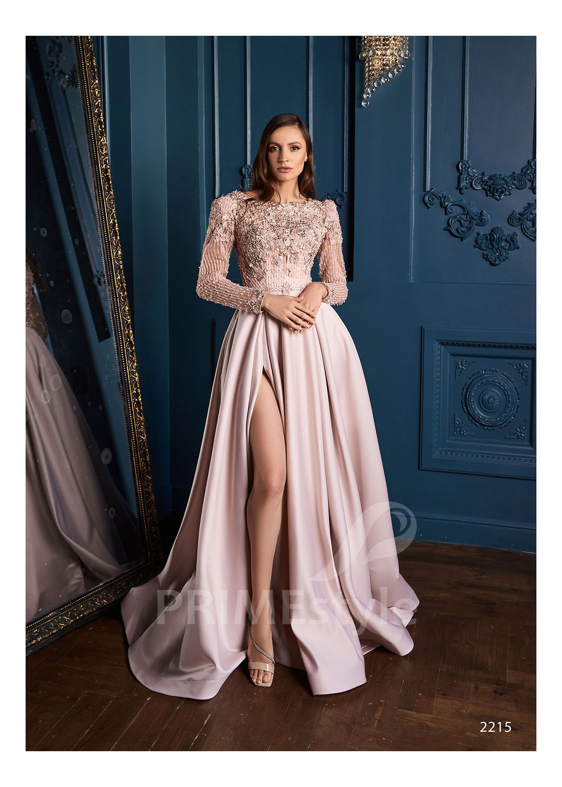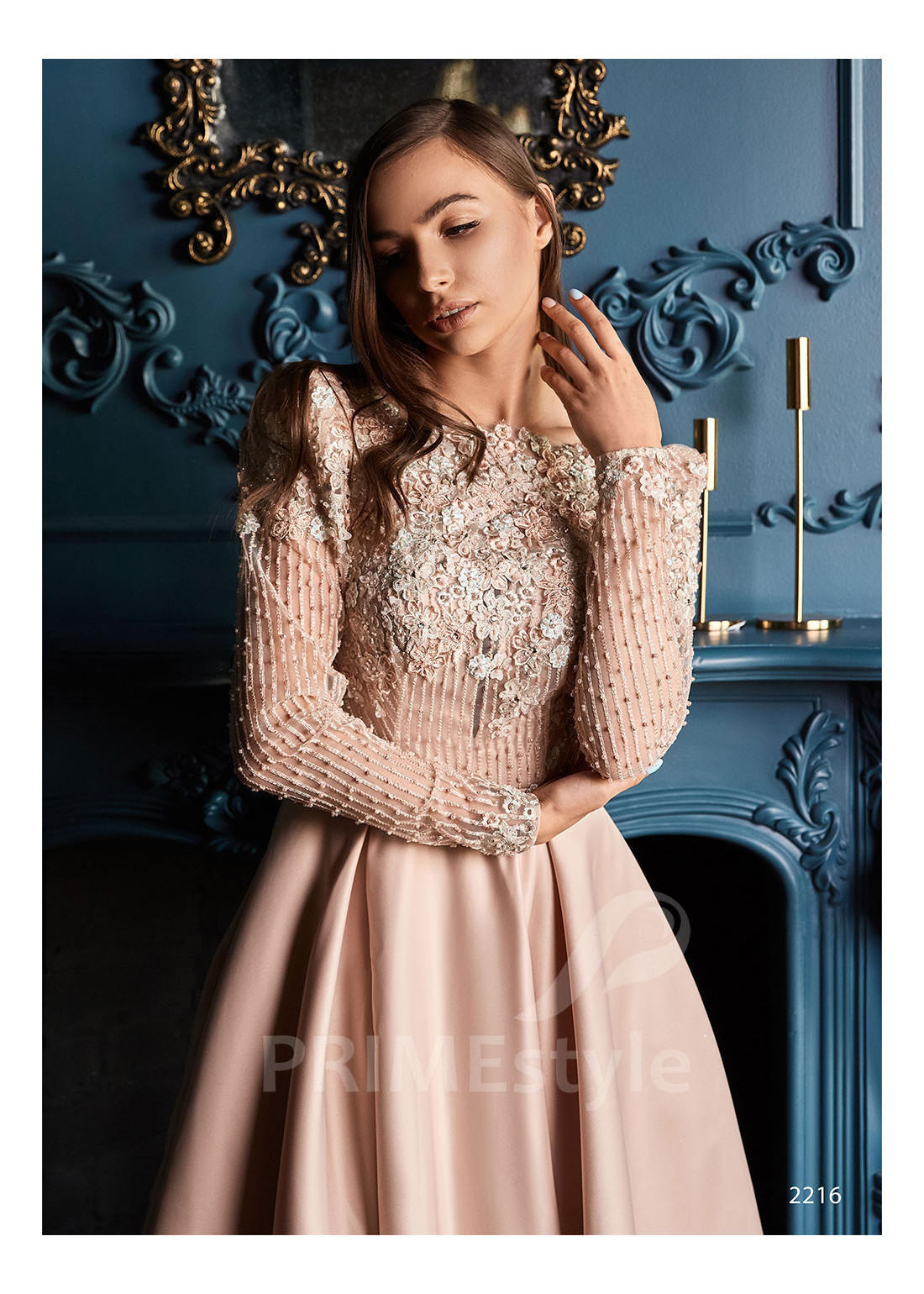 Spoločenské šaty s dlhým rukávom, lodičkovým výstrihom, zahaleným chrbtom a s objemnou padavou saténovou sukňou s rázporkom na pravej nohe. Korzet a rukávy sú zdobené bohatou vyšívanou čipkou s 3D kvetmi. Vhodné aj ako šaty na ples, šaty na stužkovú, šaty na svadbu a popolnočné šaty.