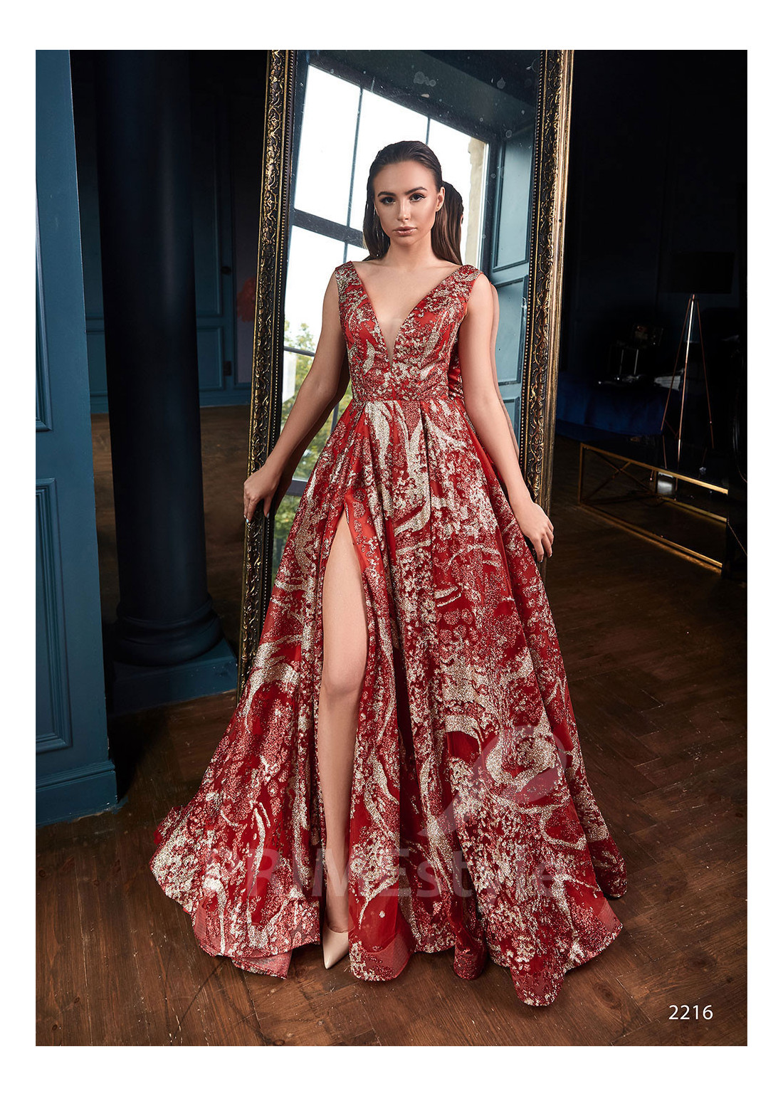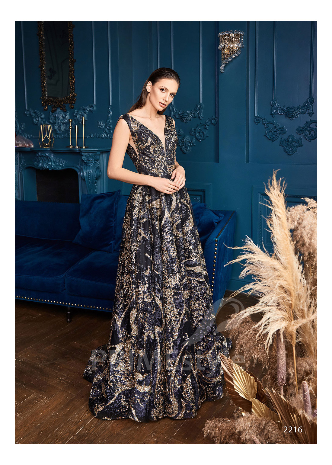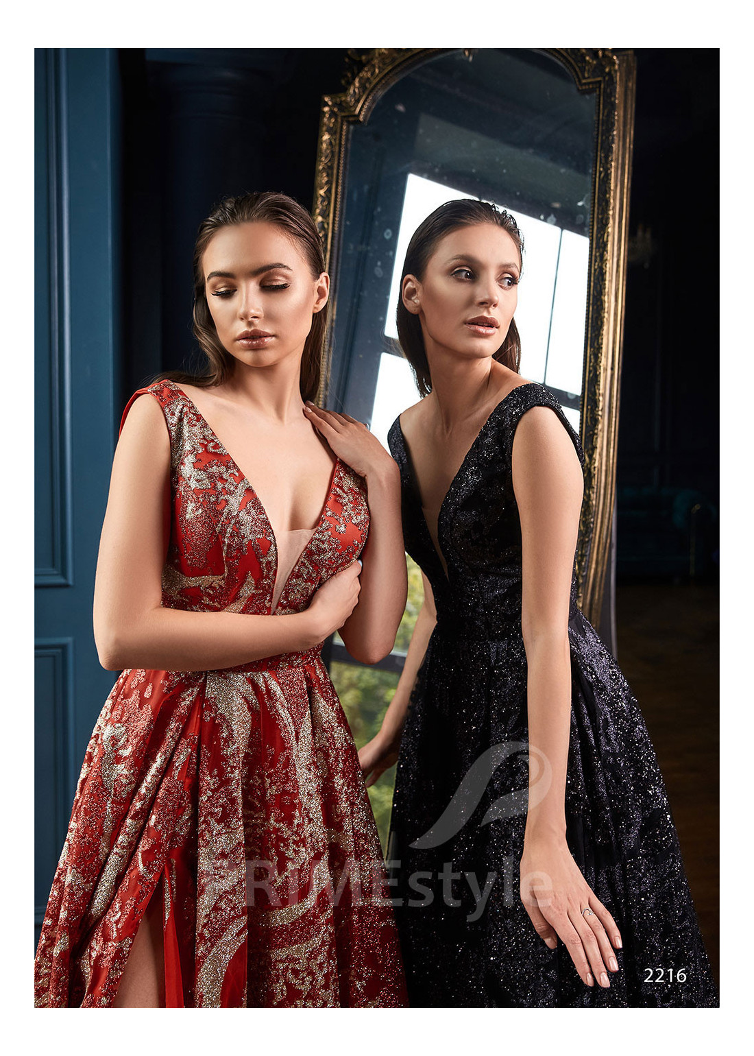 Moderné celotrblietavé spoločenské šaty s hlbokým V-výstrohom na hrudi, odhaleným chrbtom a s padavou sukňou s rázporkom na pravej nohe. Vhodné aj ako šaty na ples a popolnočné šaty.
