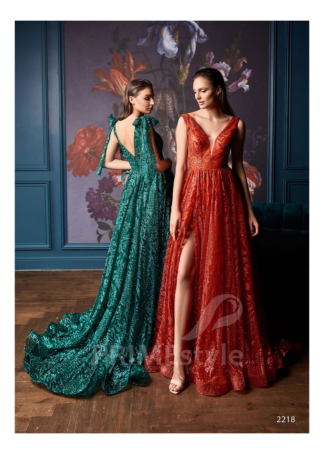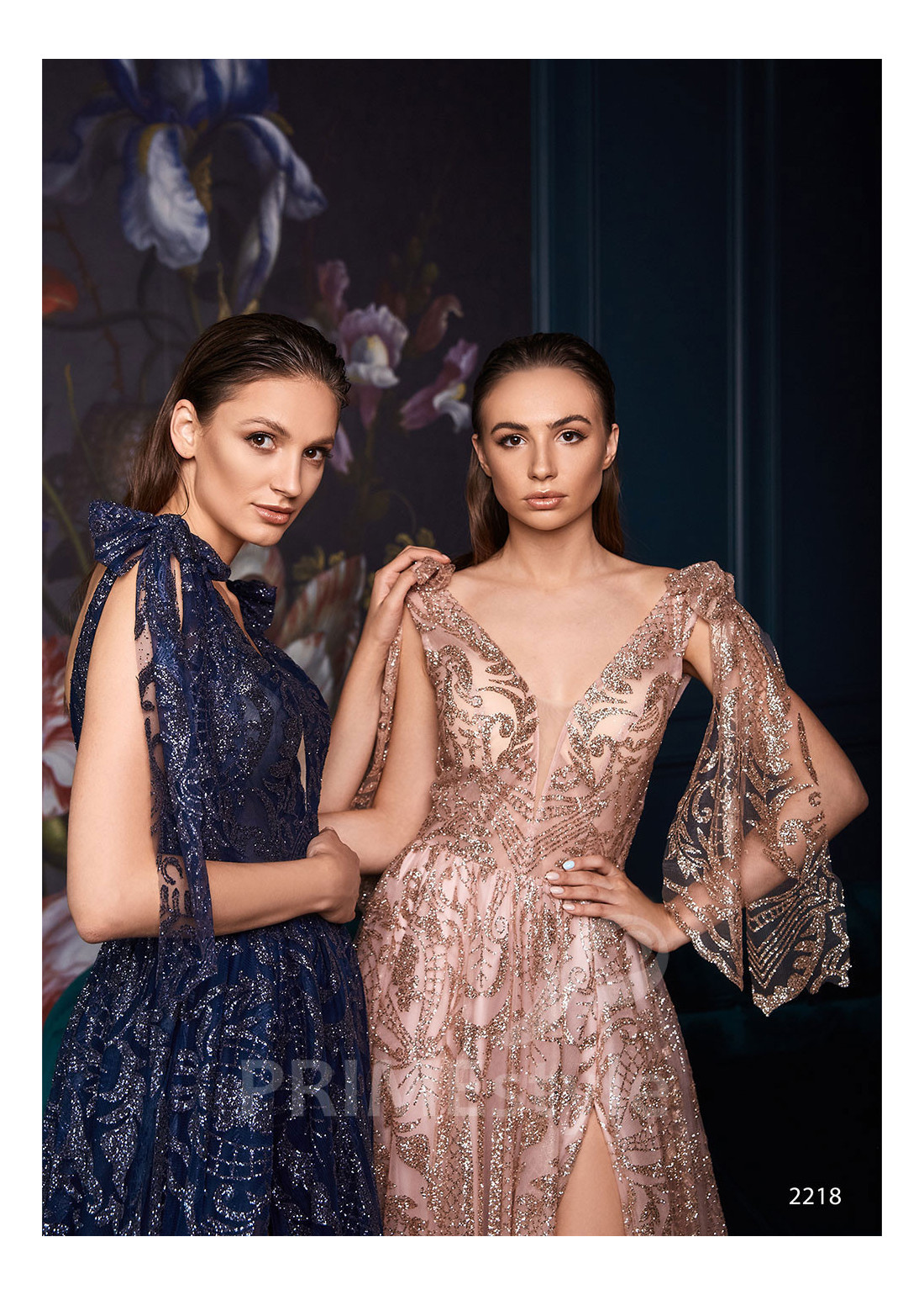 Luxusné celotrblieravé spoločenské šaty s otvoreným dekoltom, hlbokým V-výstrihom na hrudi, odhaleným chrbtom a efektnou pekne tvarovanou sukňou s rázporkom. Vhodné ako šaty na ples, šaty na stužkovú a popolnočné šaty.